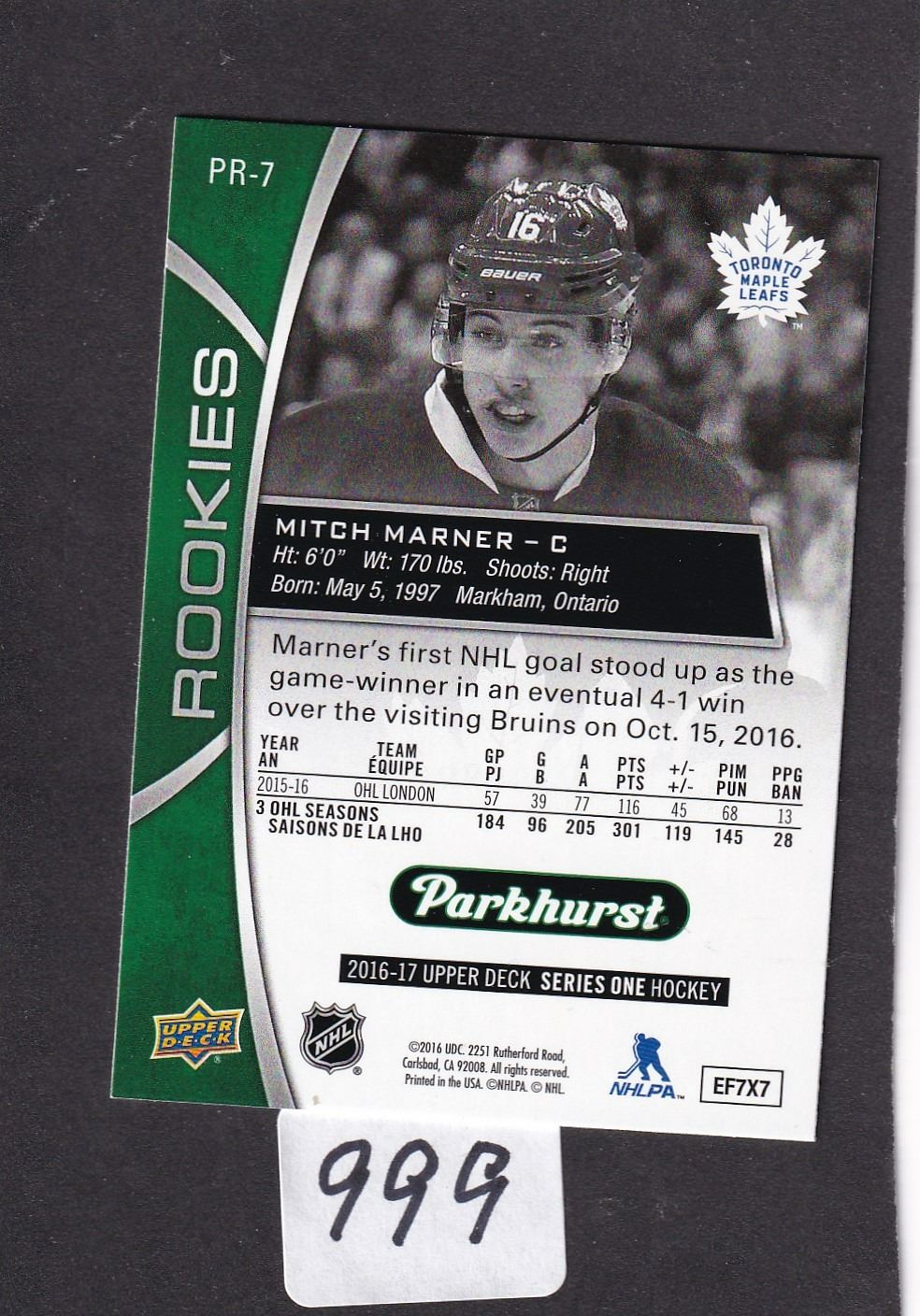 2016/17 Mitch Marner Parkhurst Rookie Card