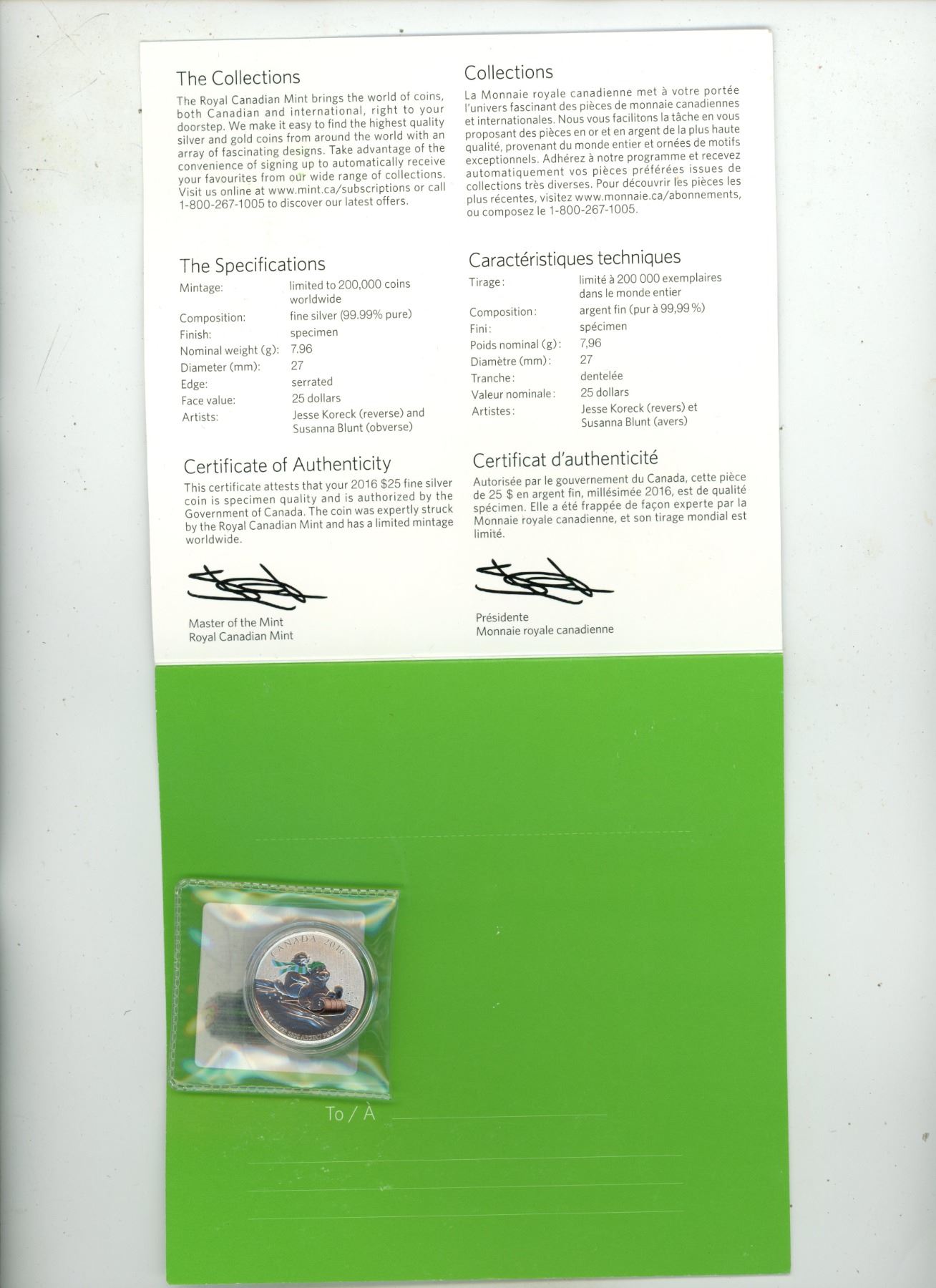 2016 Canada $25 Fine Silver Coin - Winter Fun.