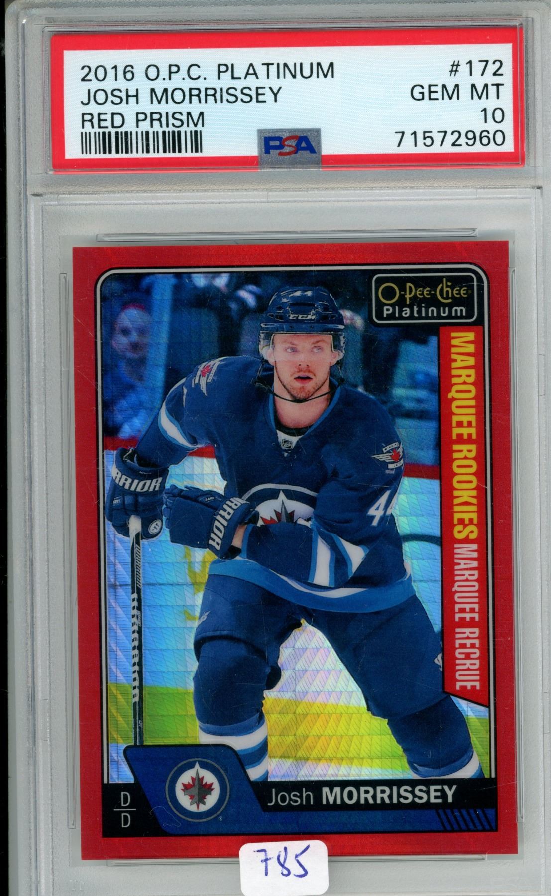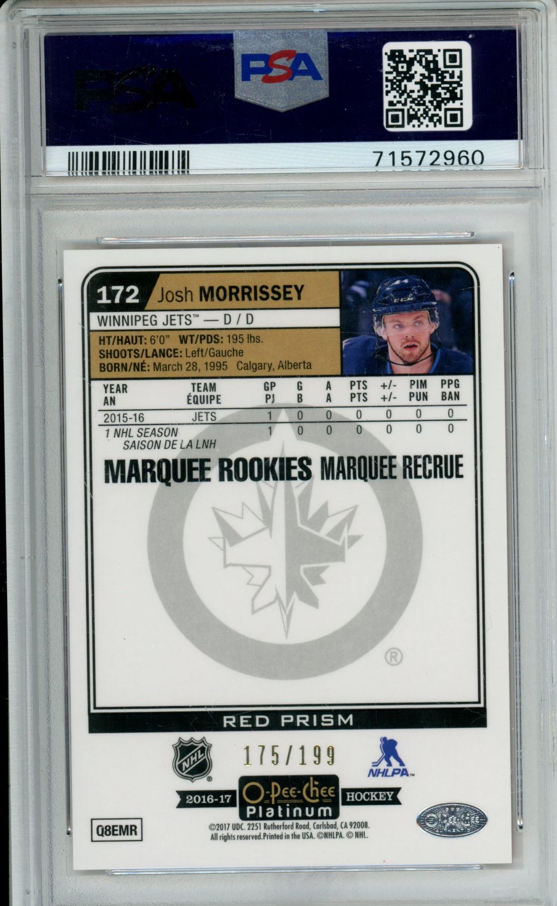 2016 O.P.C. Platinum Josh Morrissey Marquee Recrue Rookie Red Prizm #175 of 199 PSA 10
