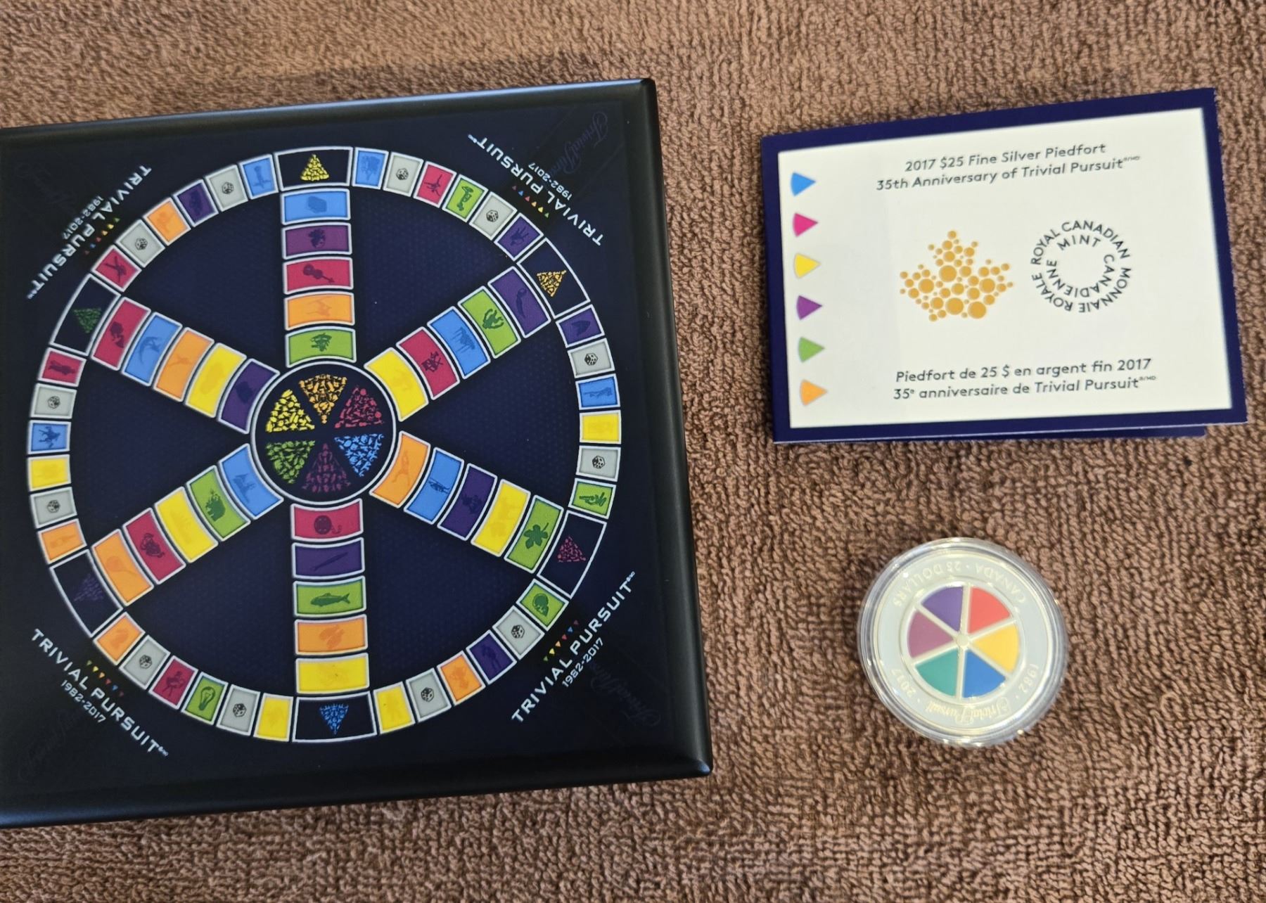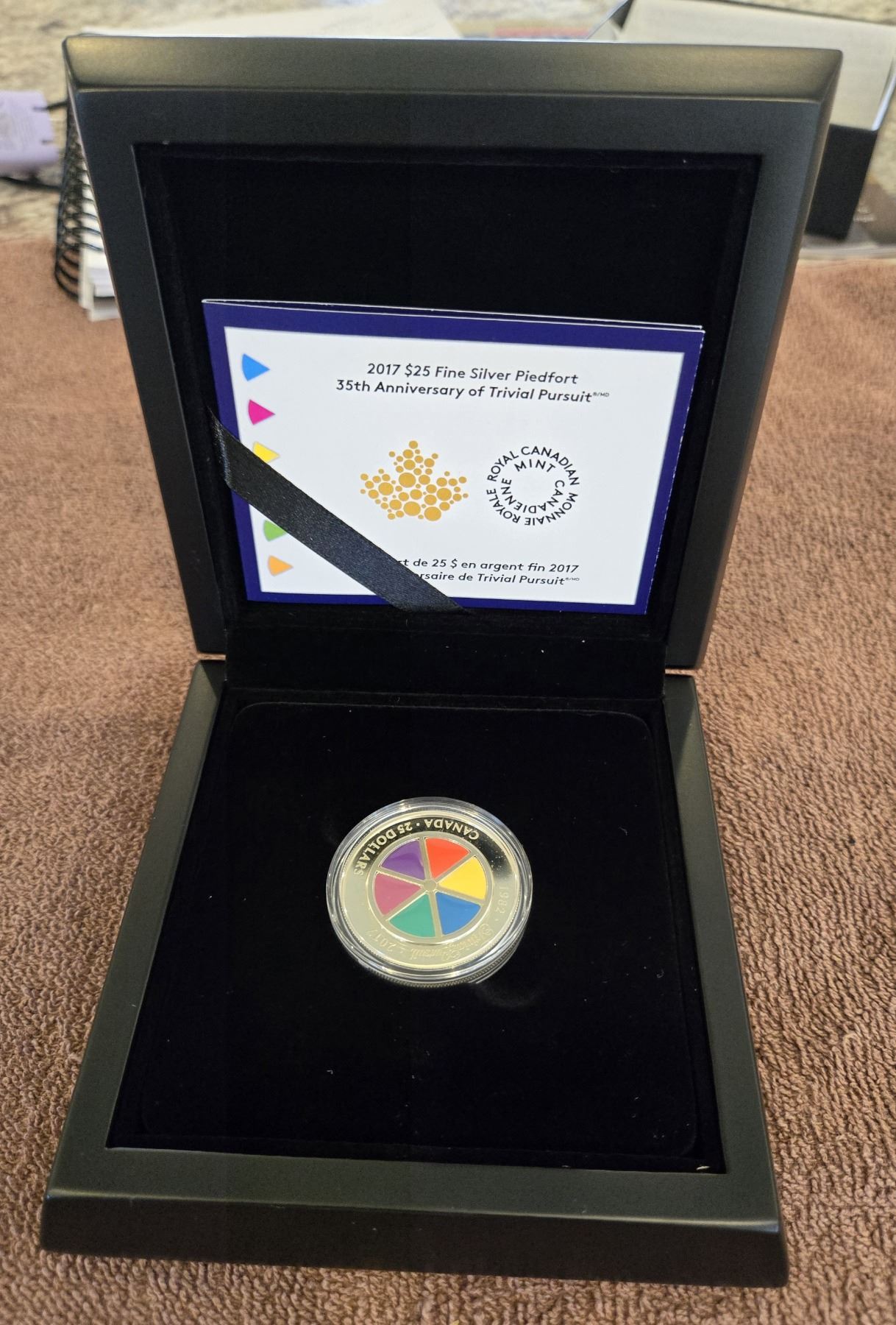 2017 $25 fine silver coin, Piedfort 35th Anniversary of the Trivial Pursuit game. 99.99% pure silver. In a premium wooden case that mimics a Trivial Pursuit board and box. Low mintage.