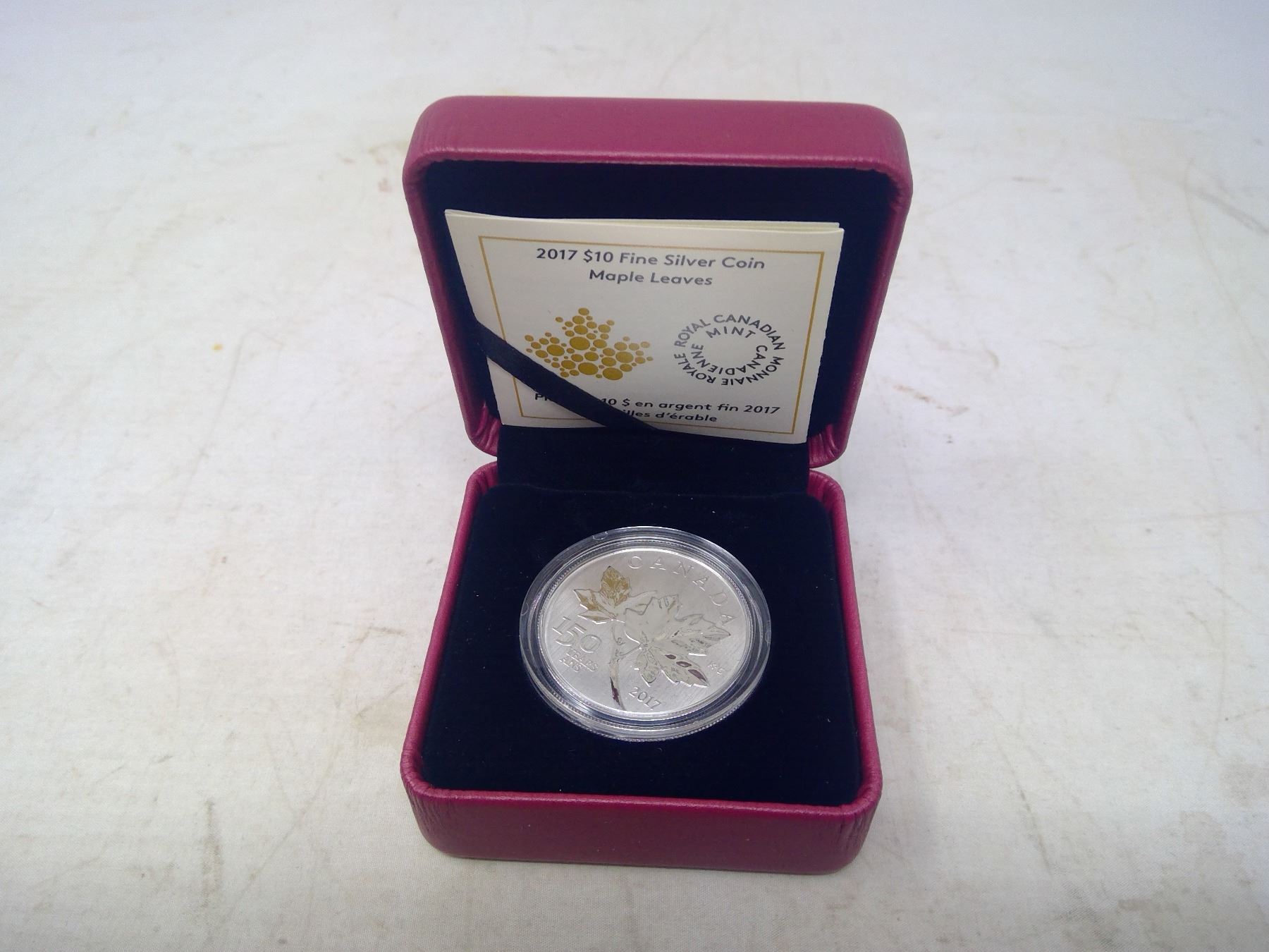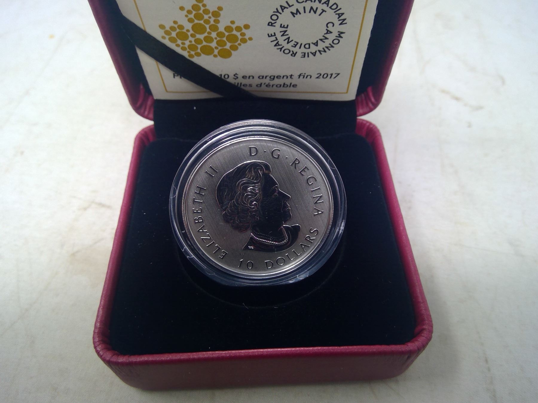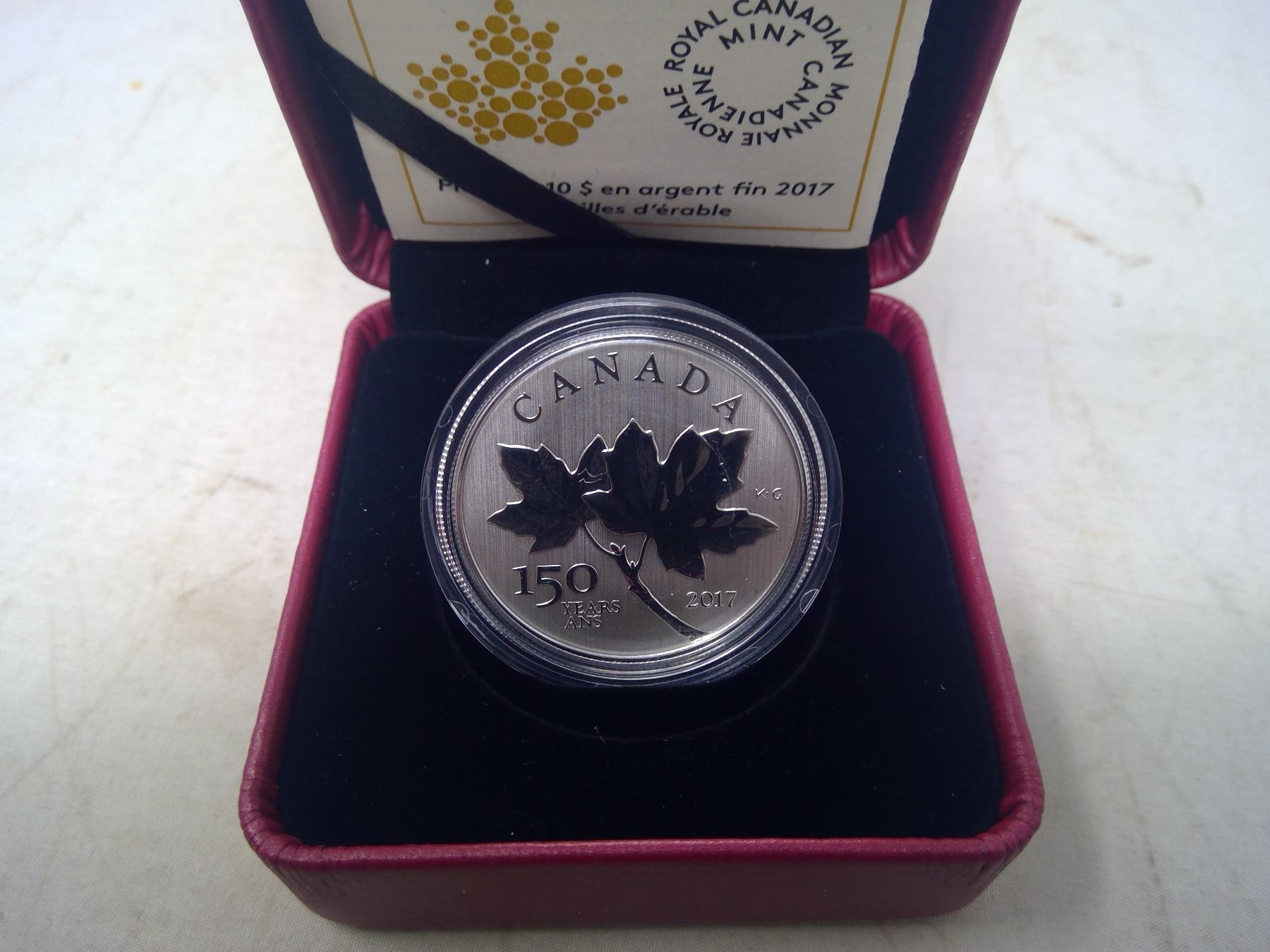 2017 Maple Leaves $10 commemorates the 150th Anniversary of Canadian Confederation. Coin depicts an enlarged version of the Canadian small cent issued from 1937 to 2012. .9999 pure silver. In case and box of issue. Nice.