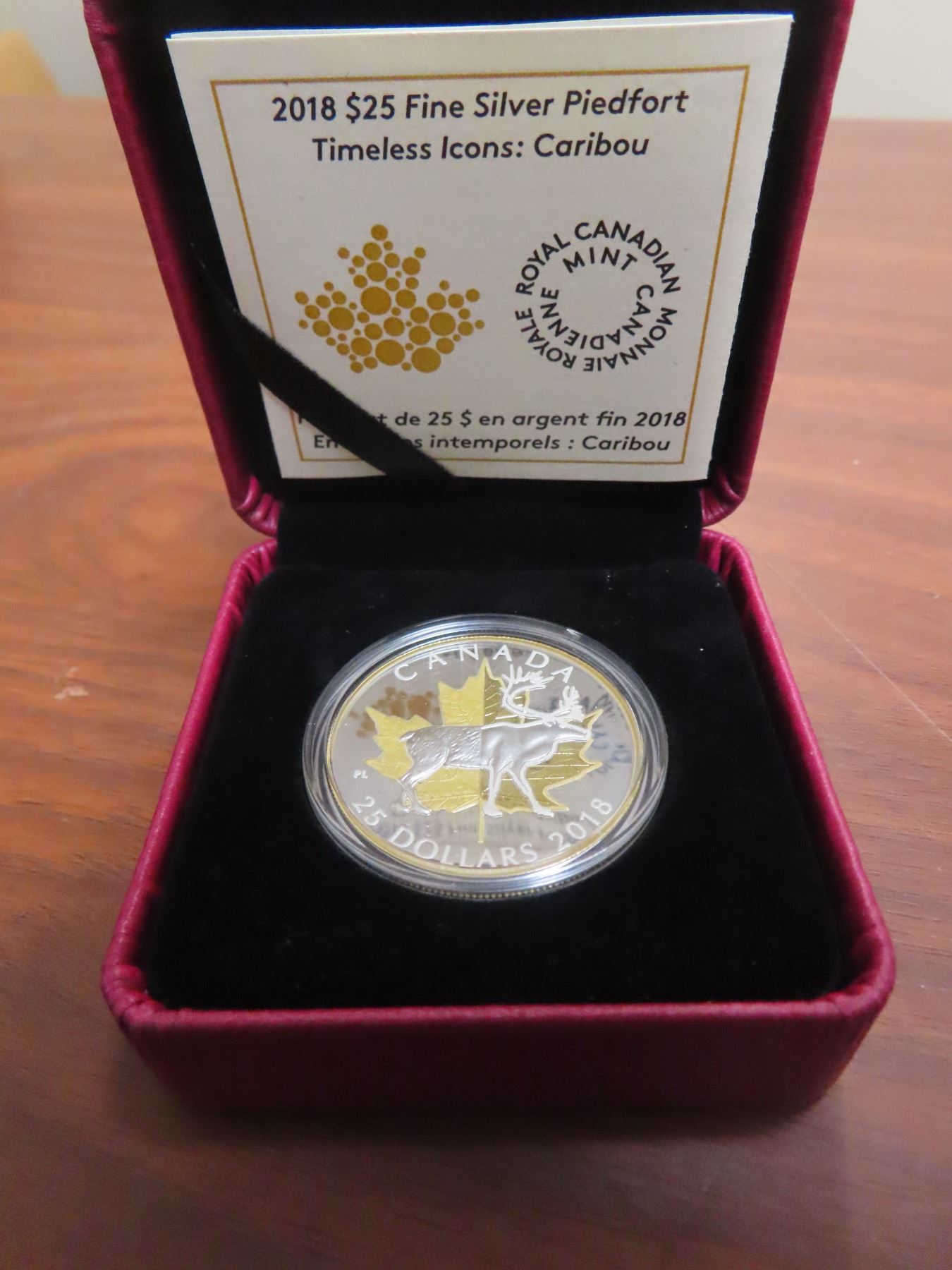 2018 Piedfort Timeless Icons: Caribou $25. This double-thick coin is 99.99% pure Silver with gold plating on the maple leaf behind the caribou. Proof with Ultra Heavy Cameo. Housed in its original Royal Canadian Mint case & box of issue. Includes Certificate of Authenticity. Scarce.