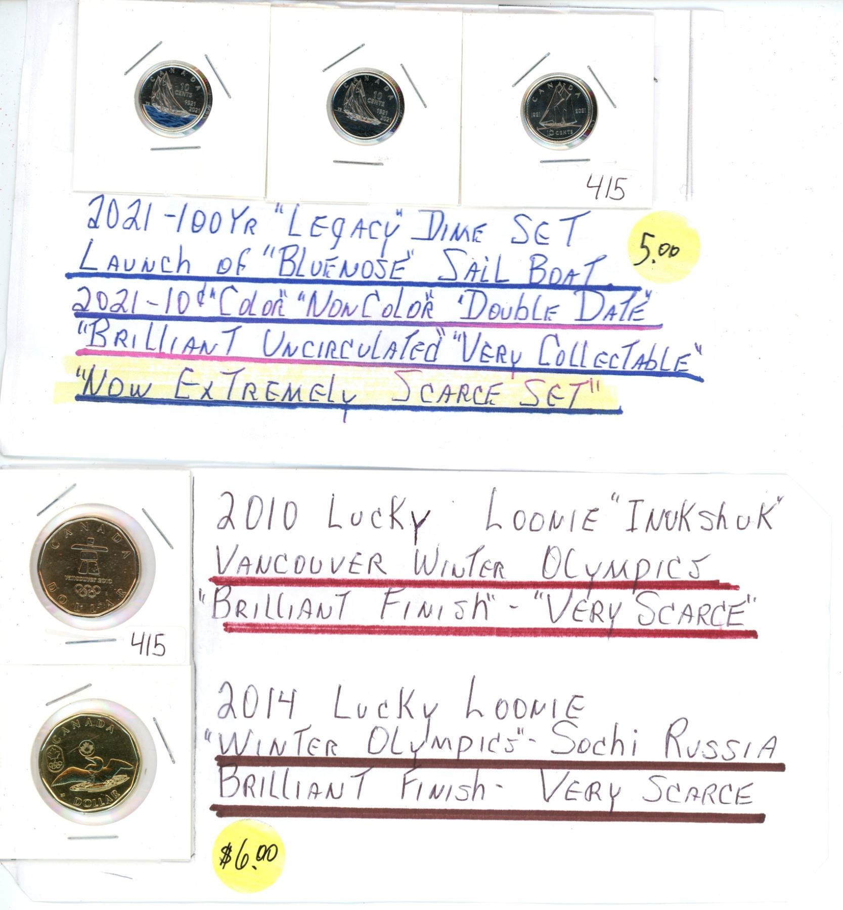 2021 Bluenose sail boat dime set & 2 Loonies - 2010 Vancover winter olympics & 2014 Russian Winter Olympics Loonie