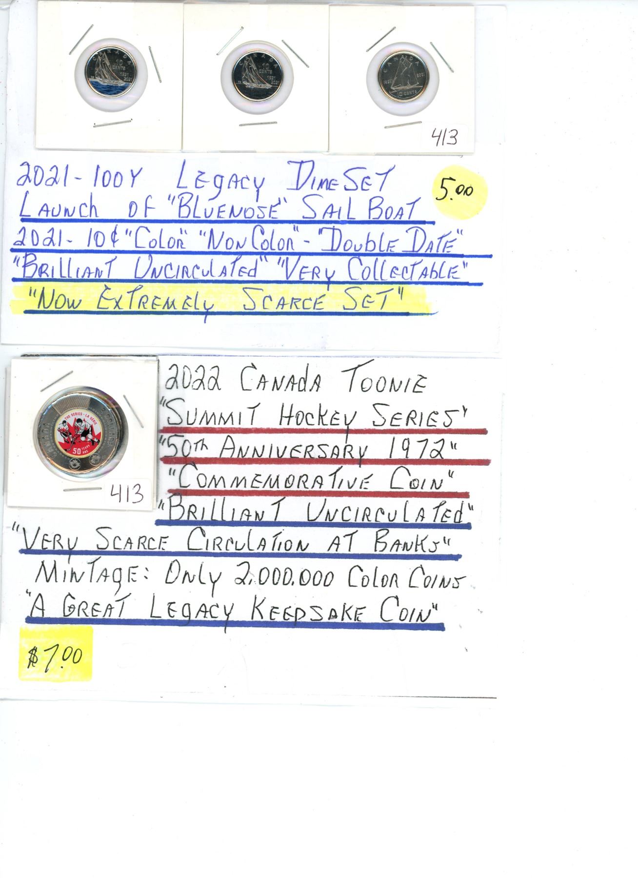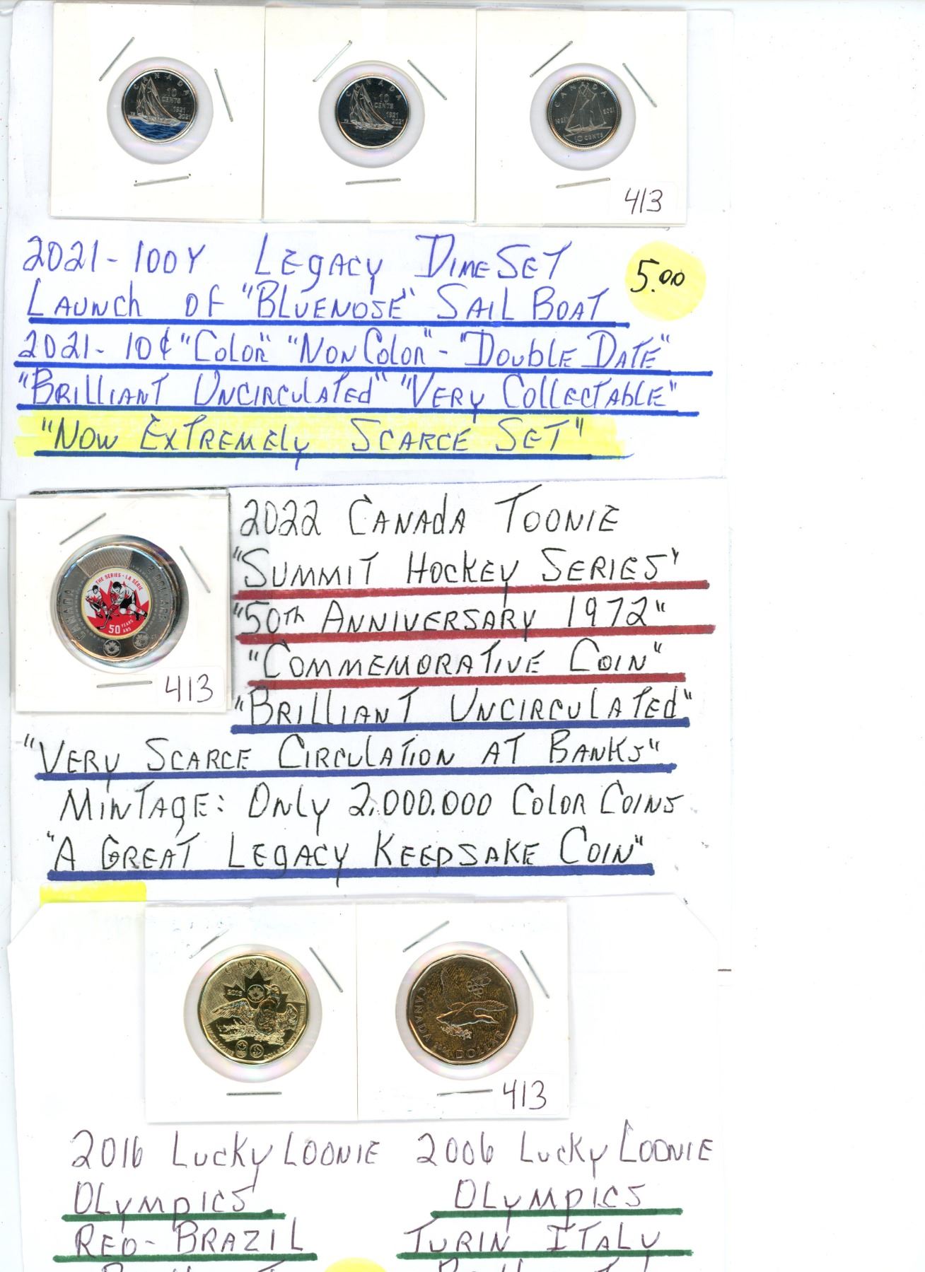 2021 Bluenose sail boat dime set & 2022 Summit Hockey series, colored Toonie & 2 Loonies - 2016 Brazil Olympics and 2006 Italy Olypmics Loonies