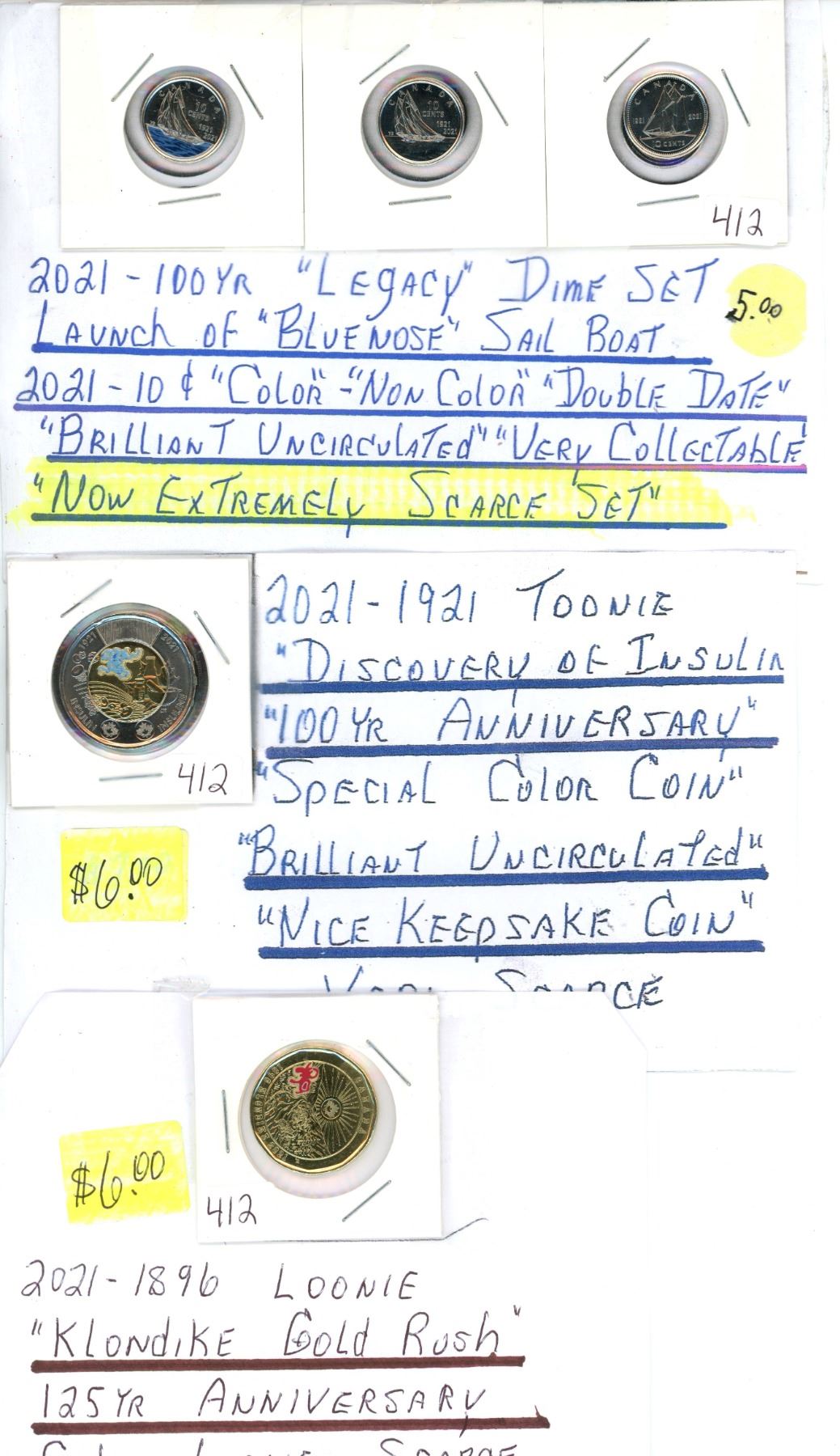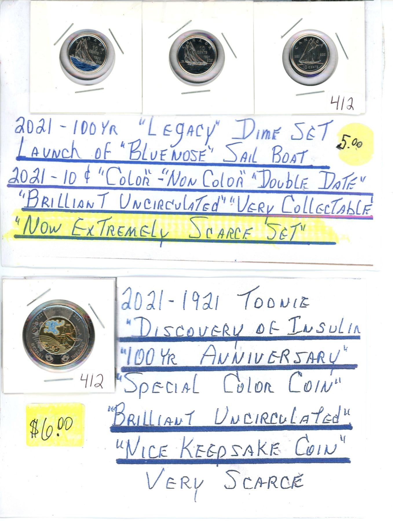 2021 Bluenose sail boat dime set & Discovery of Insulin Toonie & Klondike gold rush Loonie