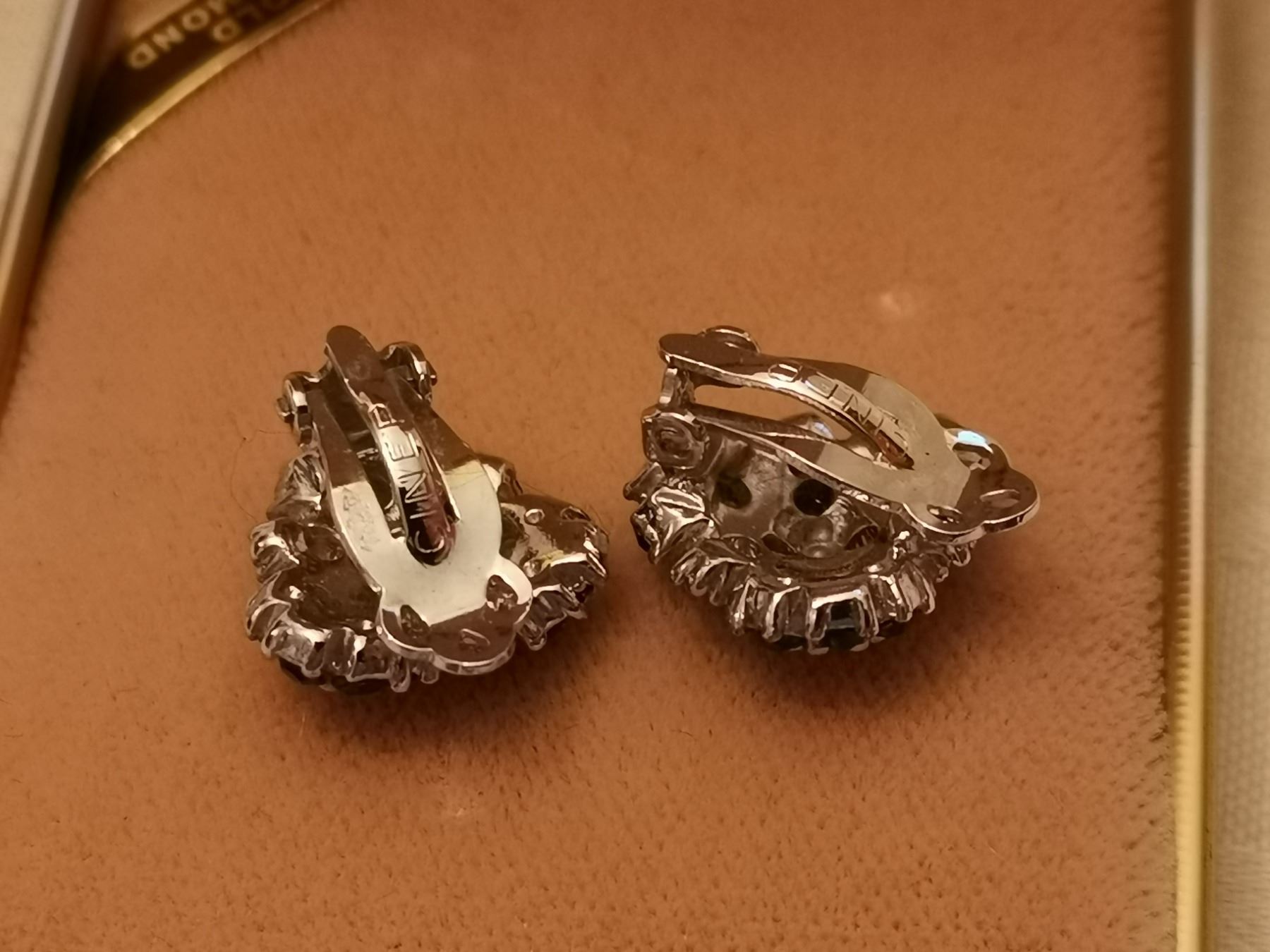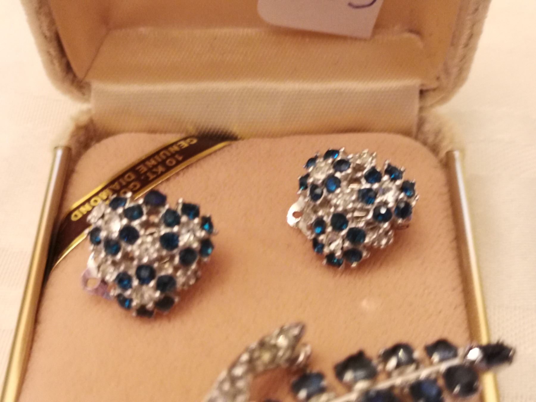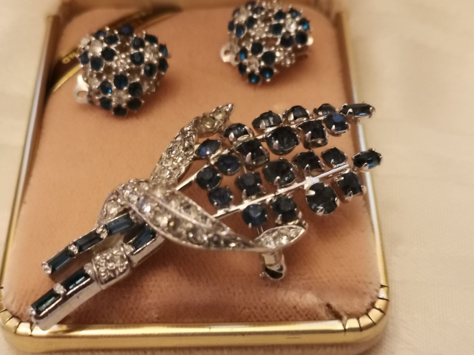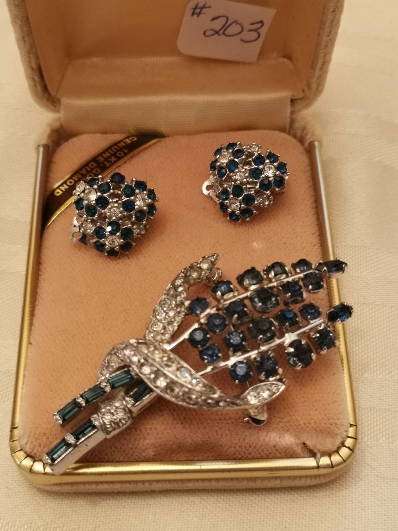 203. Blue and clear rhinestone broach and clip earrings marked “Ciner”