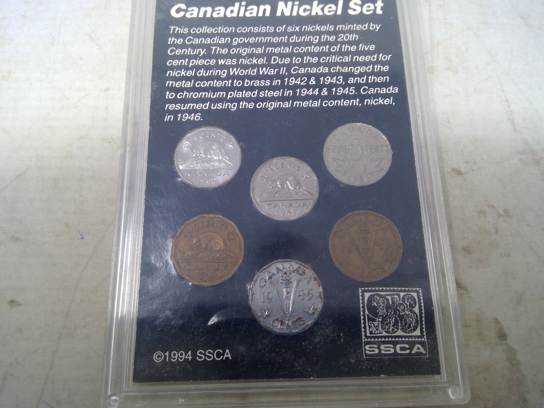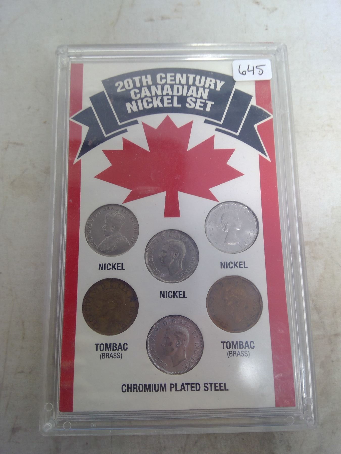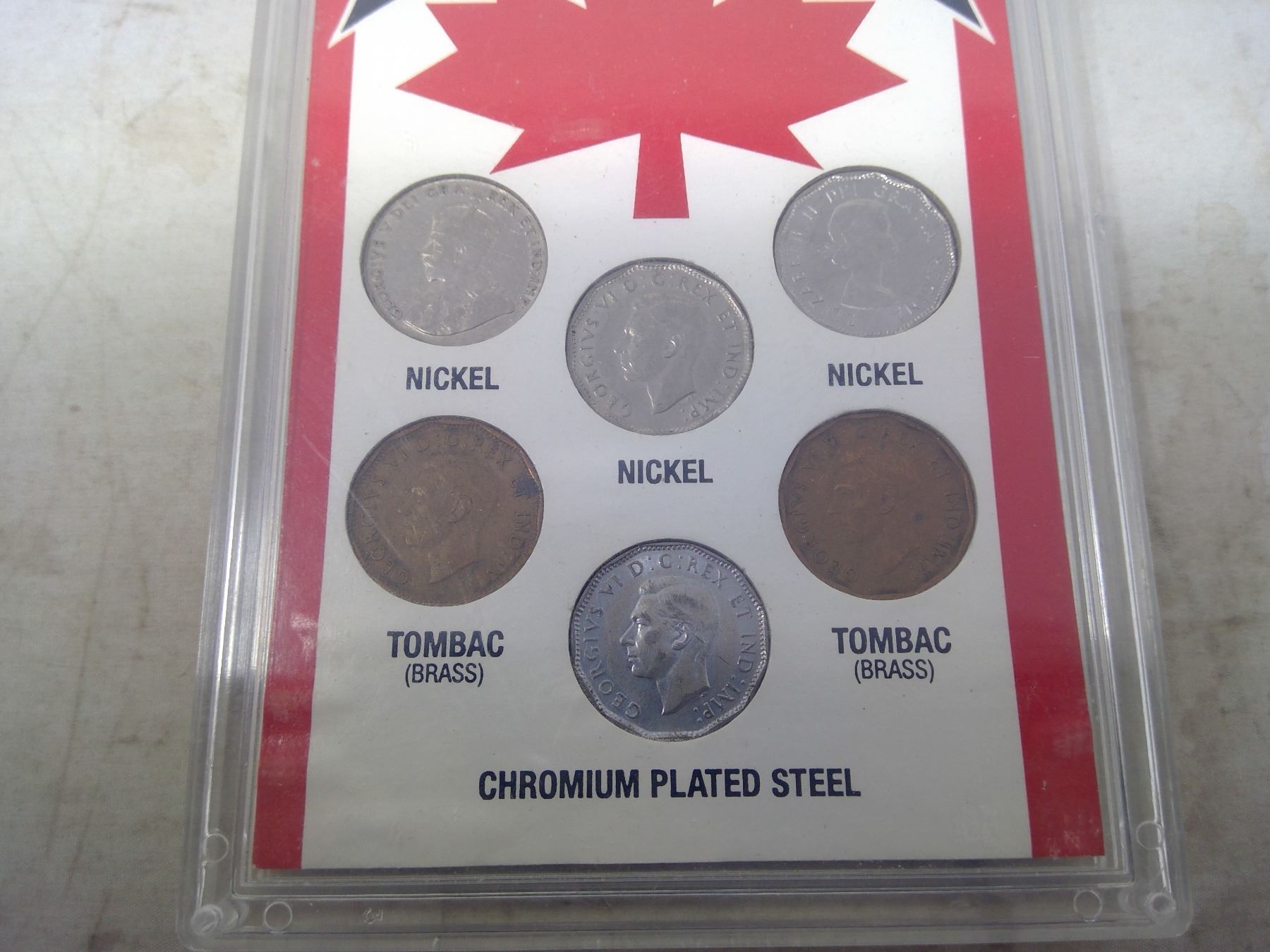 20th Century Canadian Nickel Set of 6 Canadian 5 cents from 3 different monarchs with three issued during World War II (includes 2 Tombacs). Housed in a hard plastic holder.