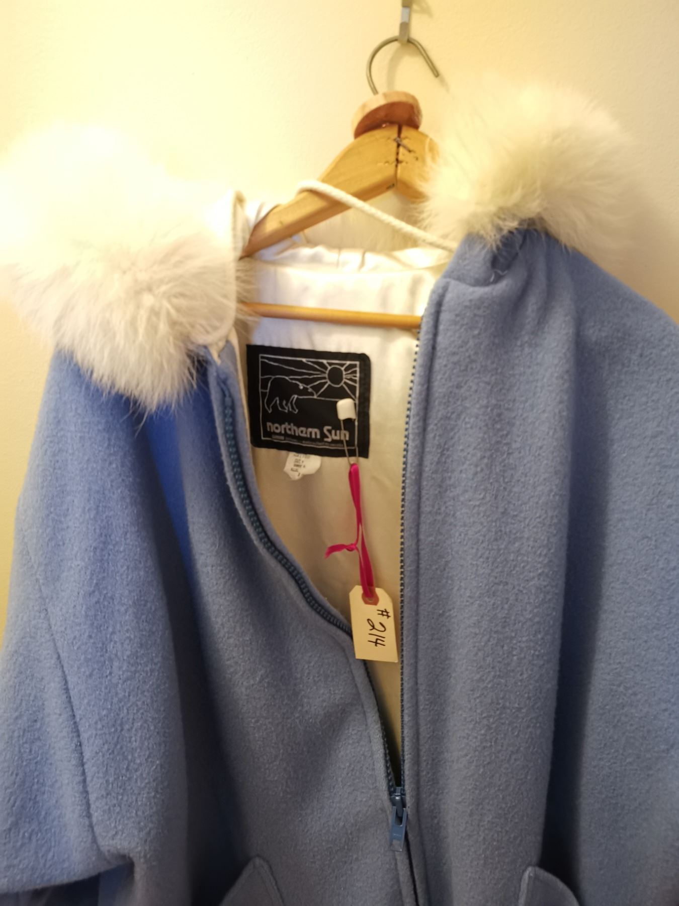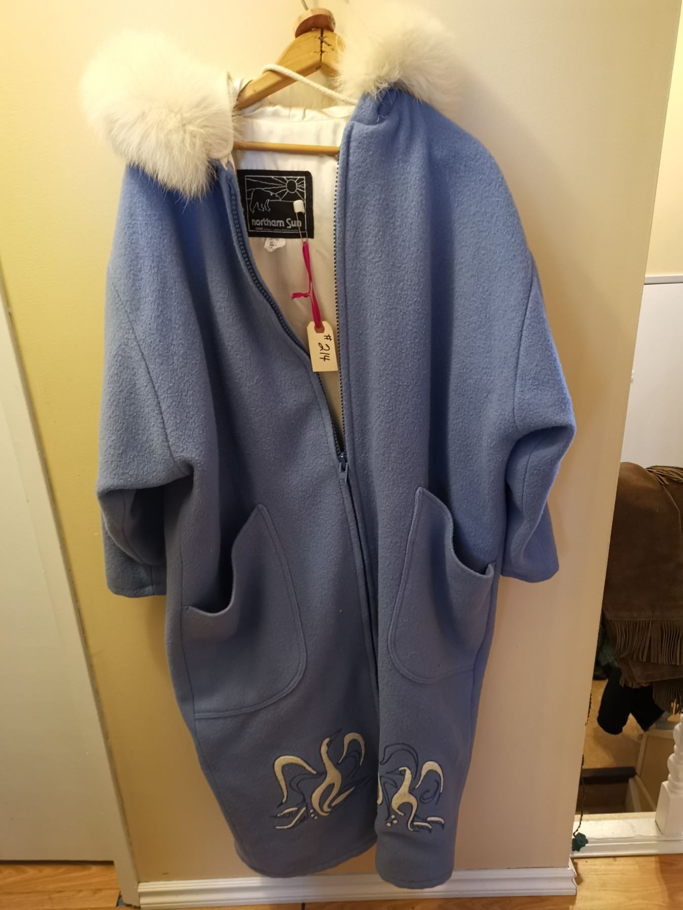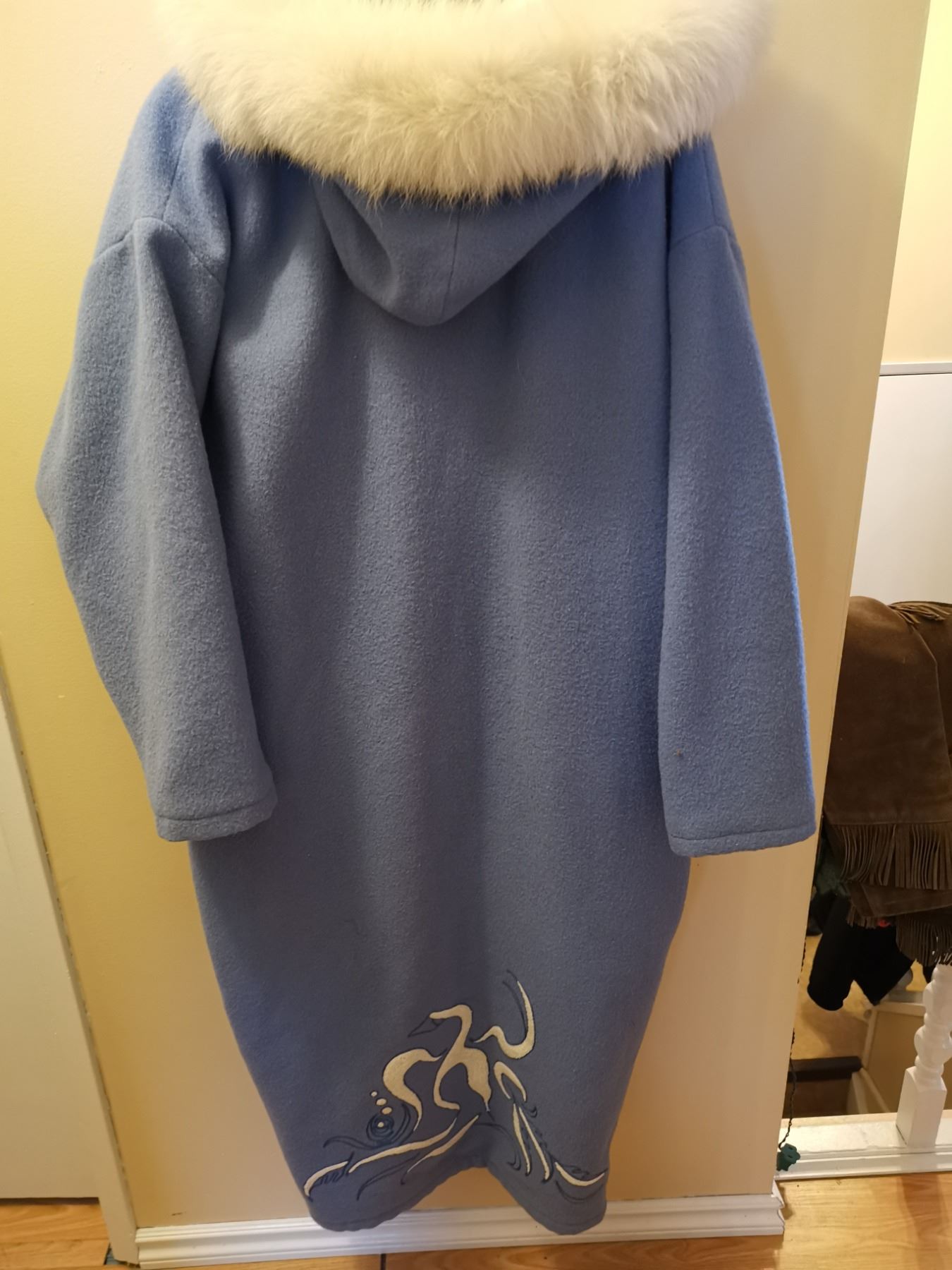 214. Northern Sun blue wool coat, embroidered geese, fur trim, size 14