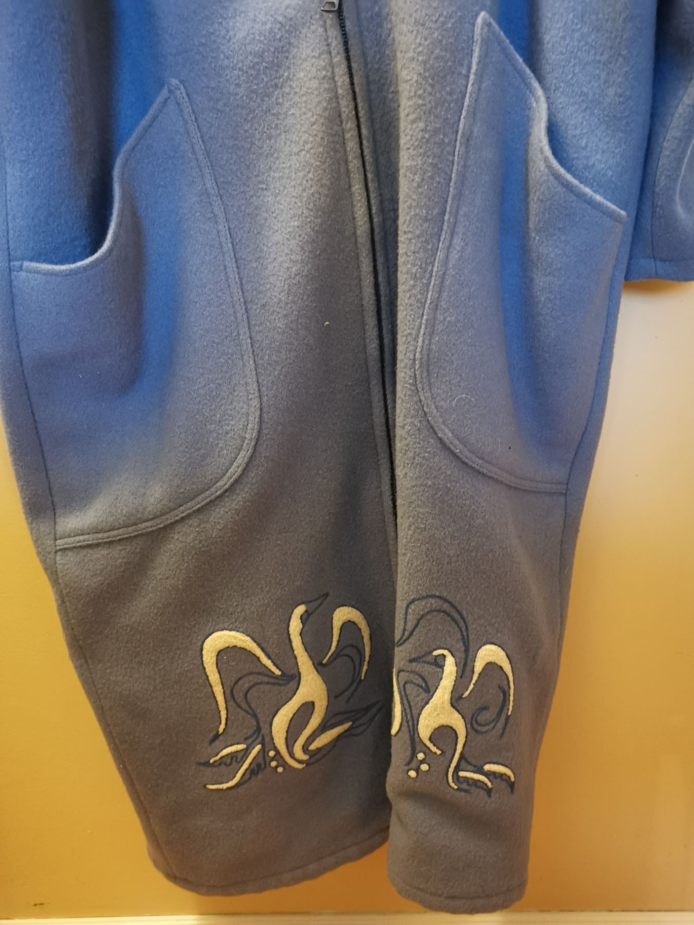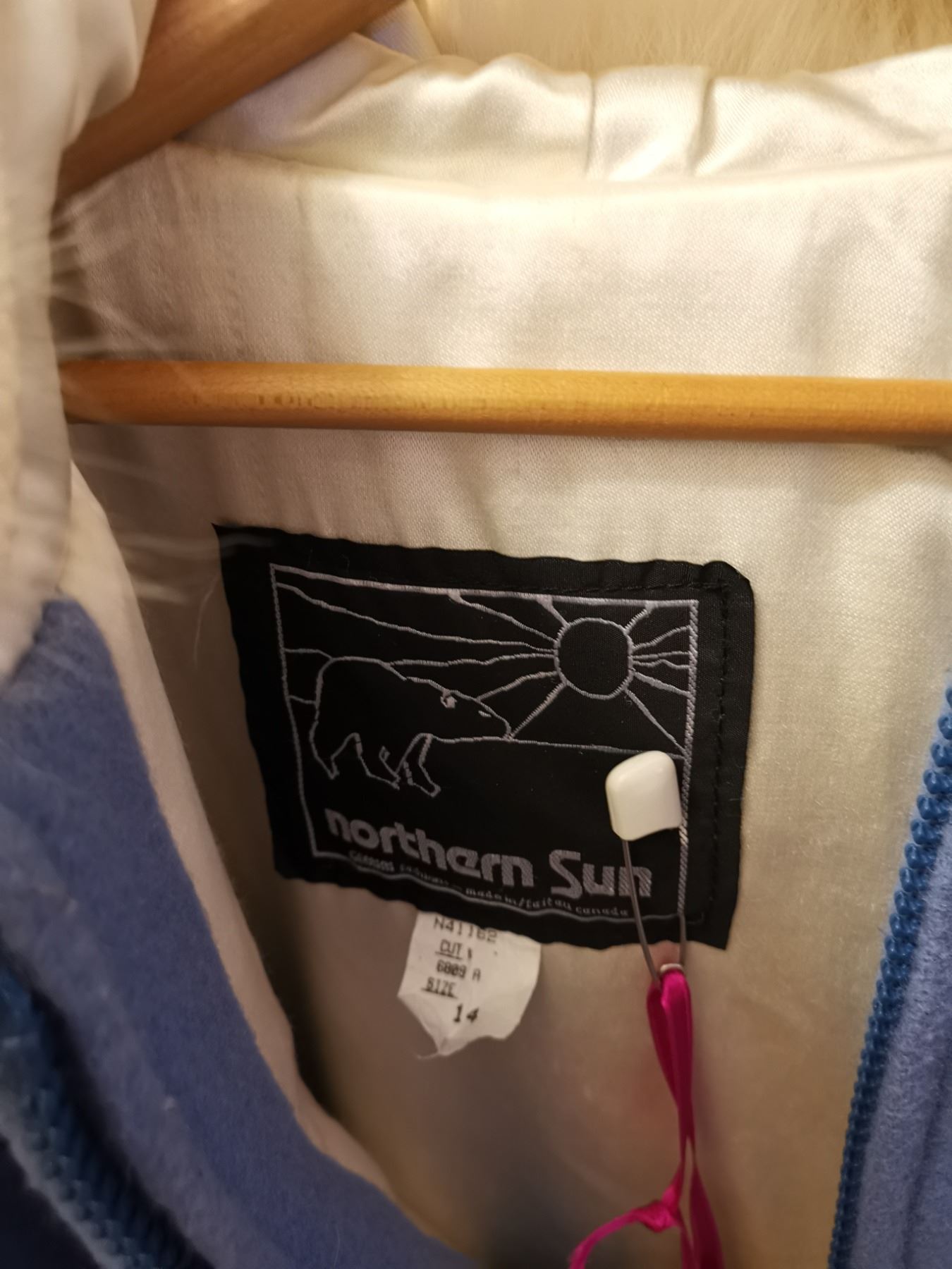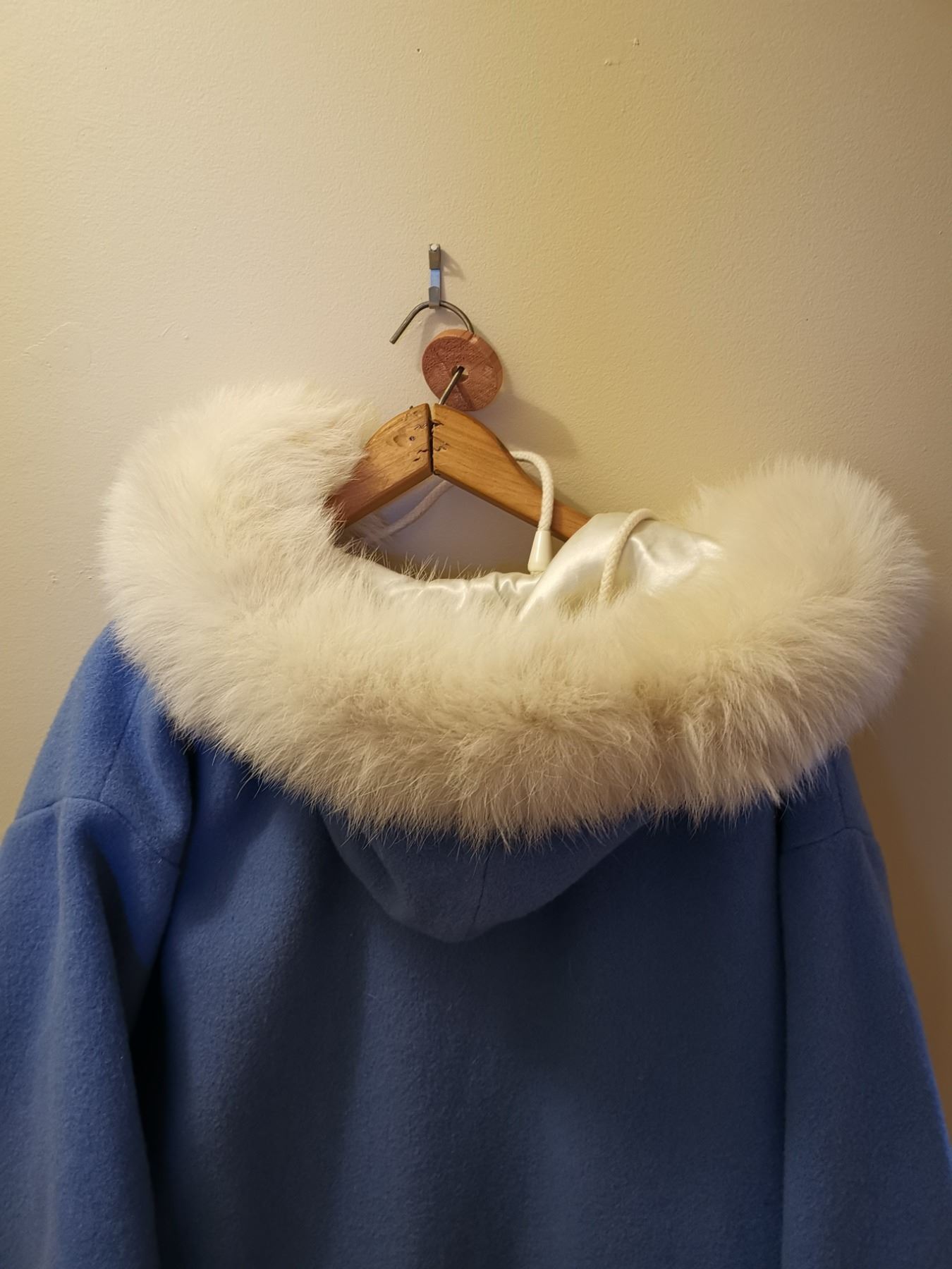 214. Northern Sun blue wool coat, embroidered geese, fur trim, size 14