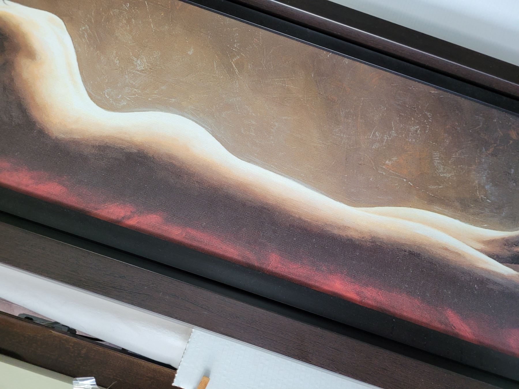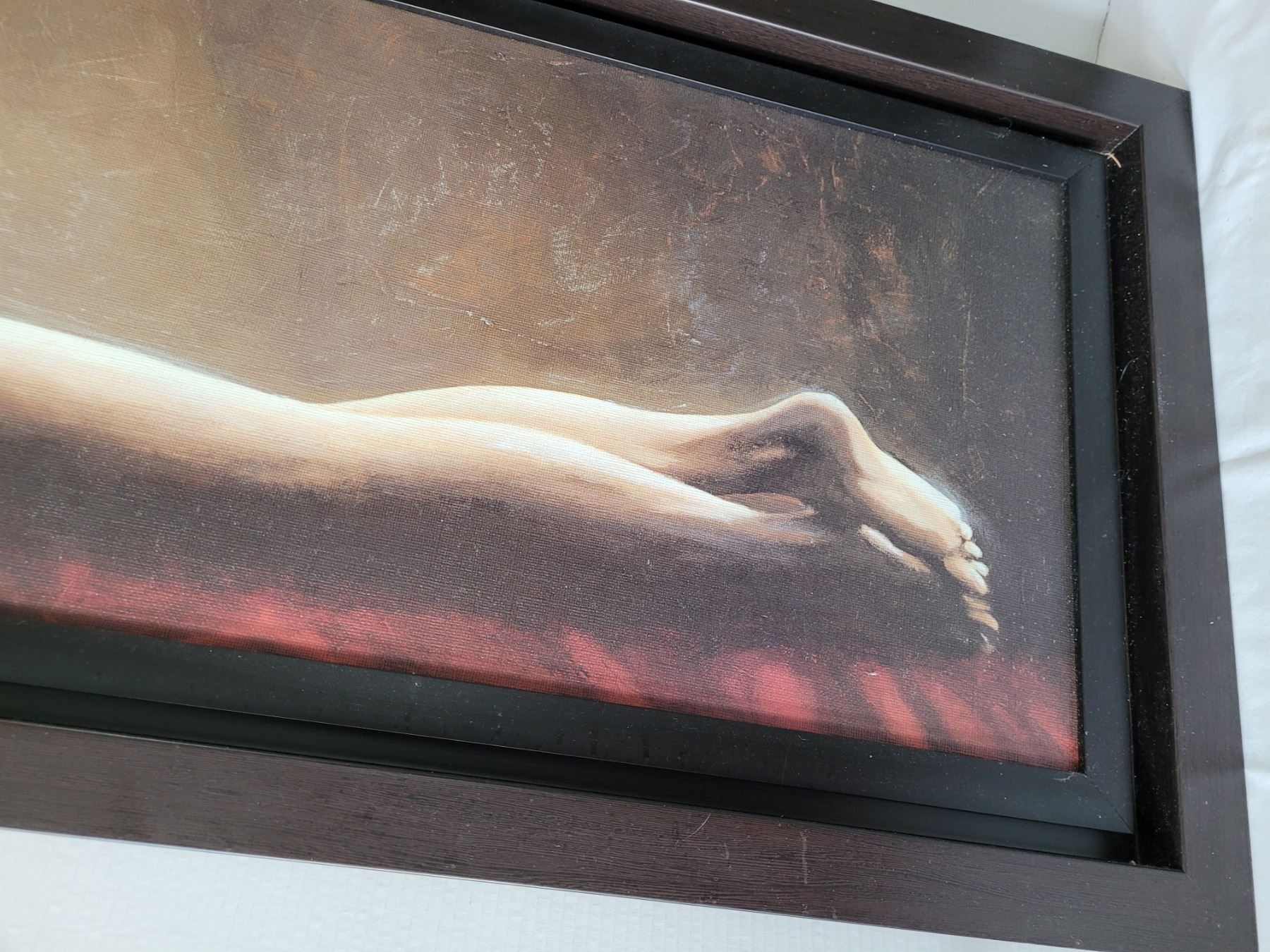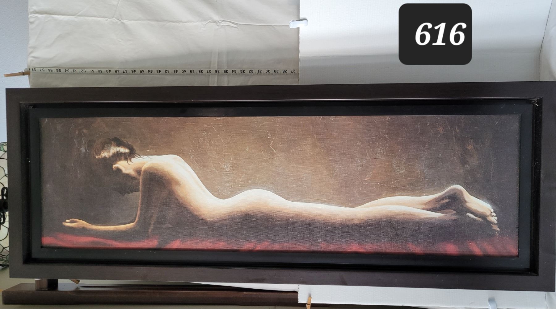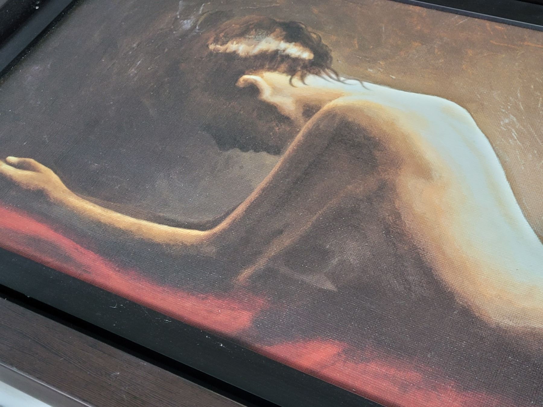 22” X 61” framed Giorgio Mariani canvas of a nude resting woman. Italy