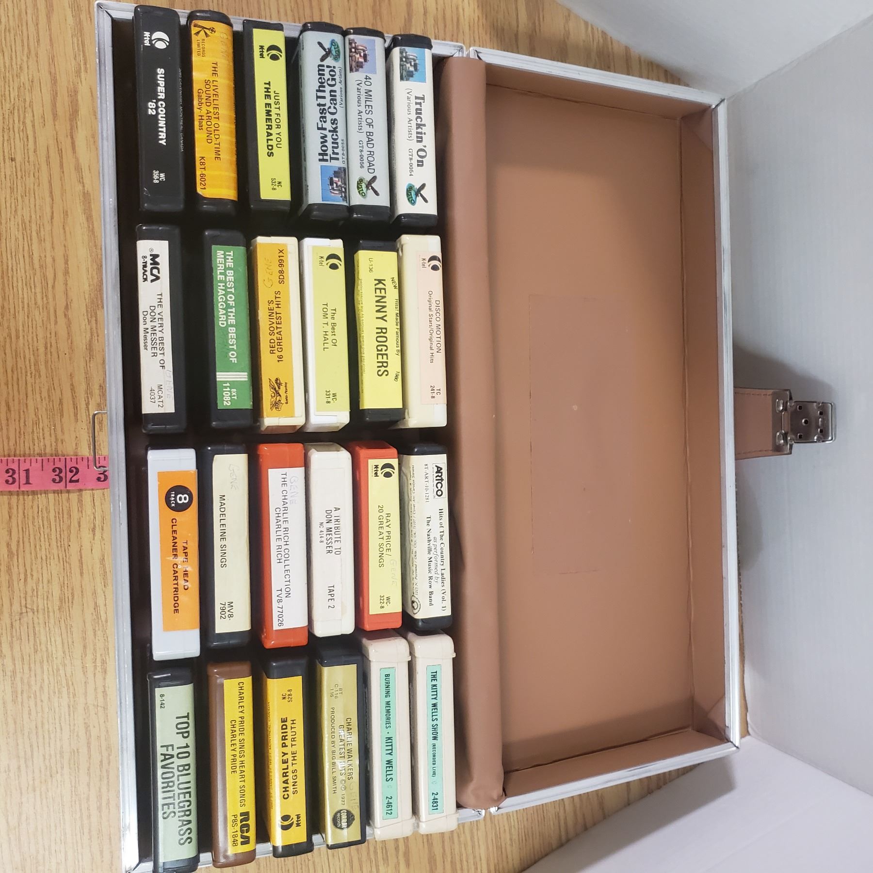 24 eight track tapes with carrying case. country blue grass Kenny Rogers Merle Haggard and head cleaner