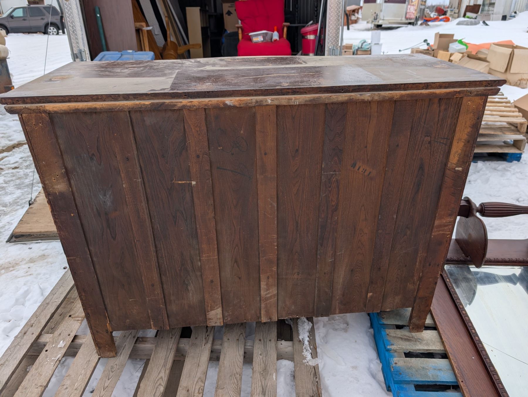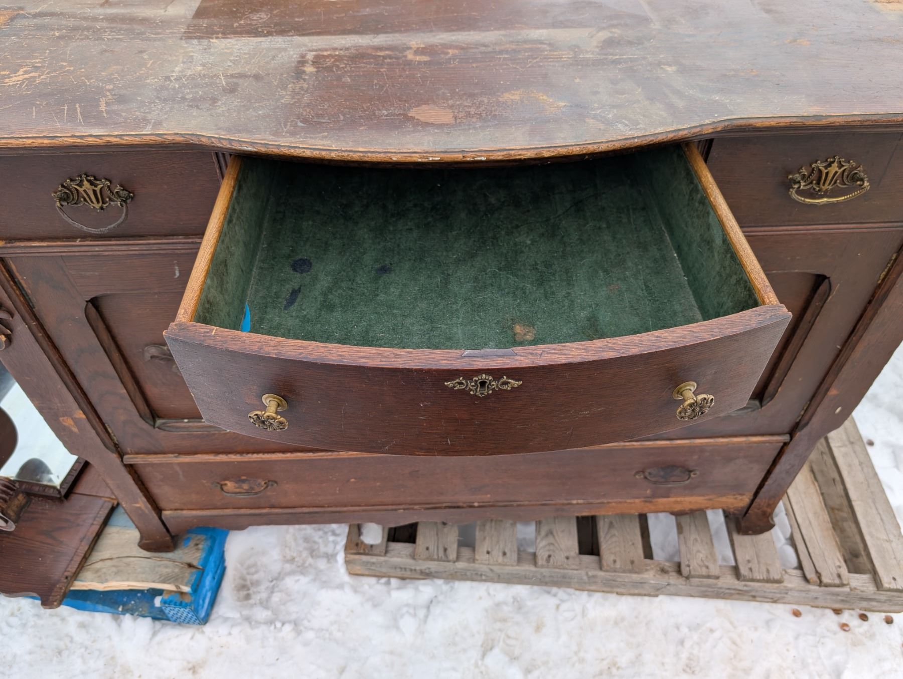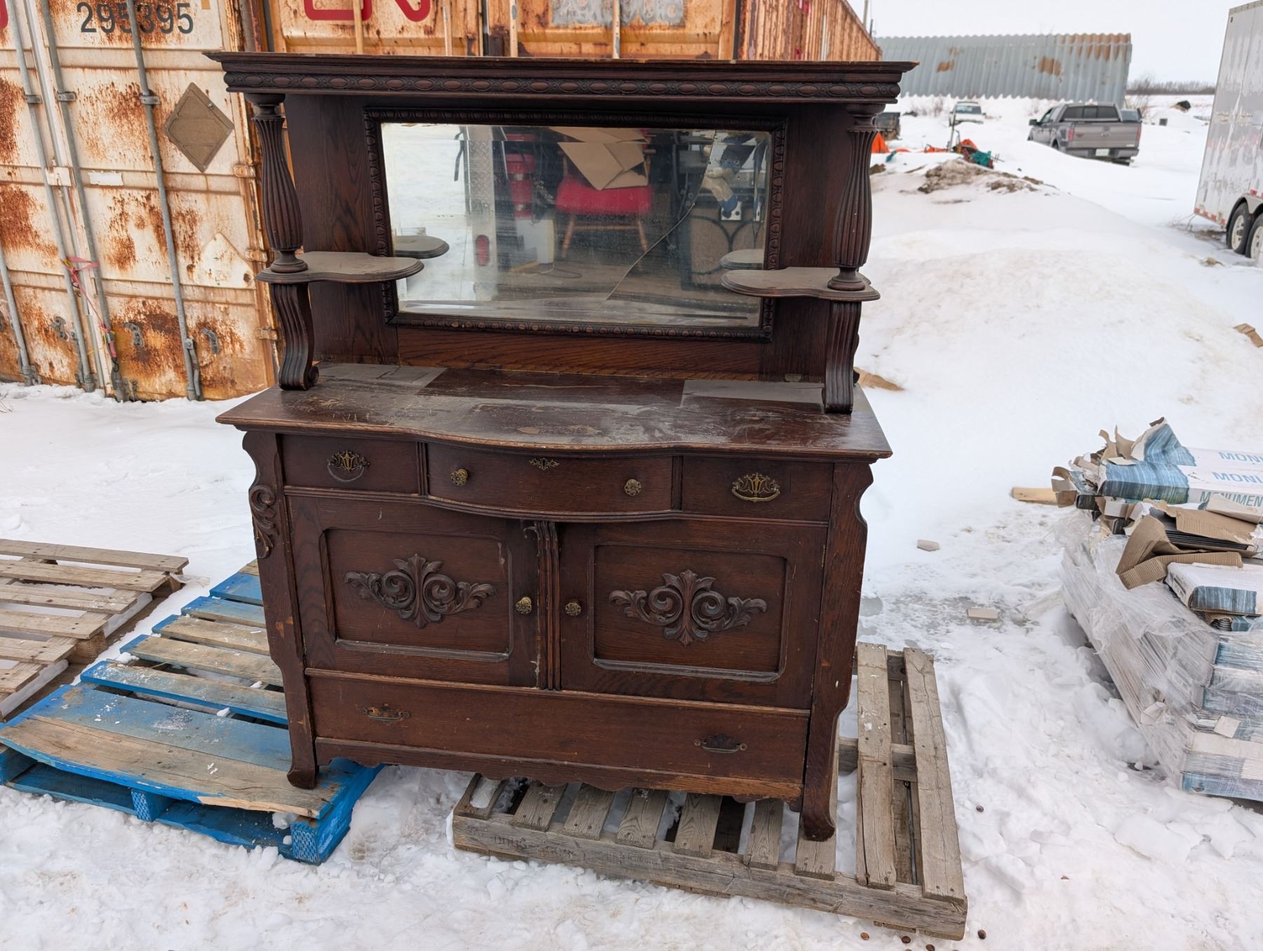 24"x55"x39" /53"x28"x13" Vintage Wood Dresser w/ Mirror Unique Designed Handles and Wood Carved Parts