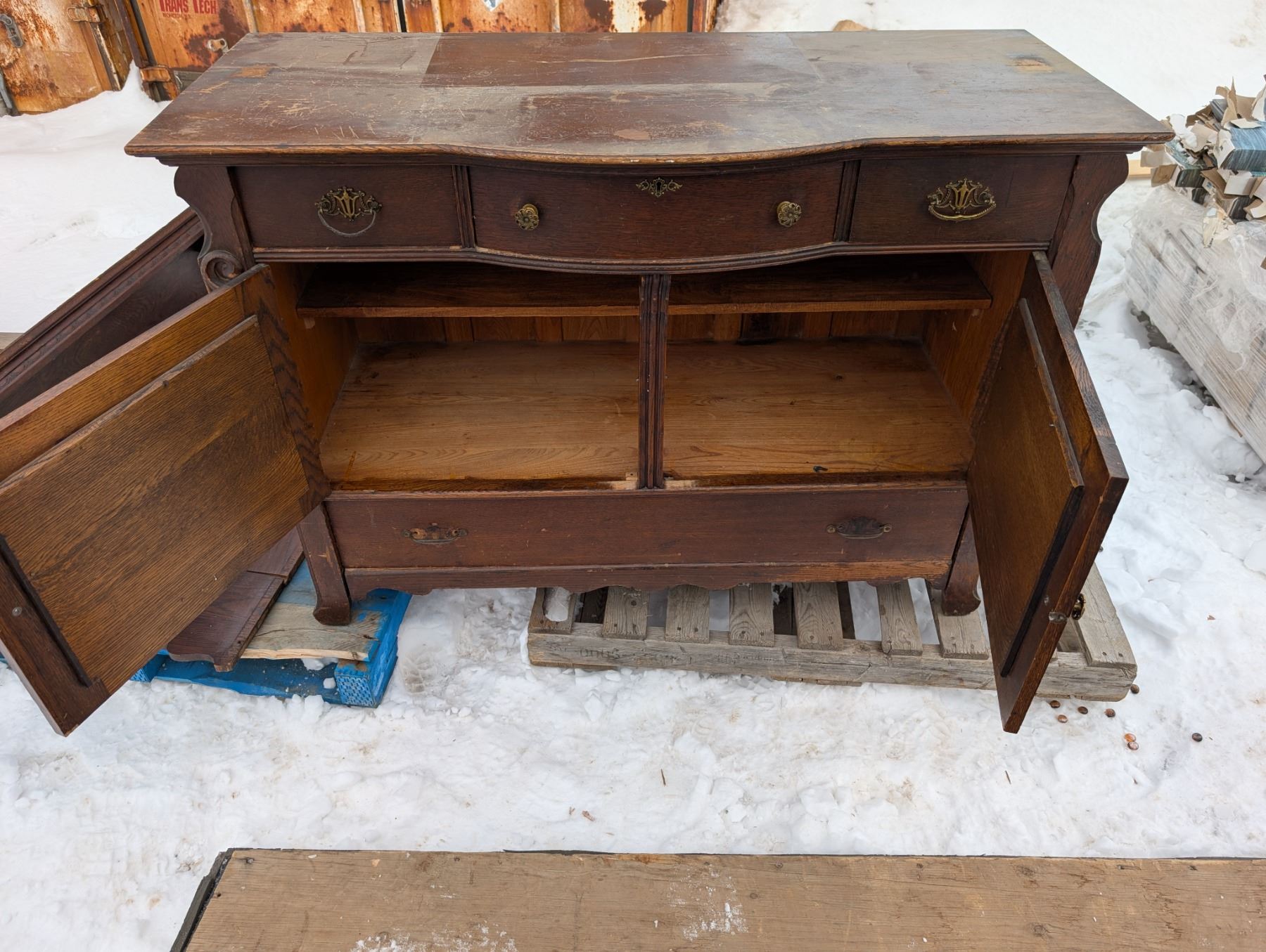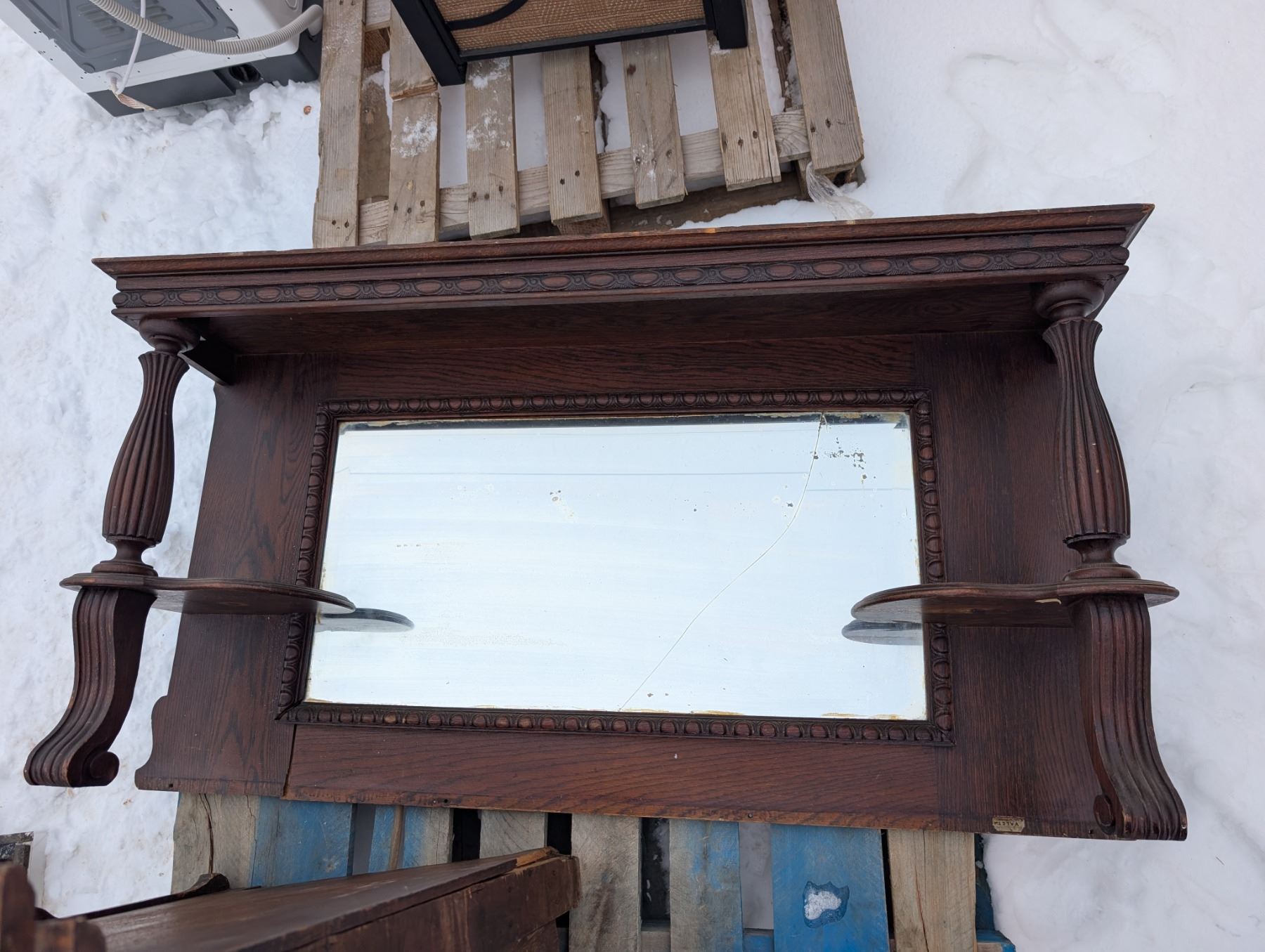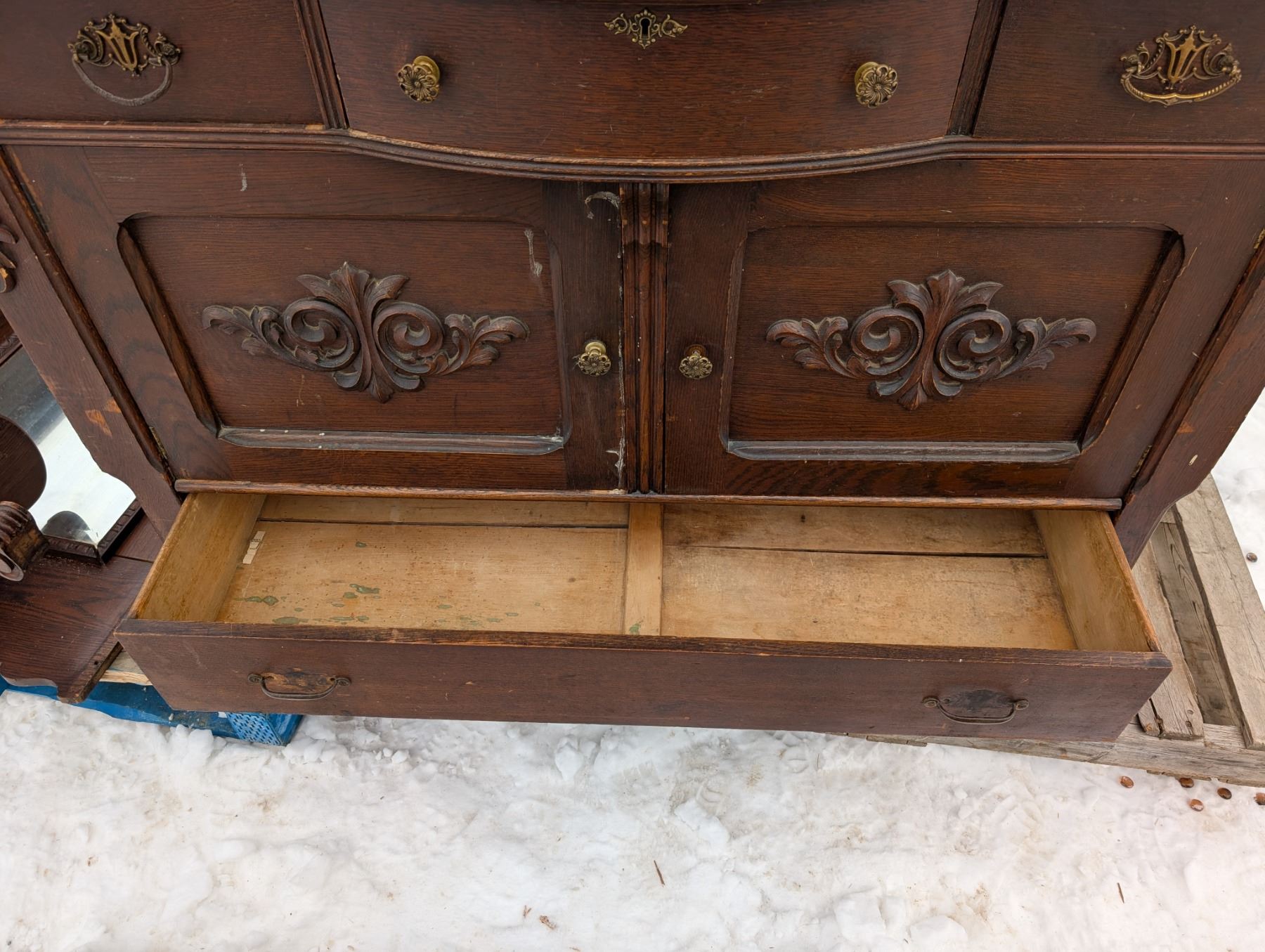 24"x55"x39" /53"x28"x13" Vintage Wood Dresser w/ Mirror Unique Designed Handles and Wood Carved Parts