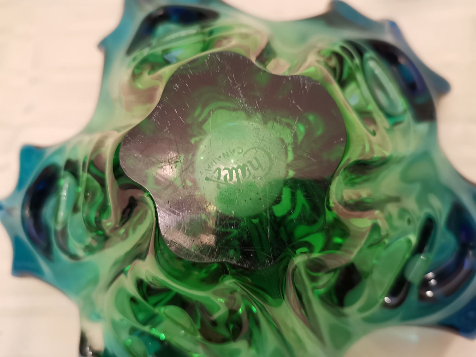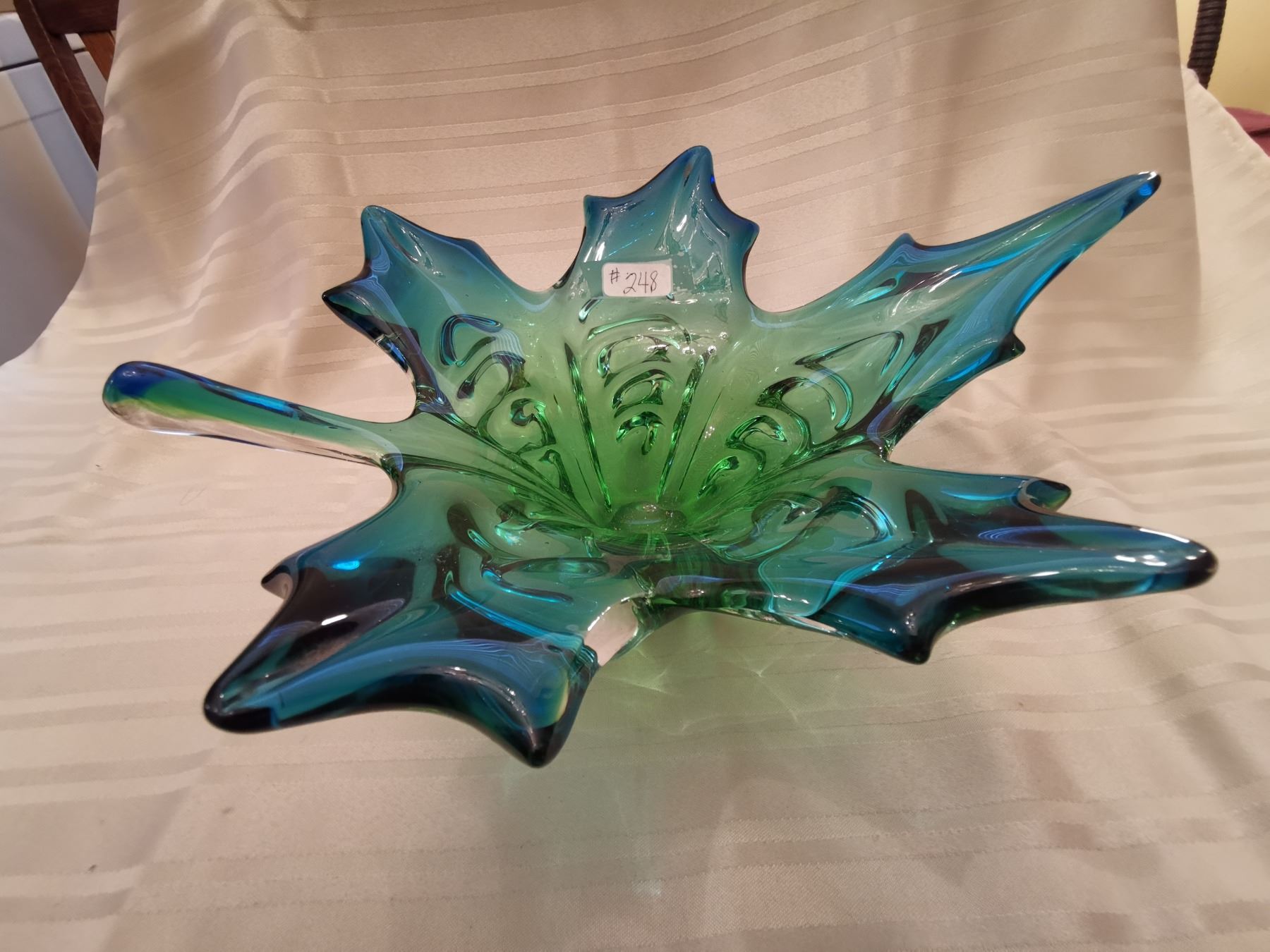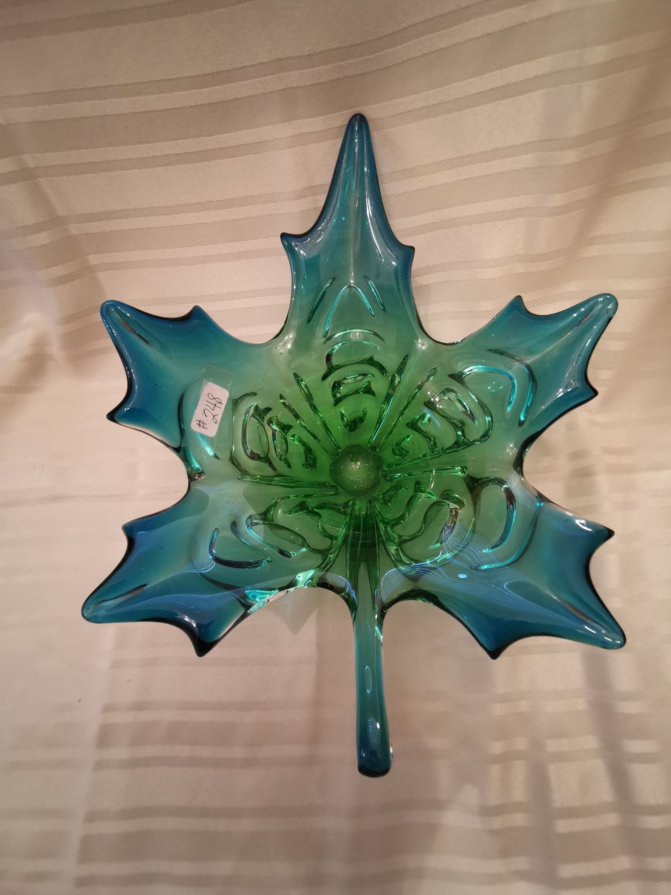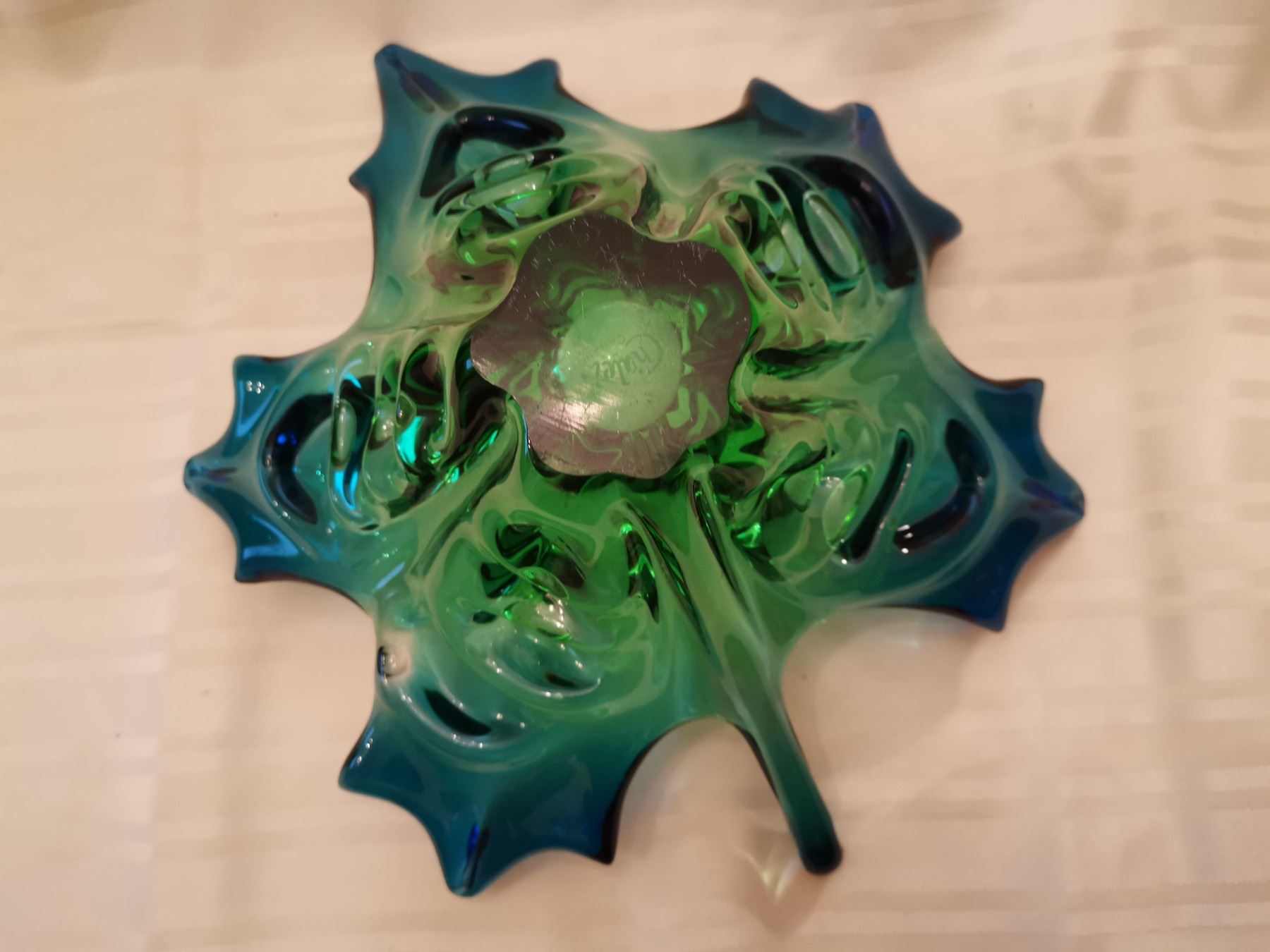 248. Glass maple leaf centerpiece, blue& green, engraved “Chalet”, 13” across