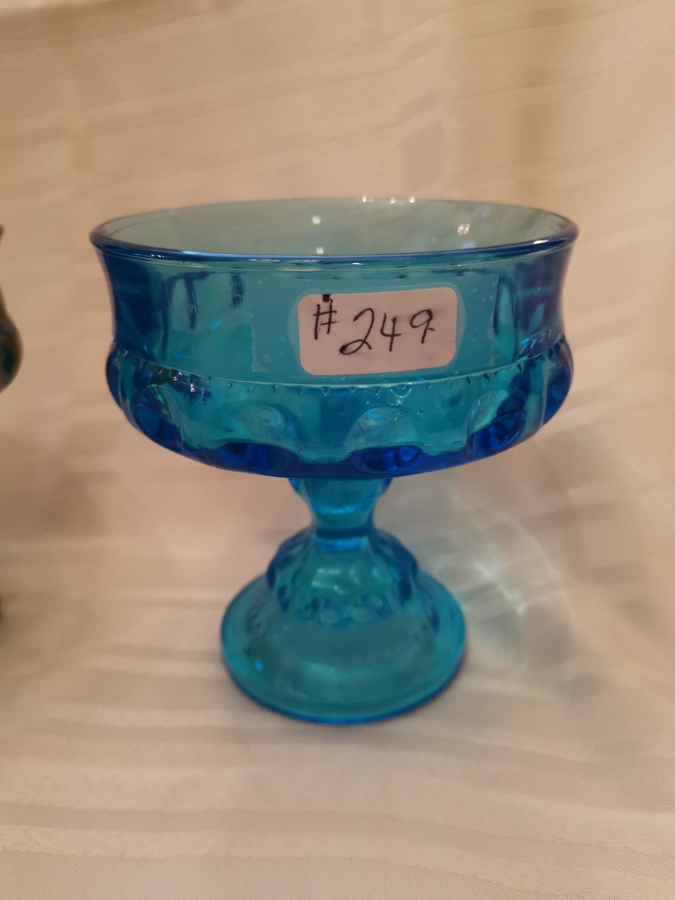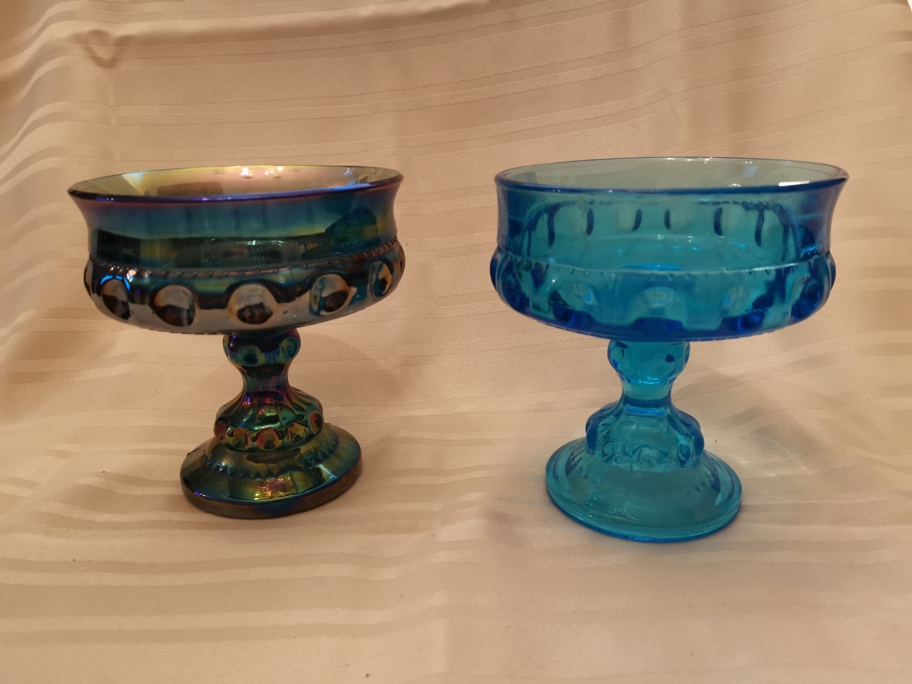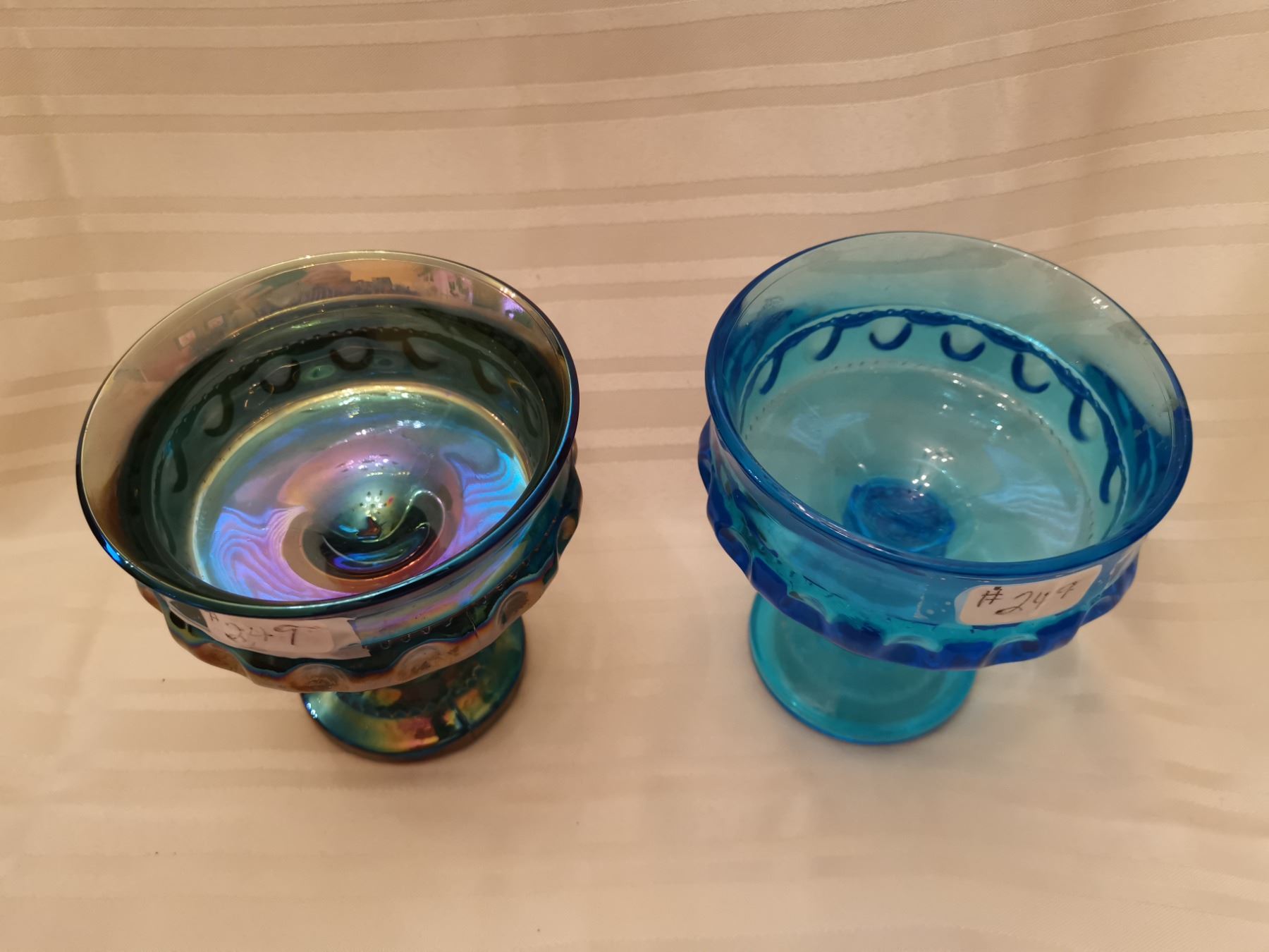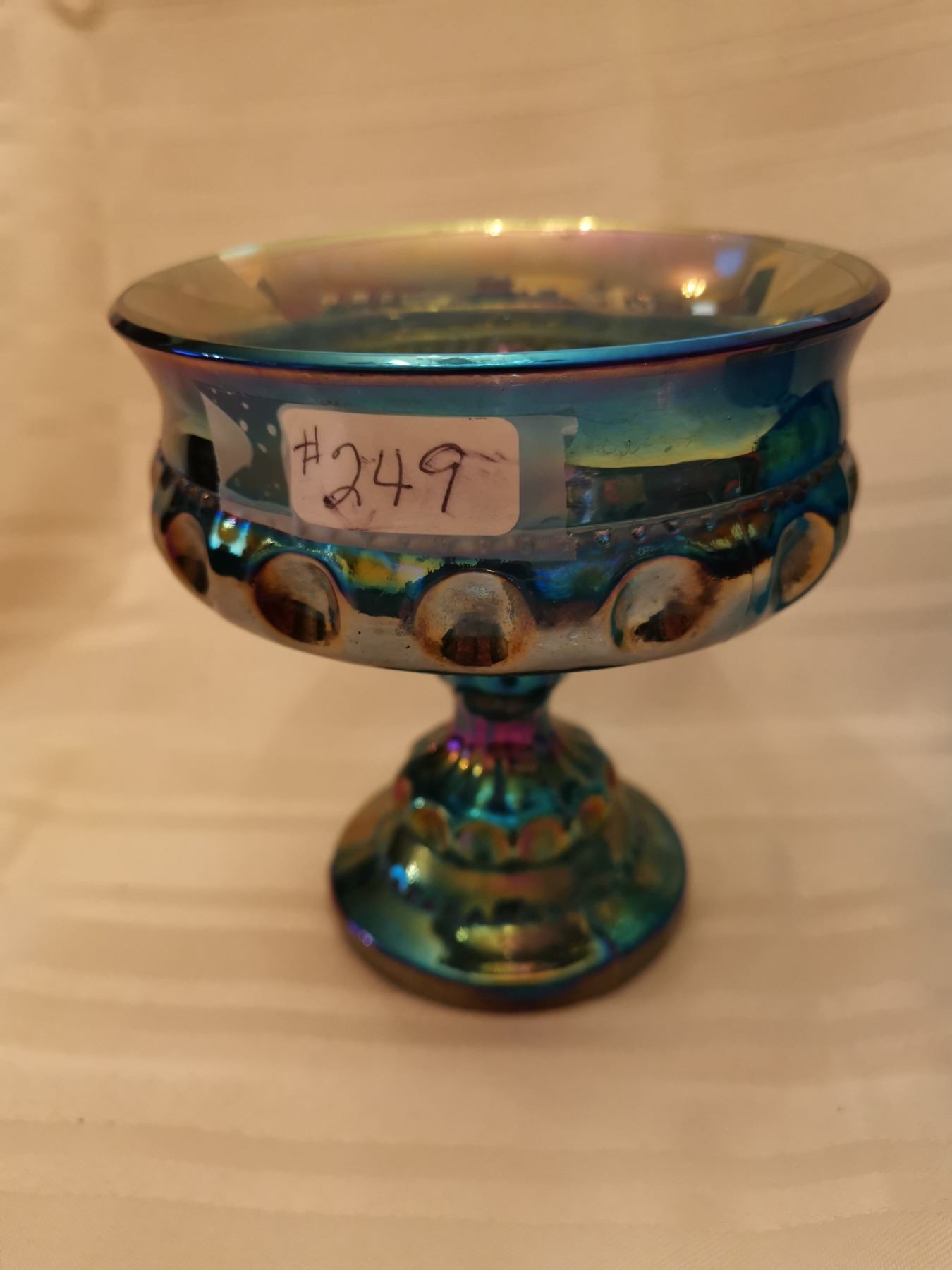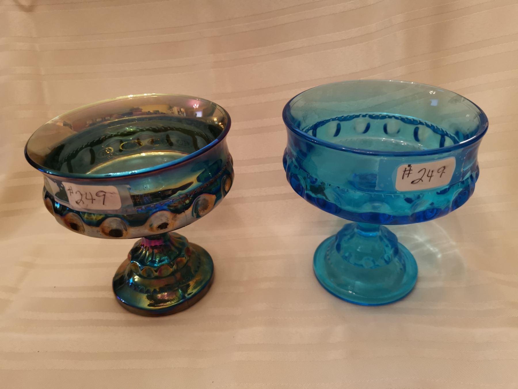 249. Blue and iridescent footed candy dishes, “King’s Crown” pattern