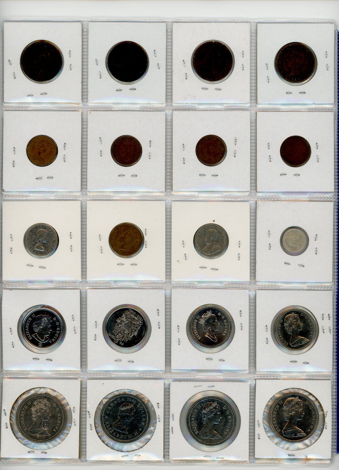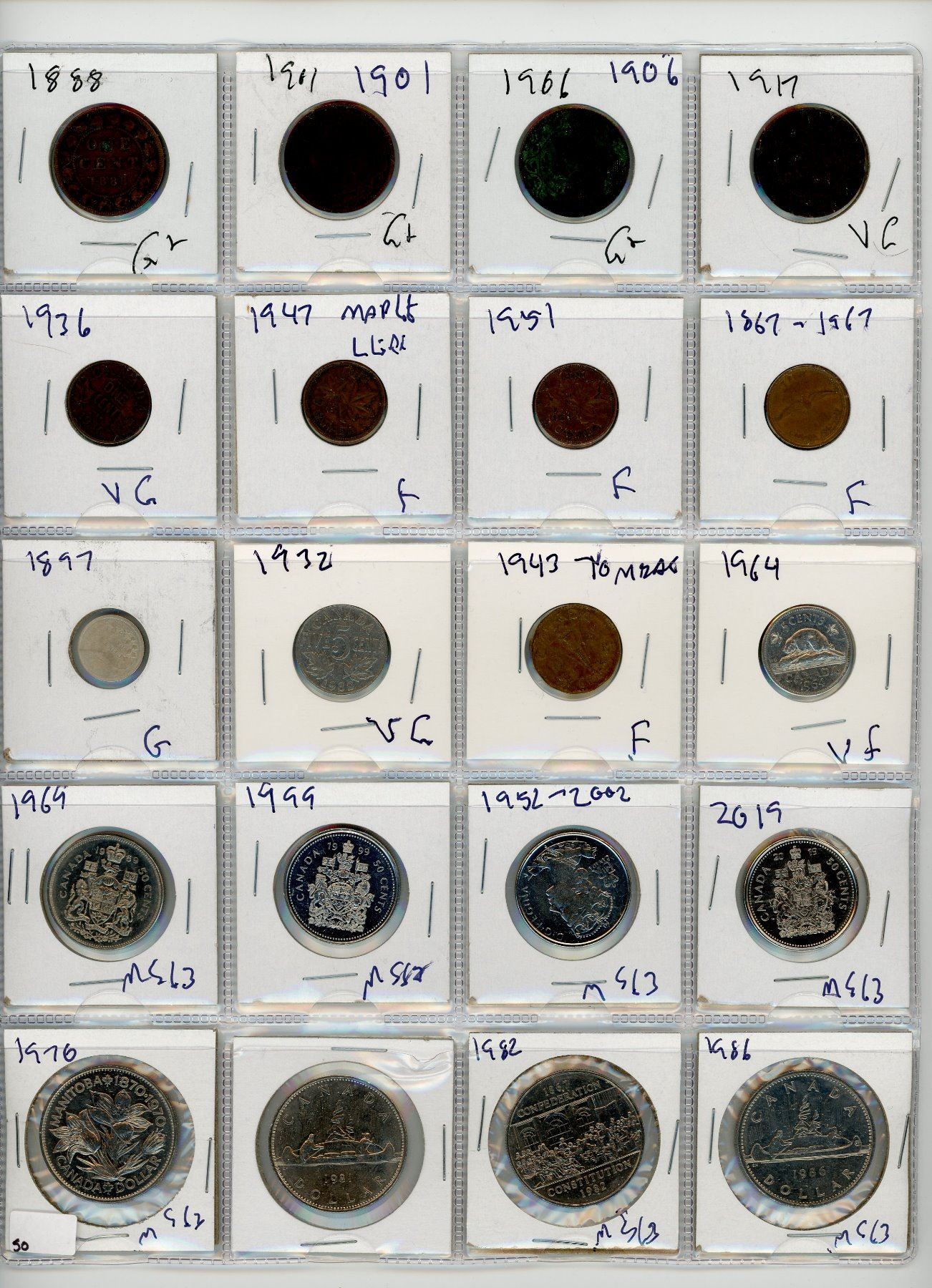 PAGE LOT OF 20 CANADIAN COINS (4 X $1.00, 4 X .50, 4 X .05, 4 X SMALL .01, 4 X LARGE .01) *ASSORTED DATES*