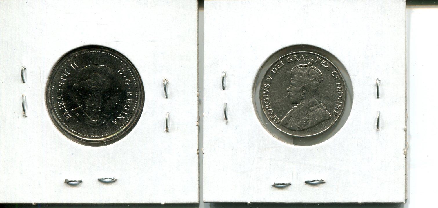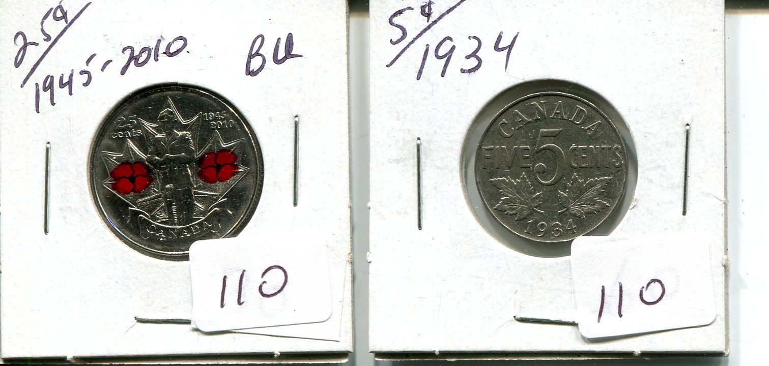25 cents Canadian 1945-2010 Colorized BU + 1934 5 cents quarter nickel coin