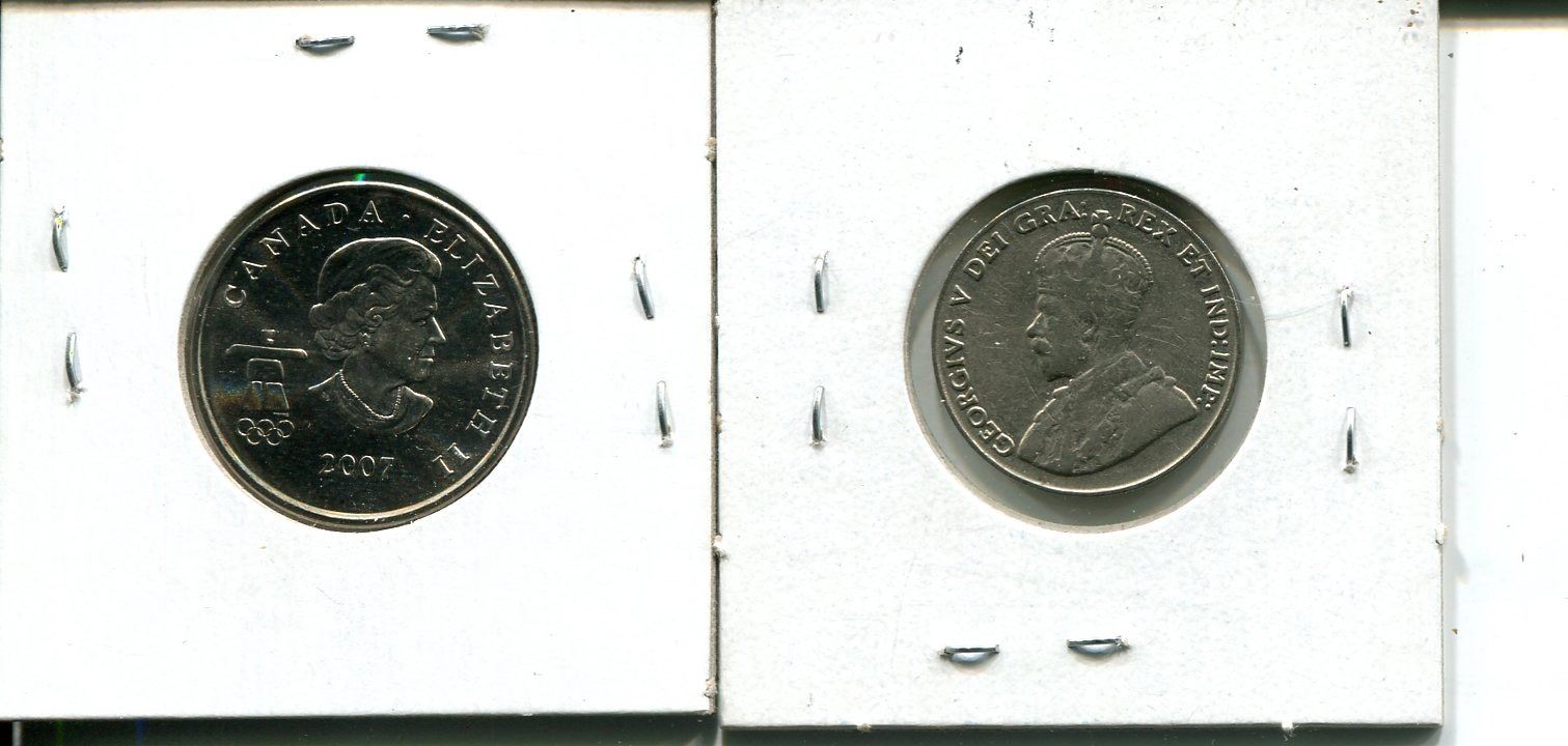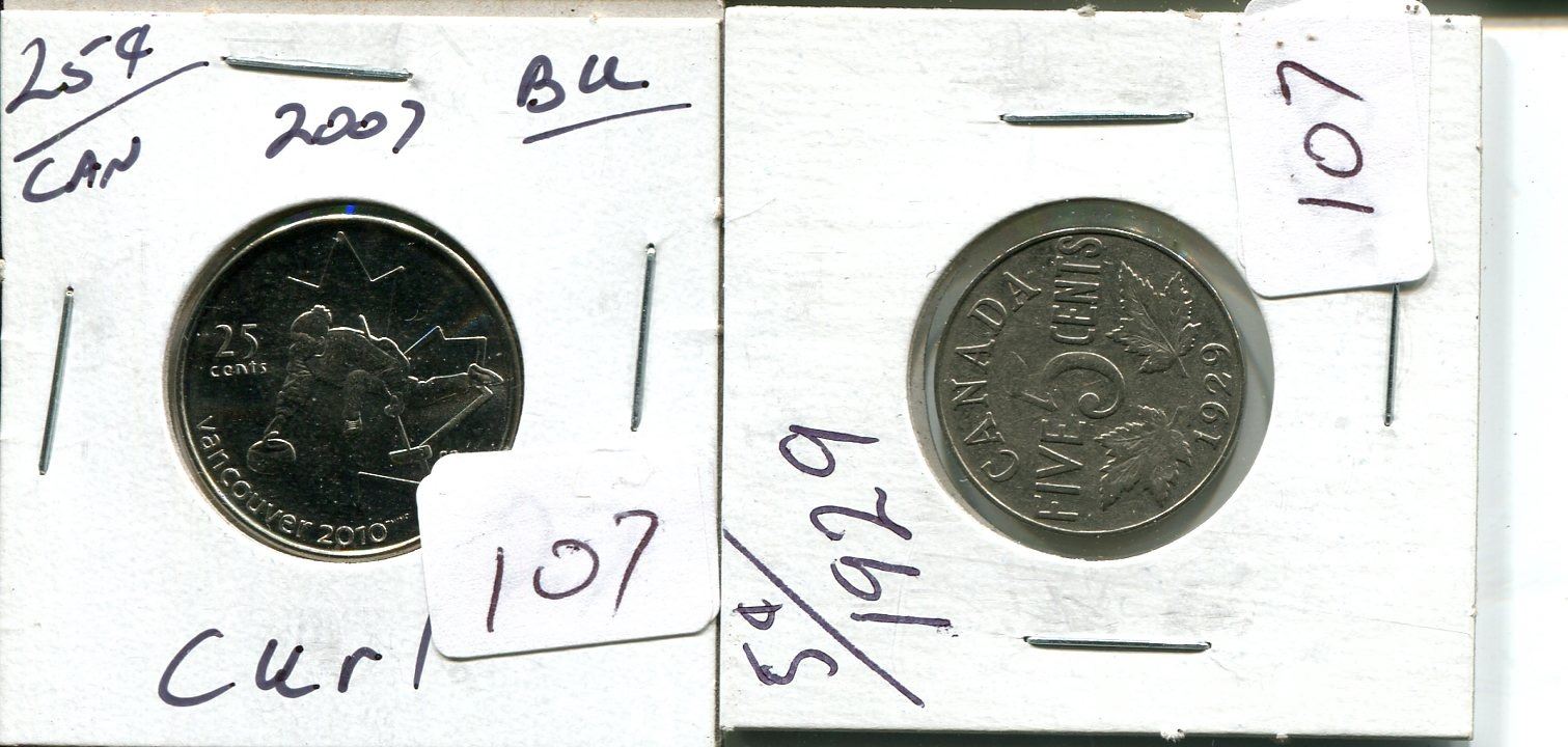 25 cents Canadian 2007 Curlins BU + 1929 5 cents quarter nickel coin