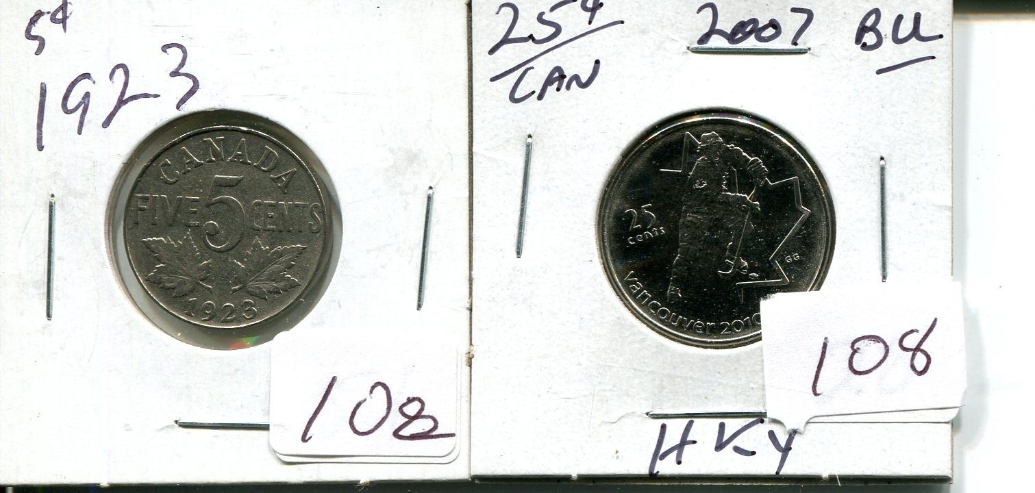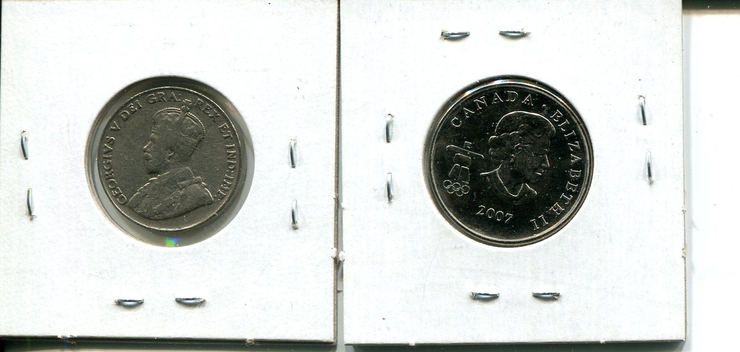 25 cents Canadian 2007 Hockey BU + 1923 5 cents quarter nickel coin