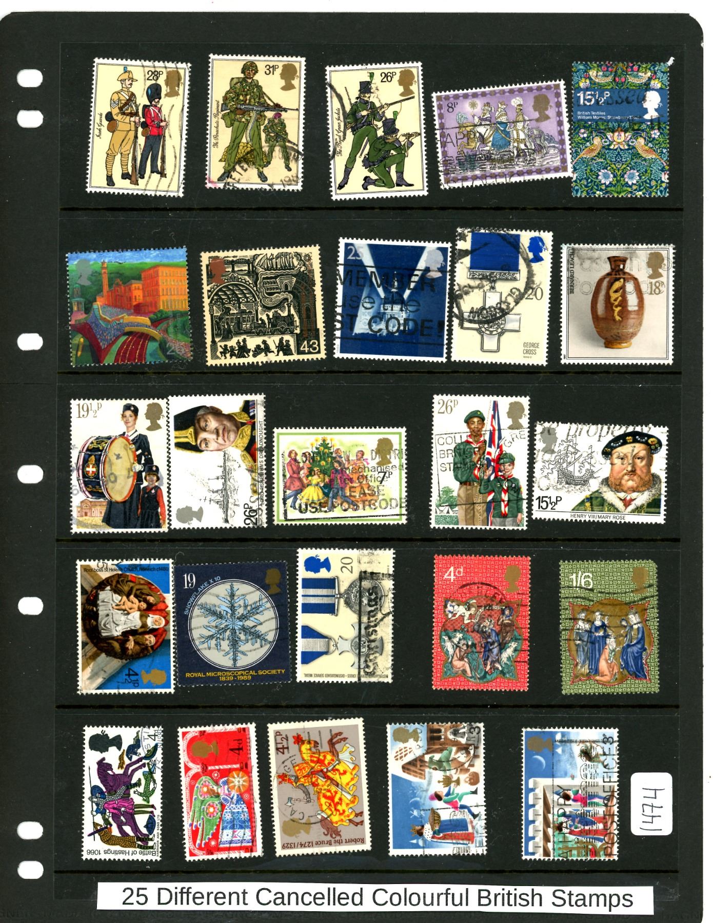 25 different cancelled colorful British stamps