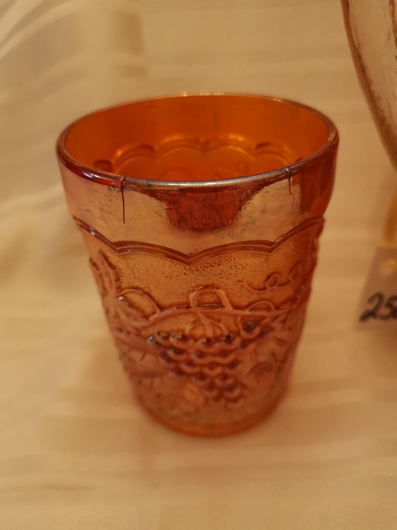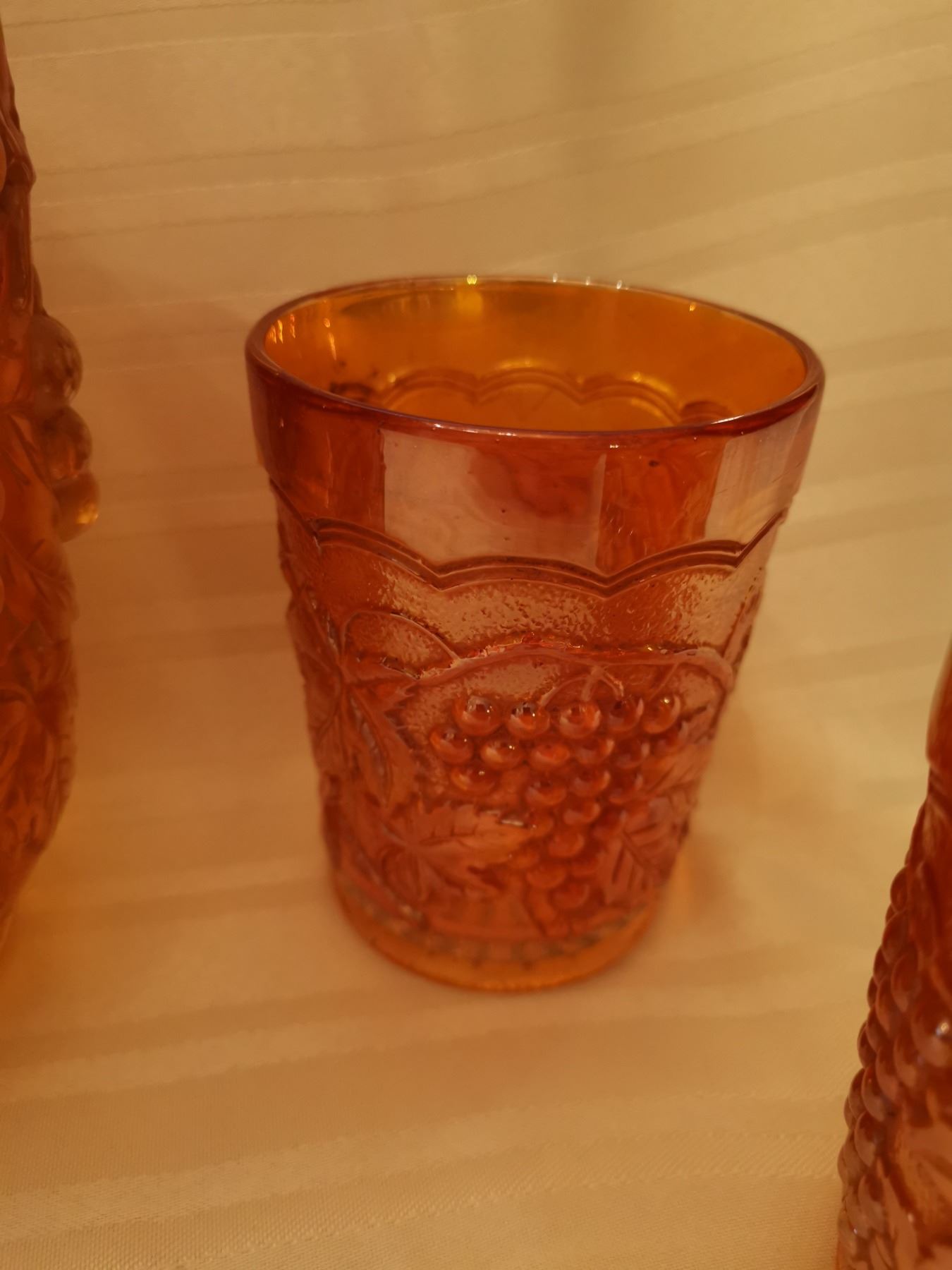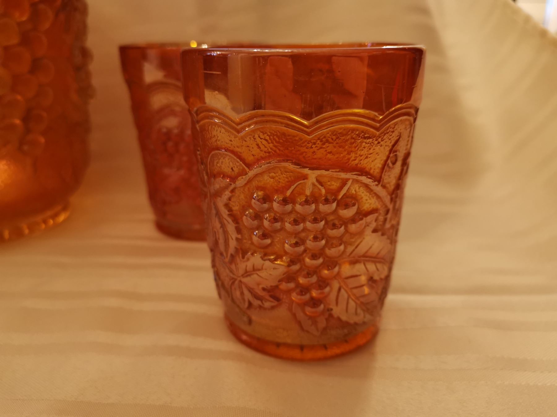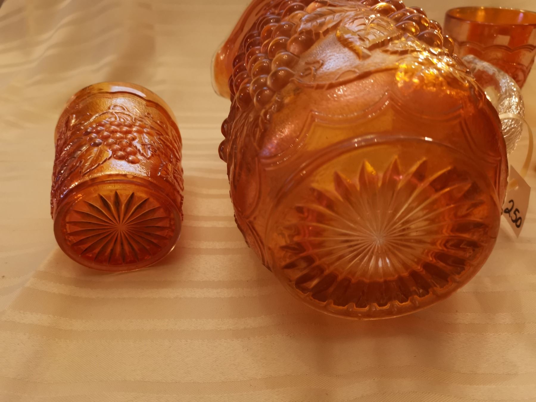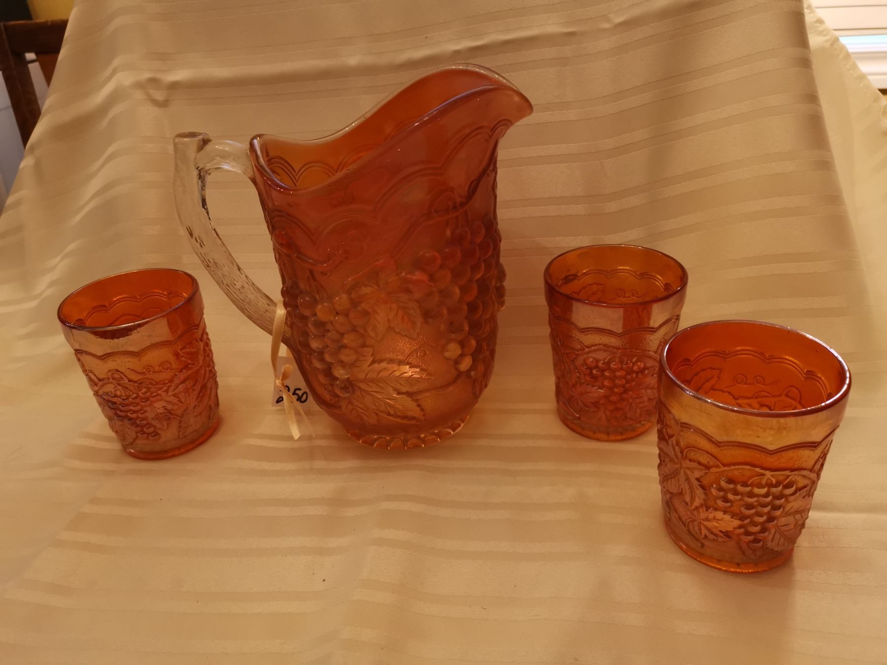 250. Carnival glass pitcher and 3 glasses, grape pattern, by Imperial Glass