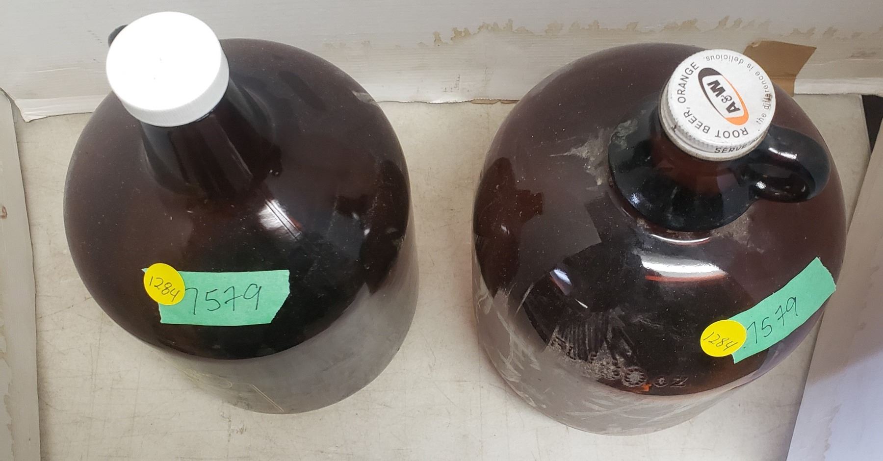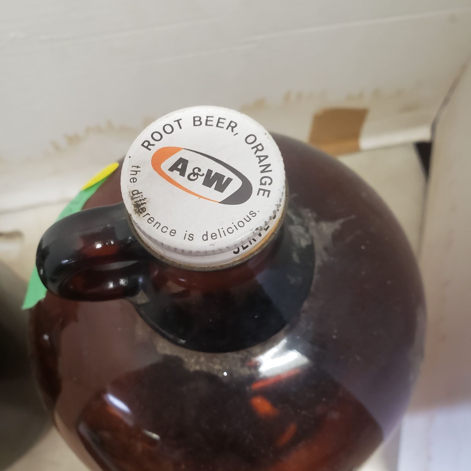 2x 160oz bottles brown glass one has A&W Root Beer lid