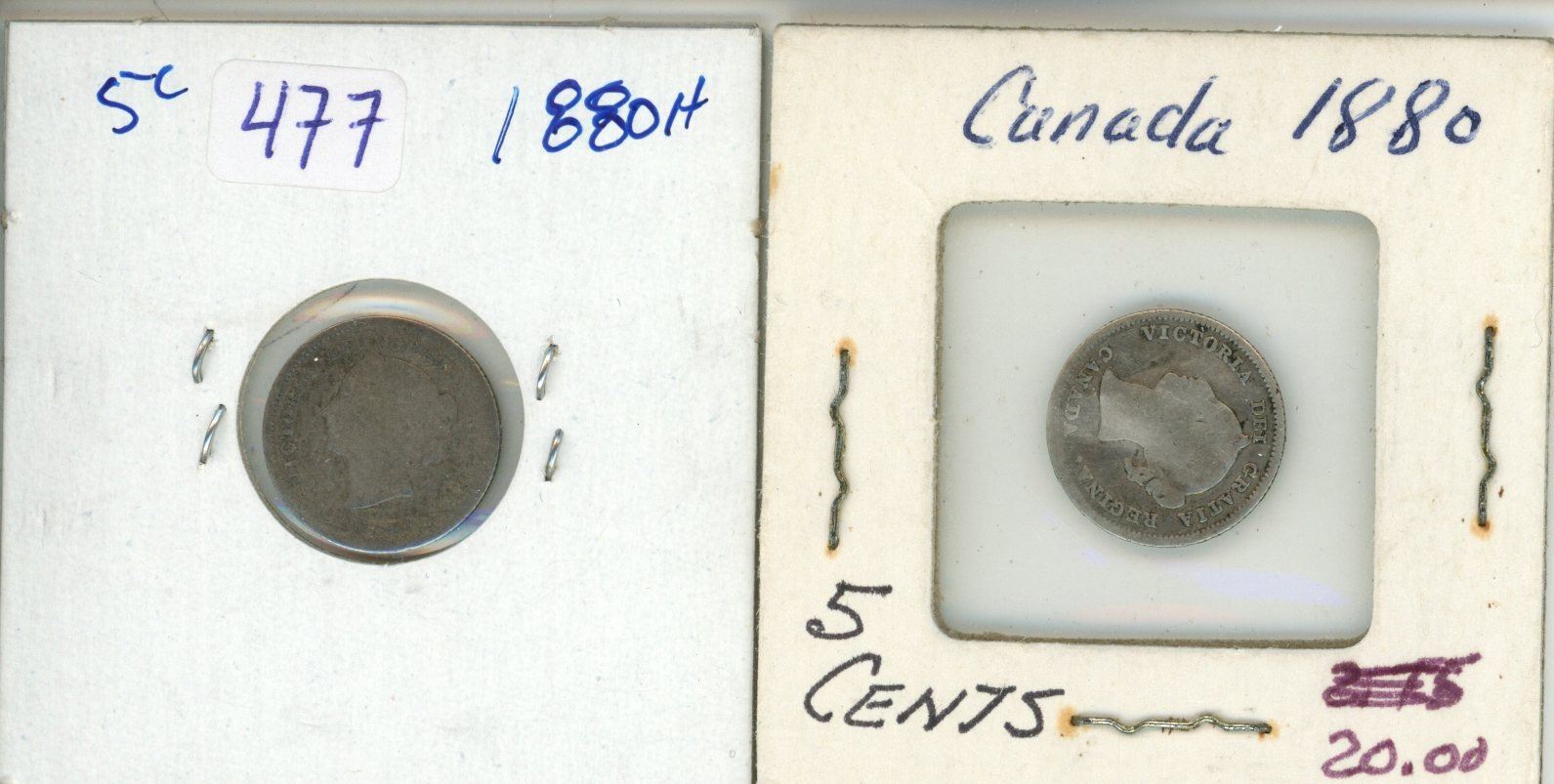 2x 1880H Canadian silver 5 cent coins - VF