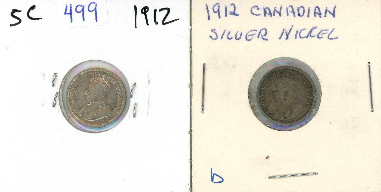 2x 1912 Canadian silver 5 cent coins - VG-F