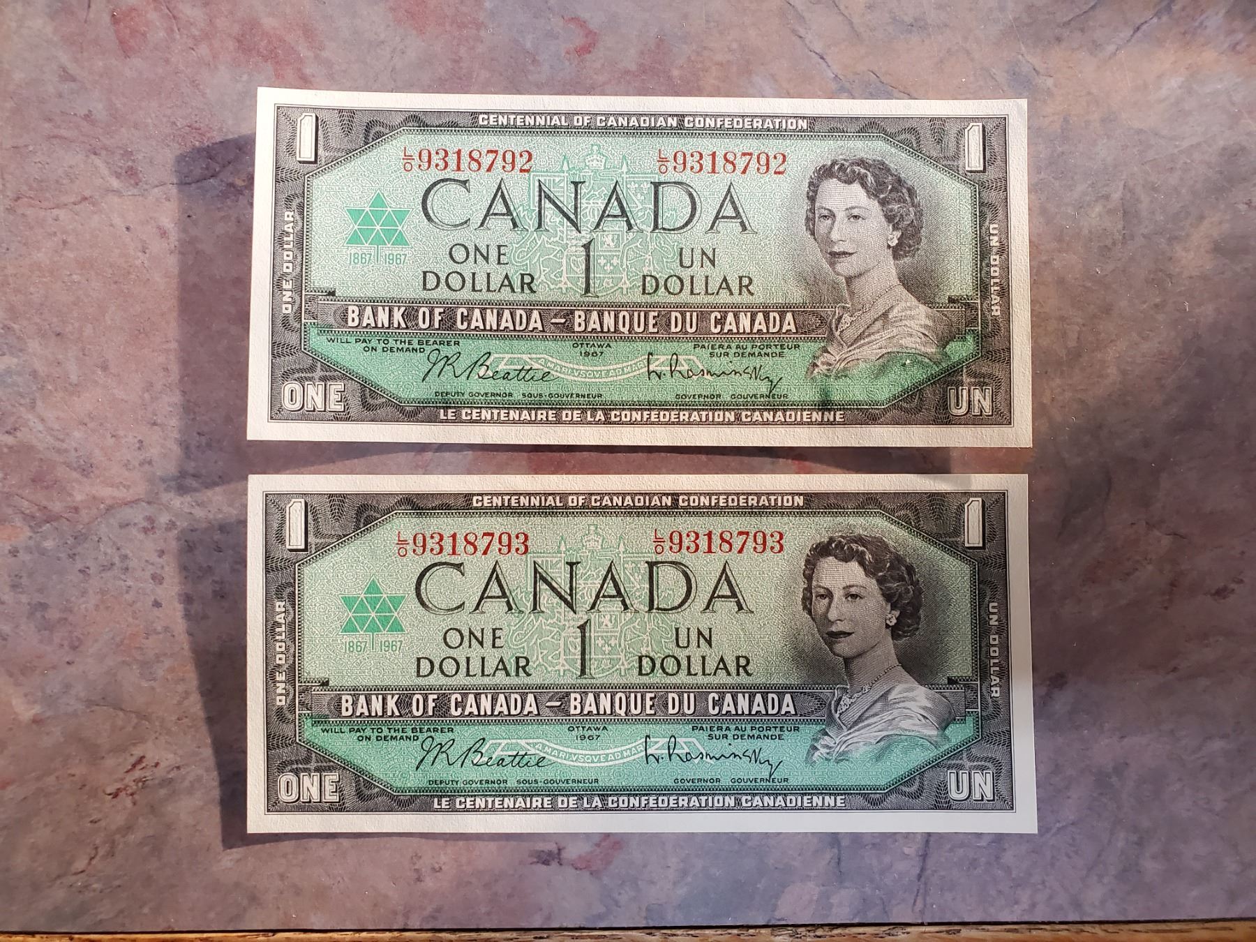 2x 1967 $1 UNC sequential
