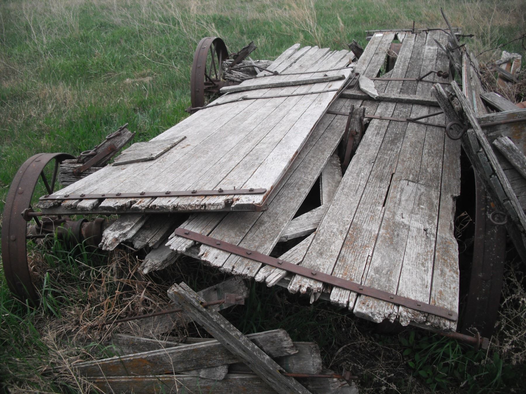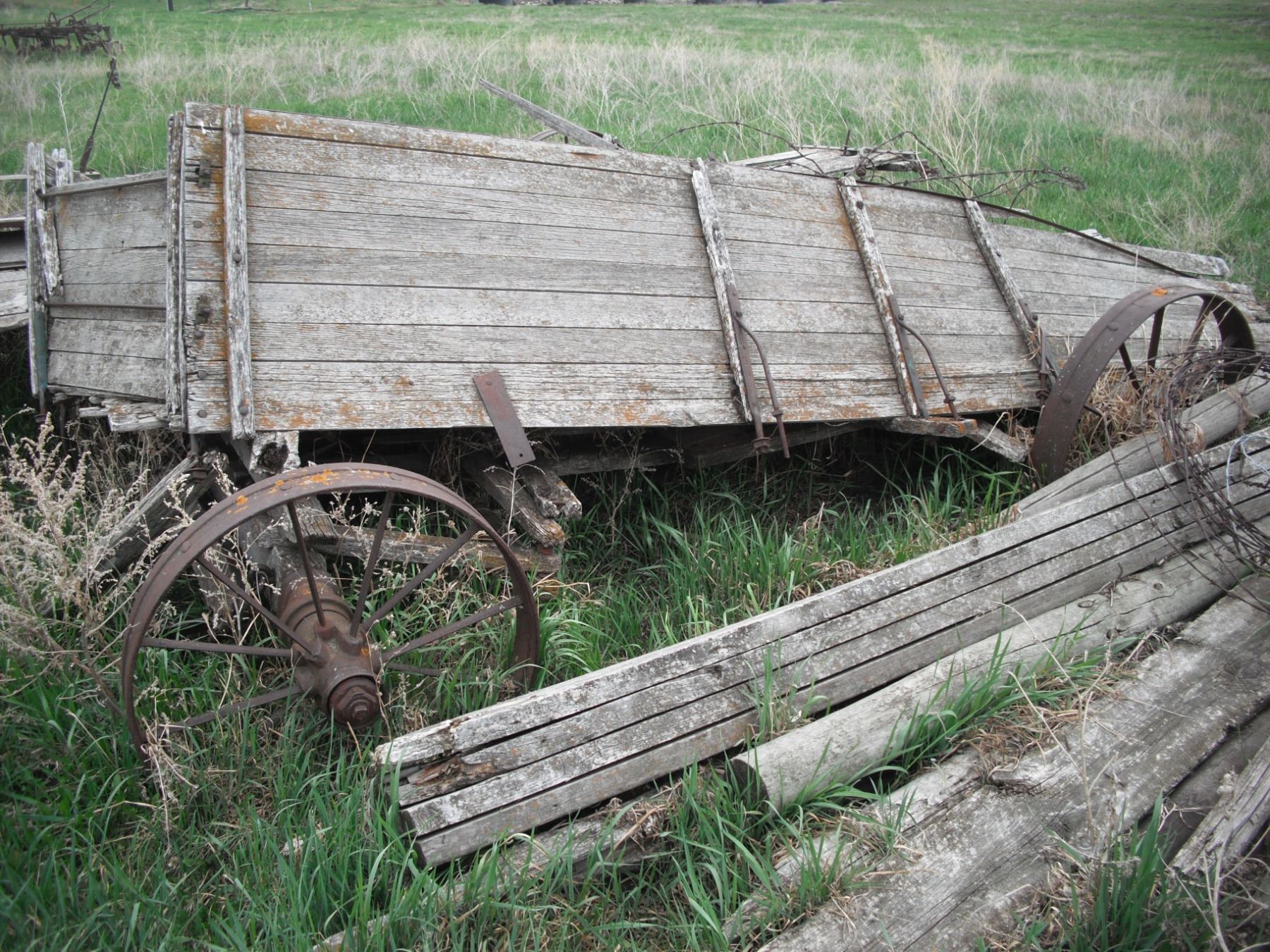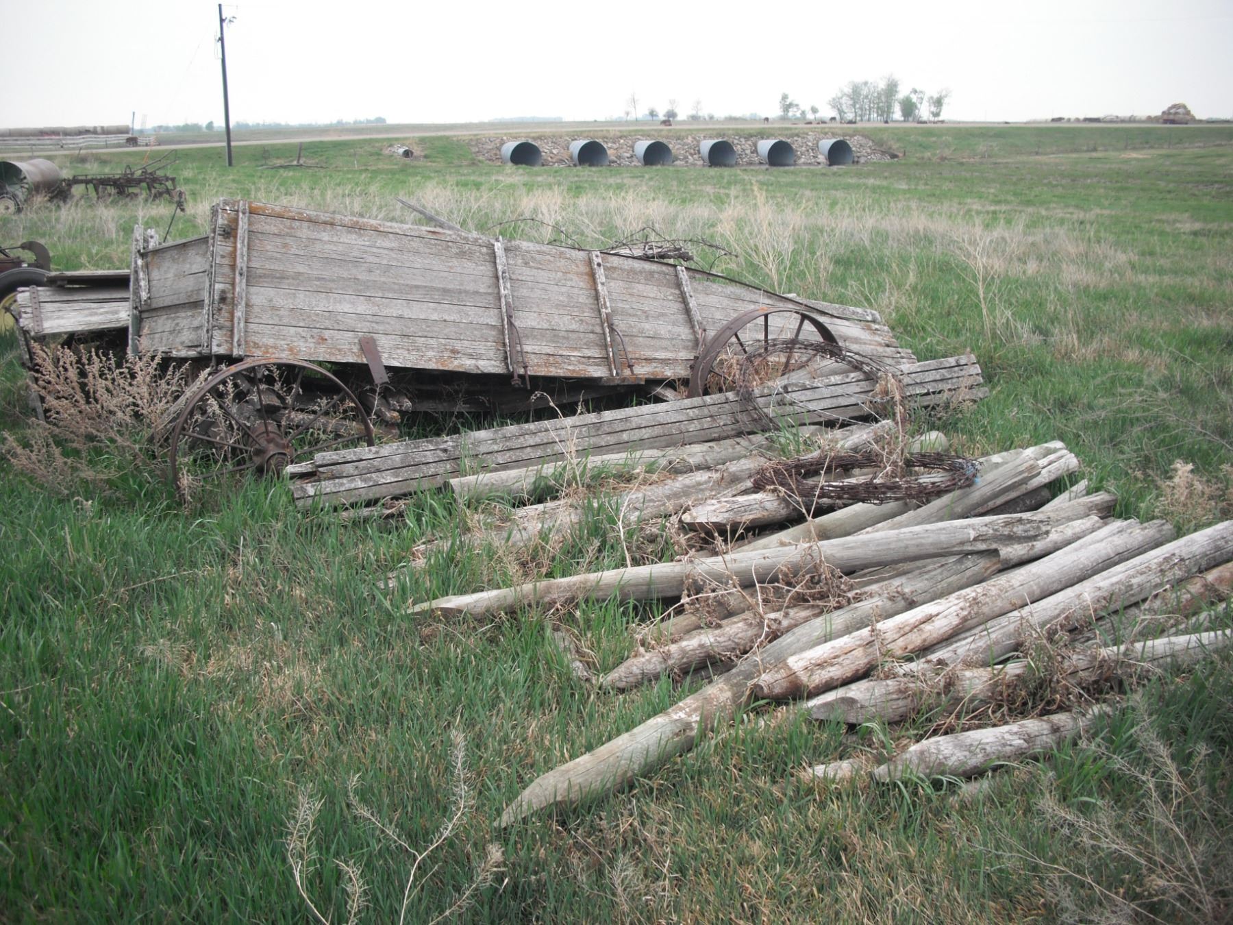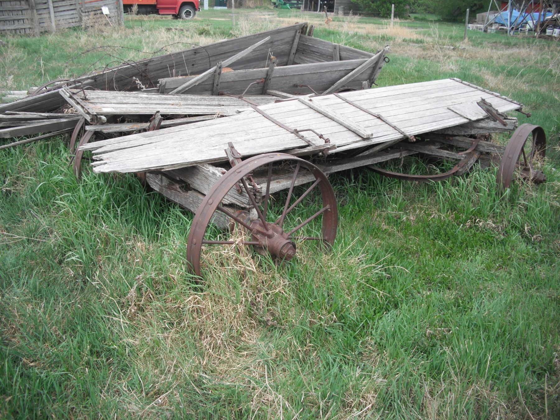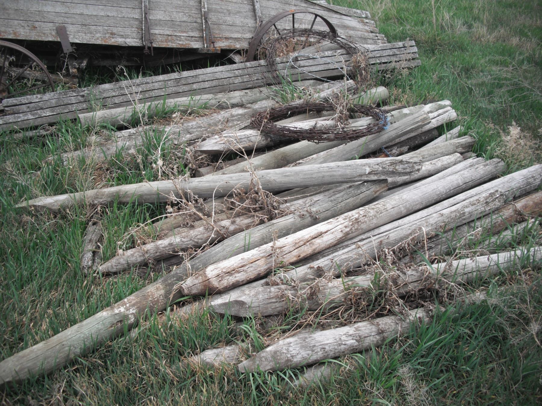 2x wagons with 25" & 28" steel wheels, and assorted poles, barbed wire, boards, etc.