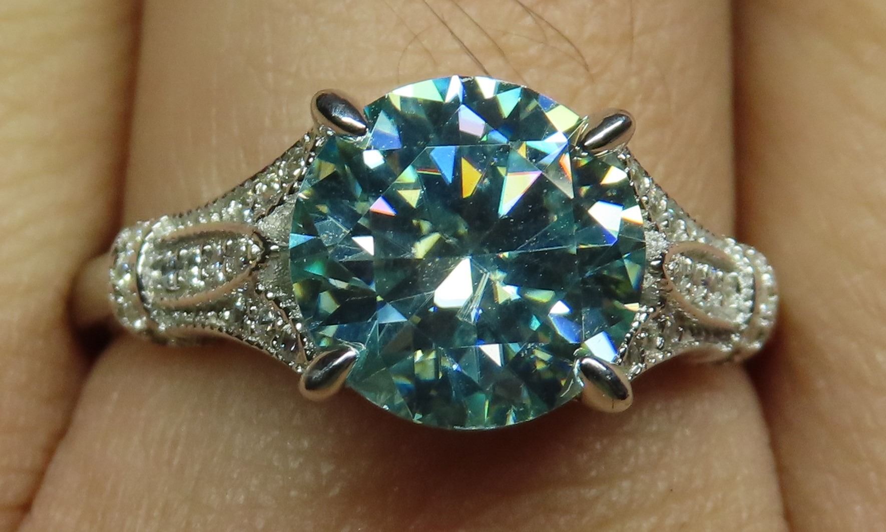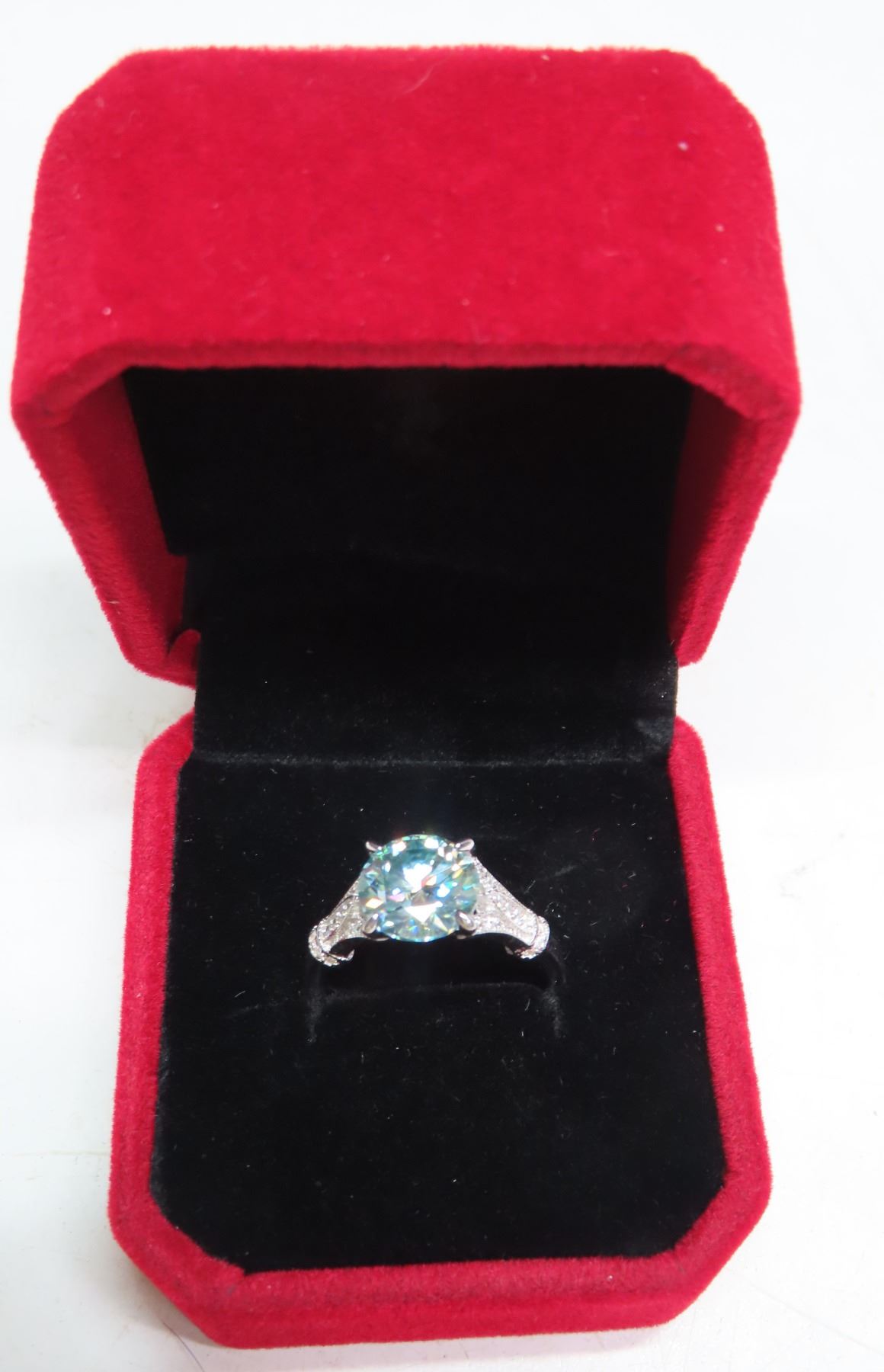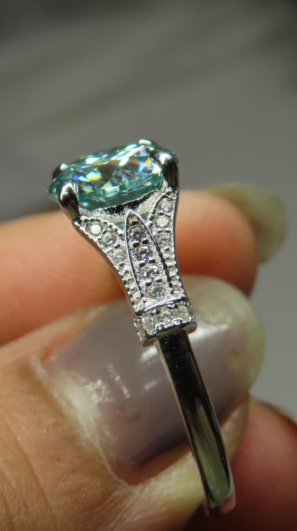 3.00 CT GRA CERTIFIED MOISSANITE VVS BLUE COLOR WITH 15 ROUND CUT CUBIC ZIRCONIUM SET ON EACH SIDE IN SHANK WEIGHING 0.15 CT TW SET IN STERLING SILVER RING RETAIL VALUE $2,160.00- SIZE 8.5