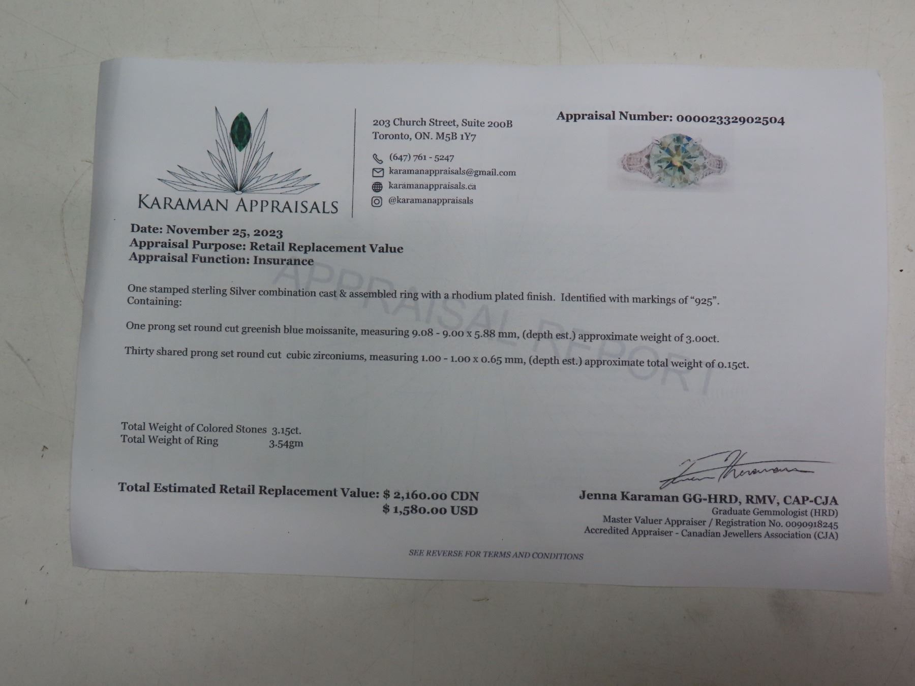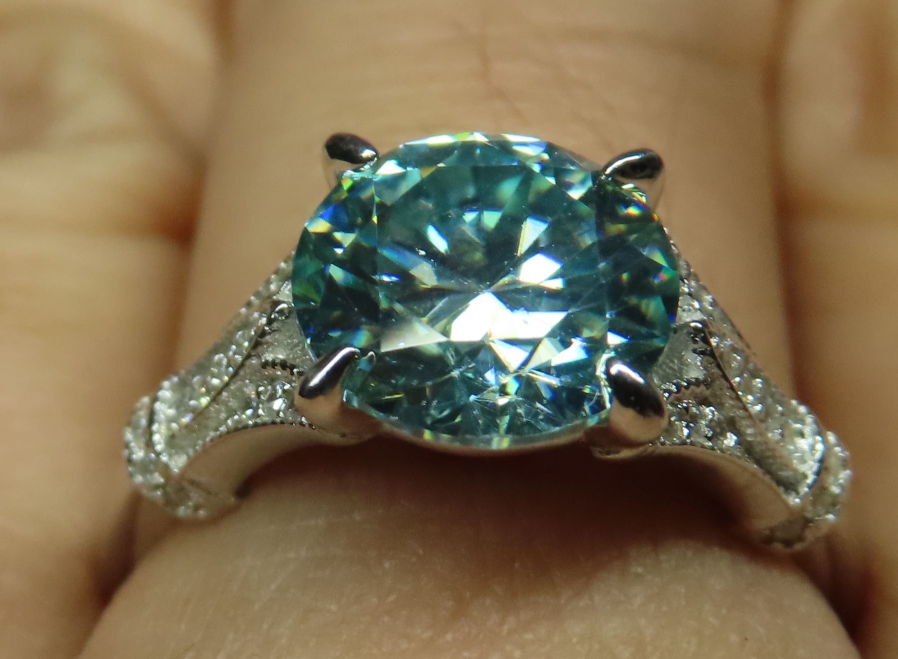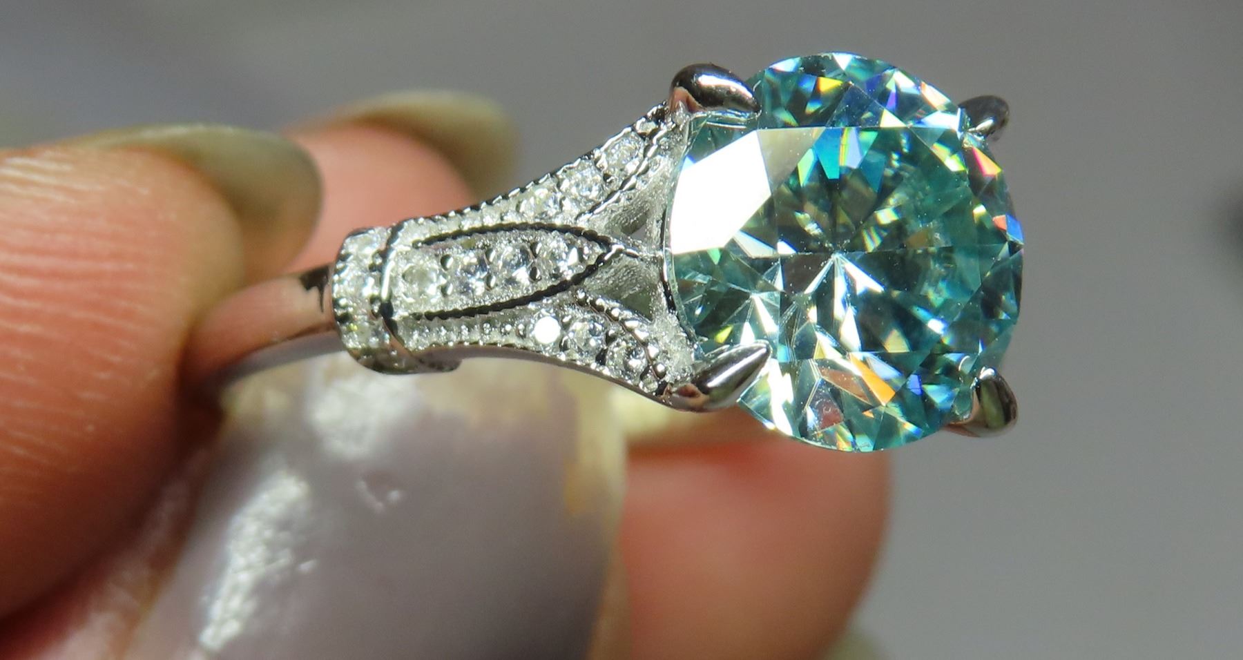 3.00 CT GRA CERTIFIED MOISSANITE VVS BLUE COLOR WITH 15 ROUND CUT CUBIC ZIRCONIUM SET ON EACH SIDE IN SHANK WEIGHING 0.15 CT TW SET IN STERLING SILVER RING RETAIL VALUE $2,160.00- SIZE 8.5