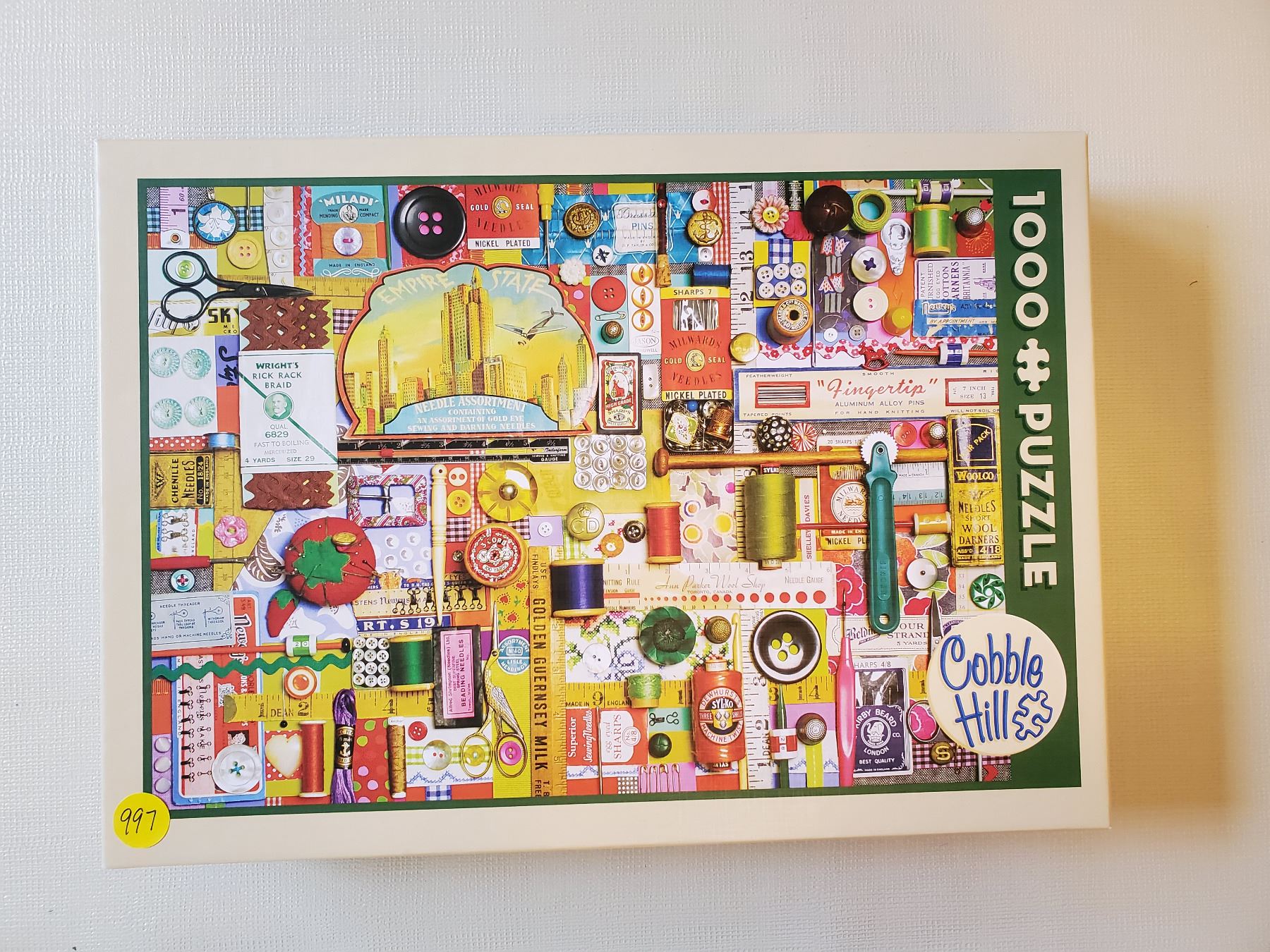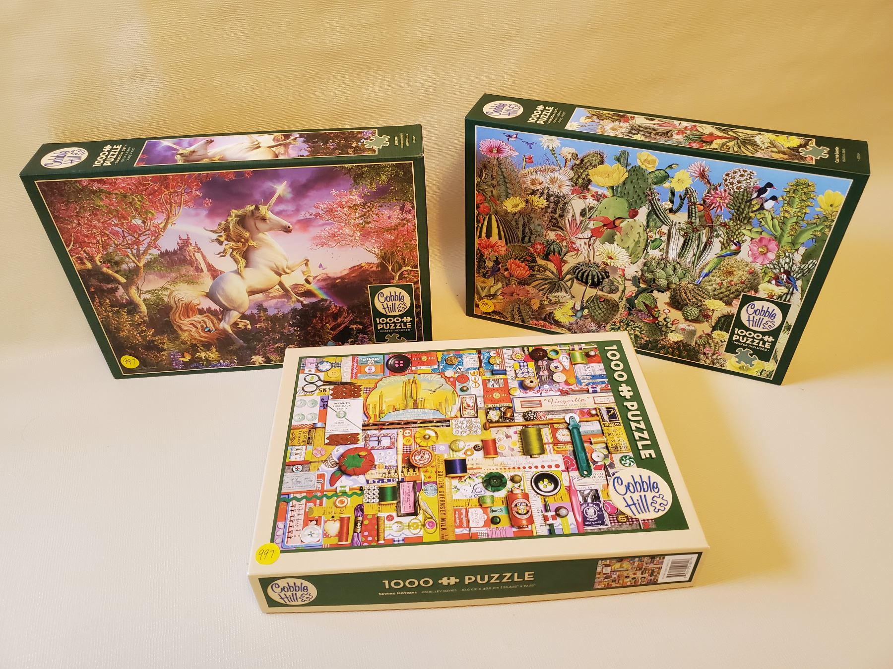 3 - 1000 piece Cobble Hill Puzzles - Unicorn, Cactus Garden, Sewing Notions