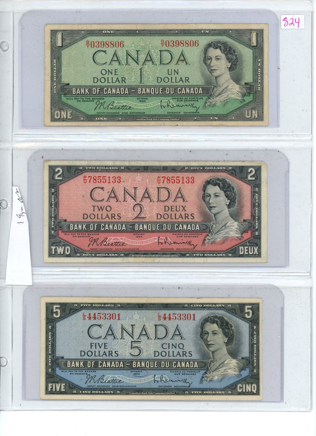 3 - 1954 Canadian 1, 2 & 5 dollar bills - Beattie/Rasminsky B/Y 0398806, P/U 7855133 & L/S 4453301