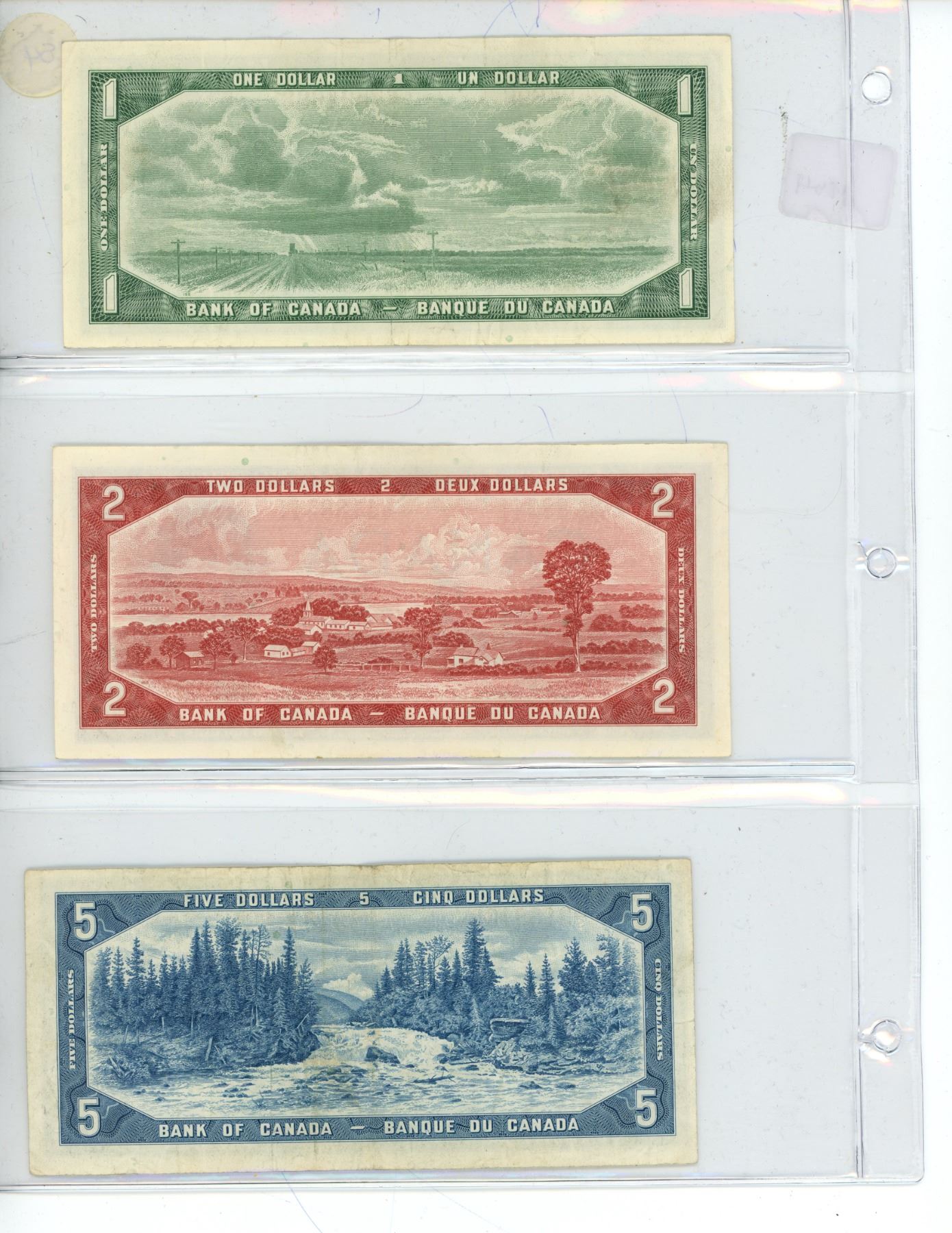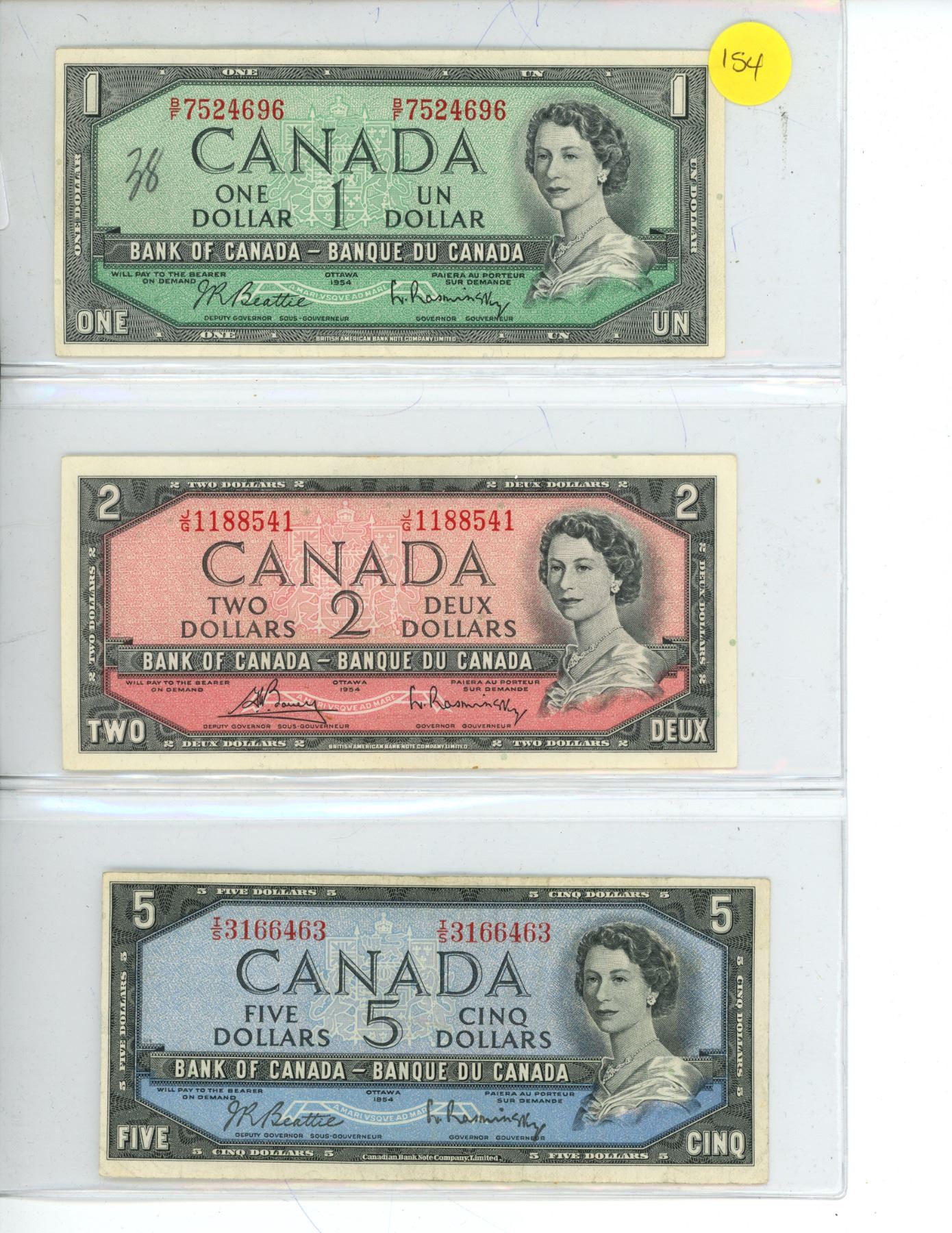 (3) 1954 Canadian Bank Notes – One, Two, and Five Dollars