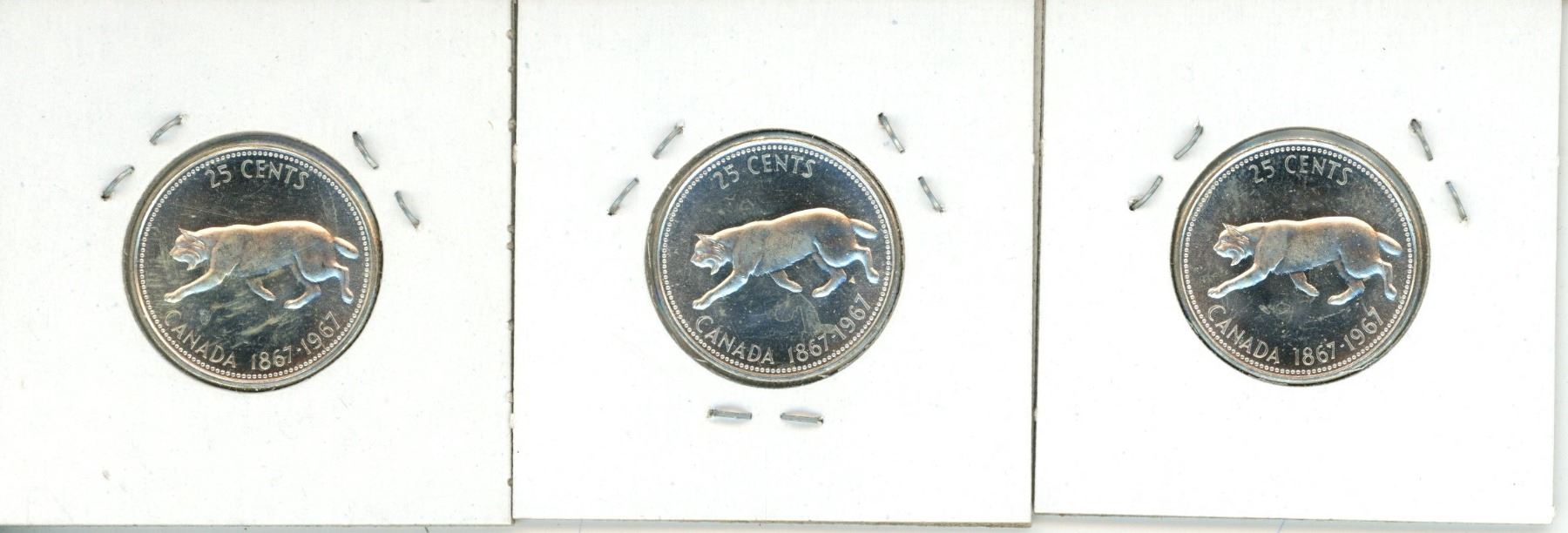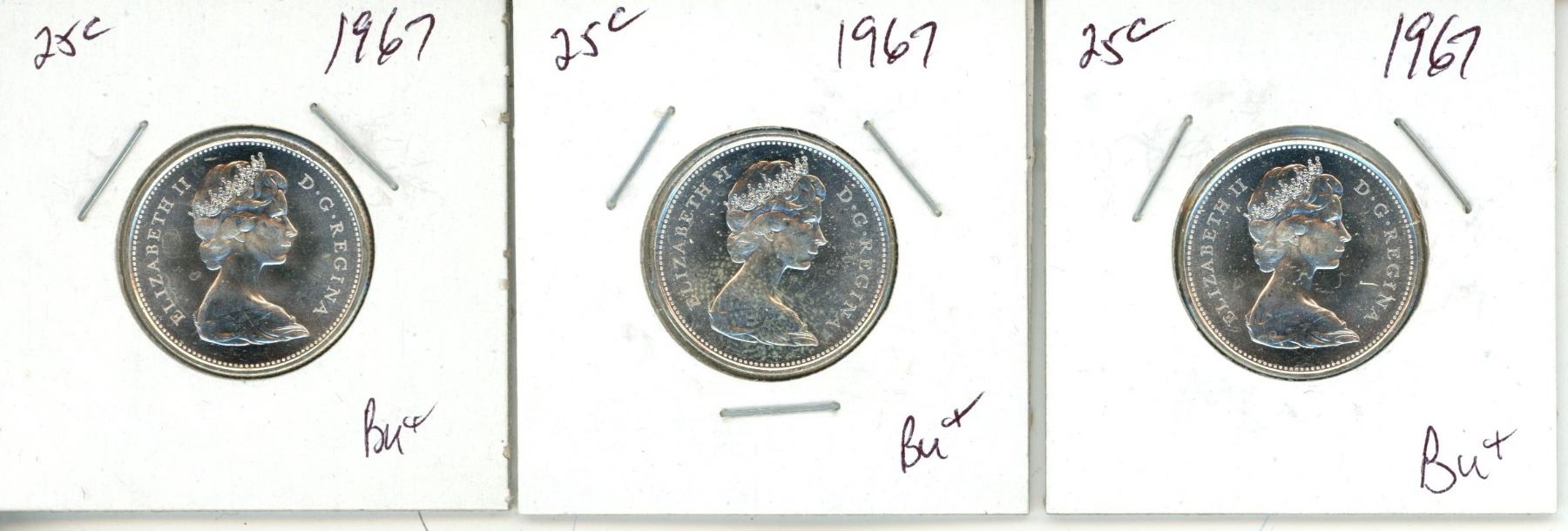3 – 1967 CDN SILVER ELIZ II 25 CENT BU+