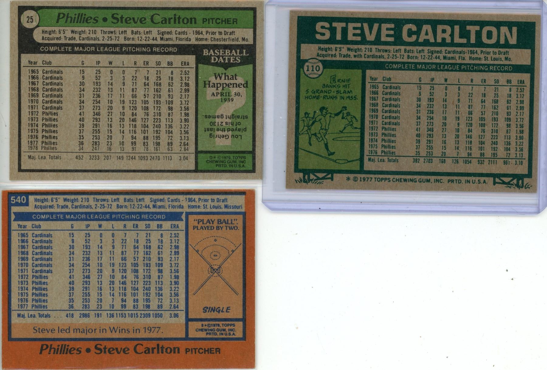 (3) 1970's Topps - Phillies Steve Carlton Cards.