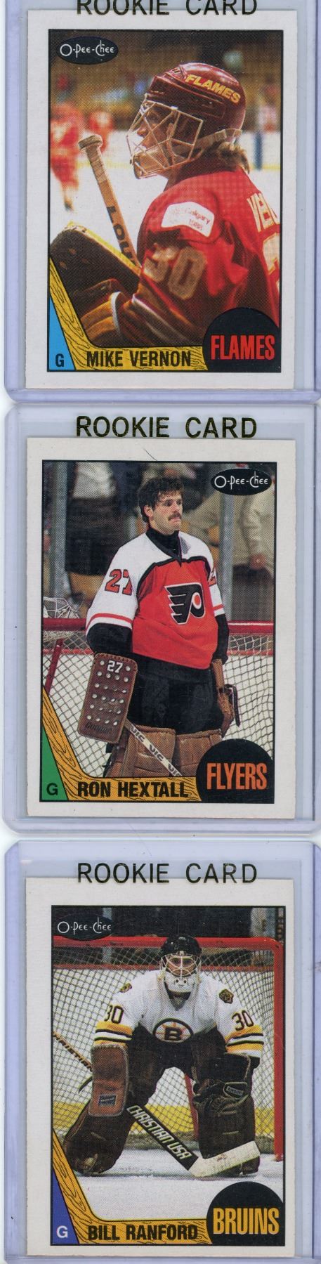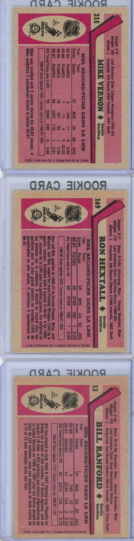 3 1987-88 OPC goalie rookie cards vemon #215 hertall #169 ronford #13