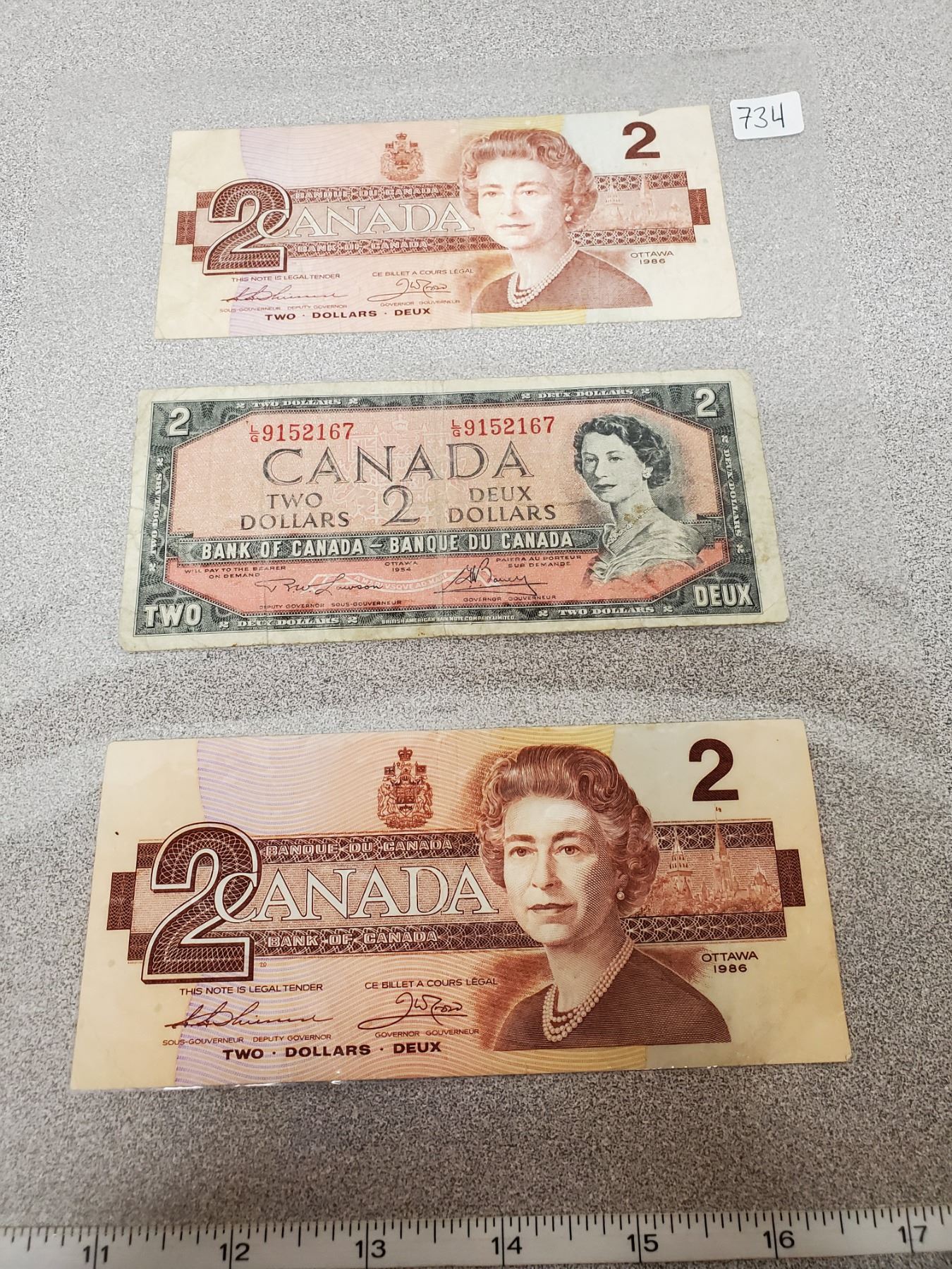 3 $2.00 TWO DOLLAR BILLS, 2 X 1986, 1 1954