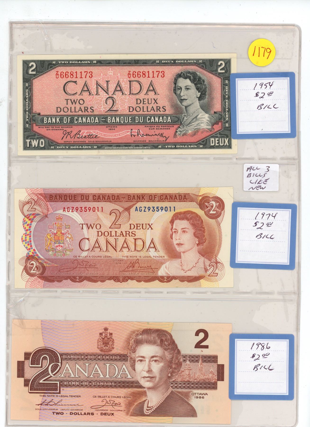 3( $2 bill- 1- 1954 &1-1974 and 1-1986- all 3 bills like new