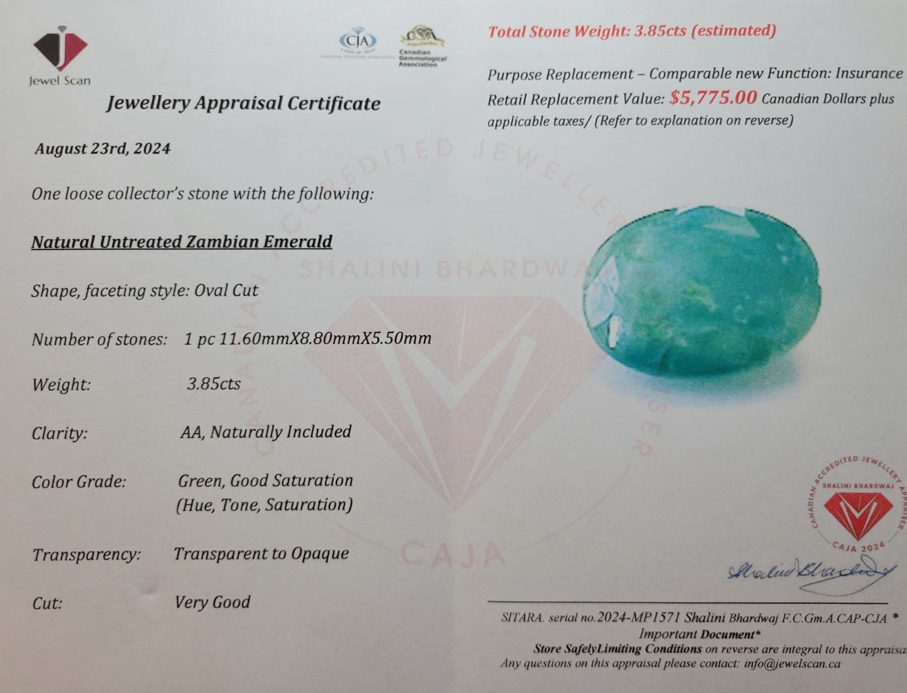 3.85 ct Certified Zambian Emerald gemstone ($5,775 Appraisal)