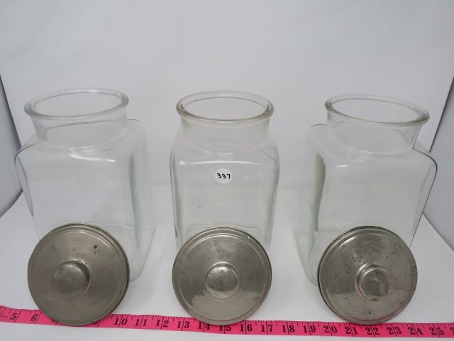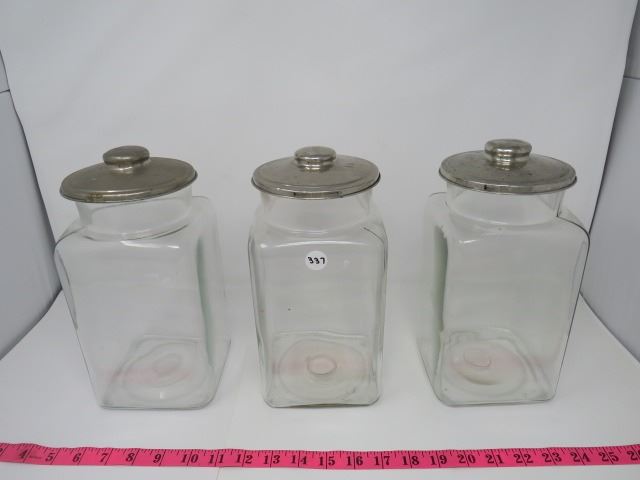 3 AUTHENTIC GLASS CANDY JARS W/NICKEL LIDS