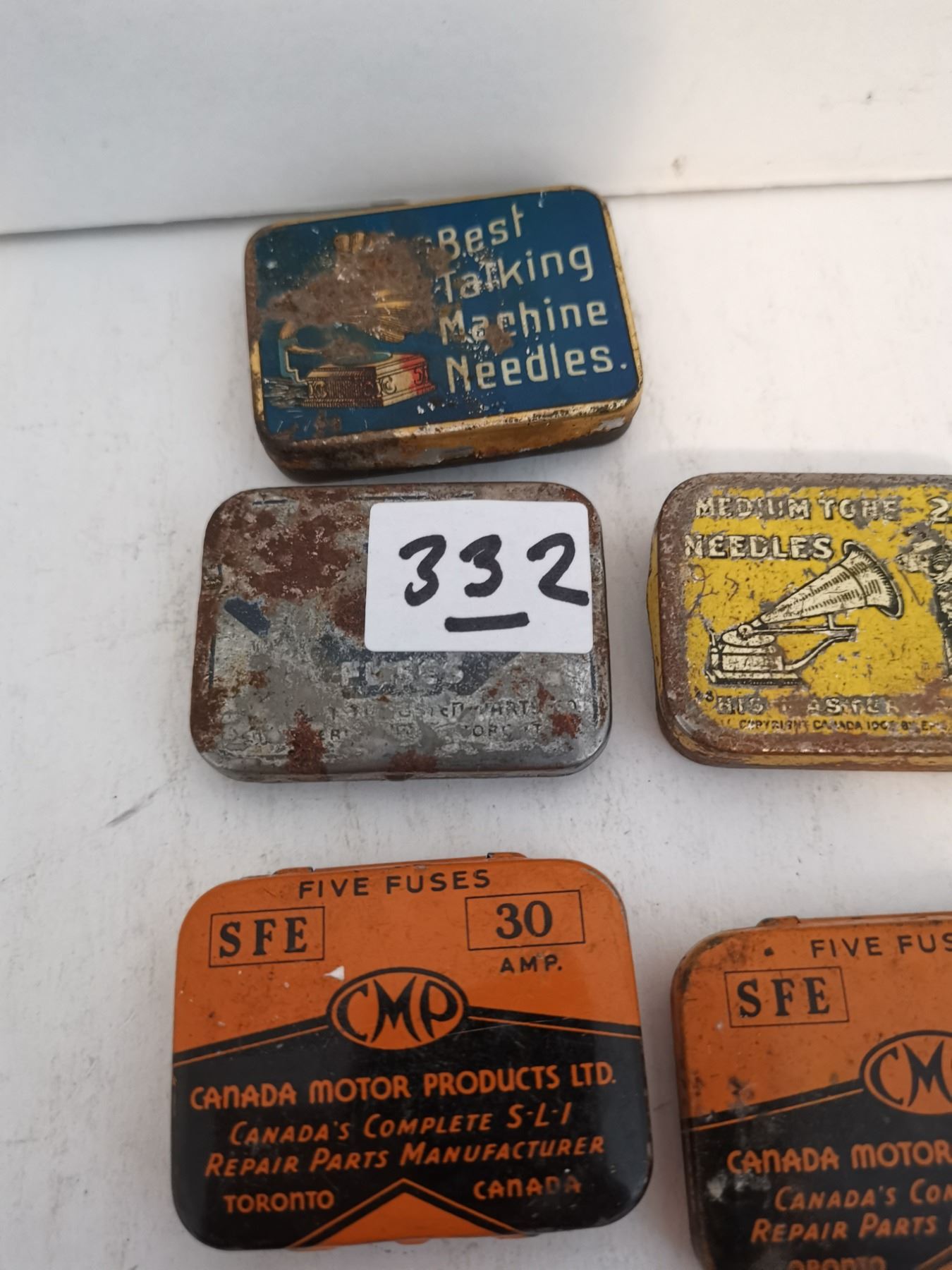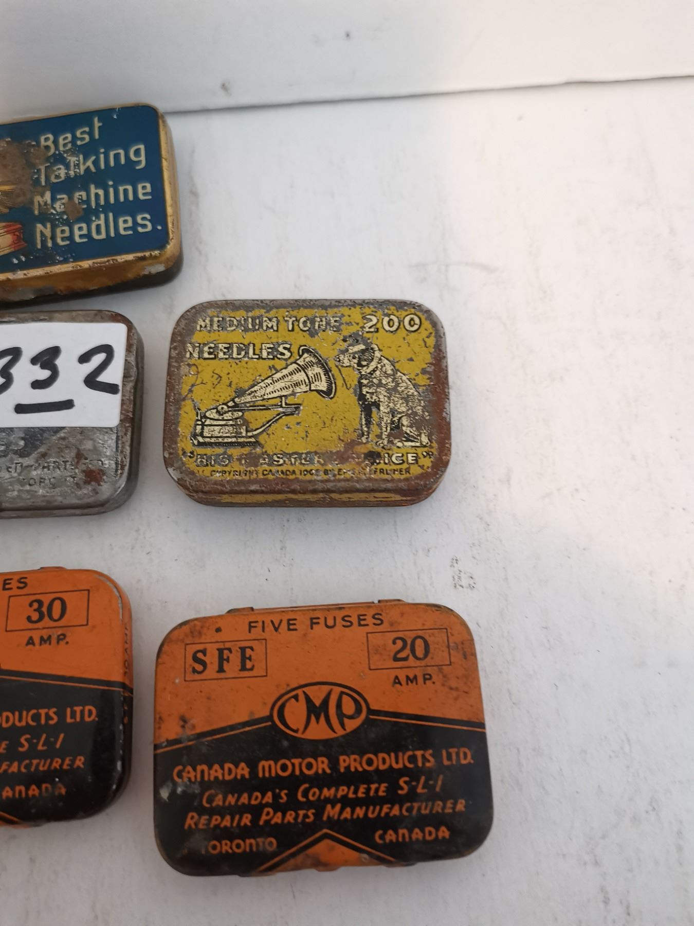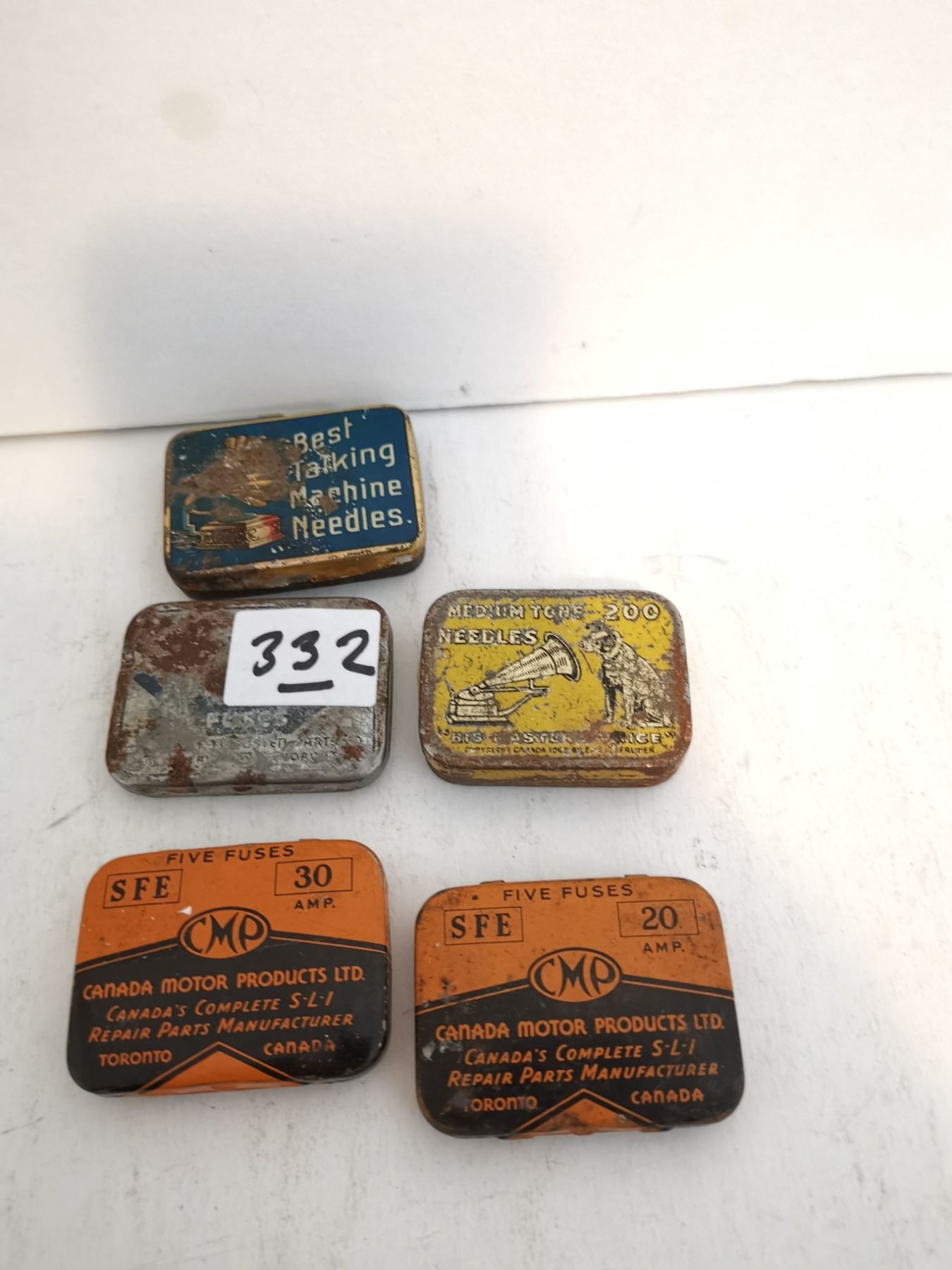 (3) Antique Fuse Tins, (2) Antique Needle Tins