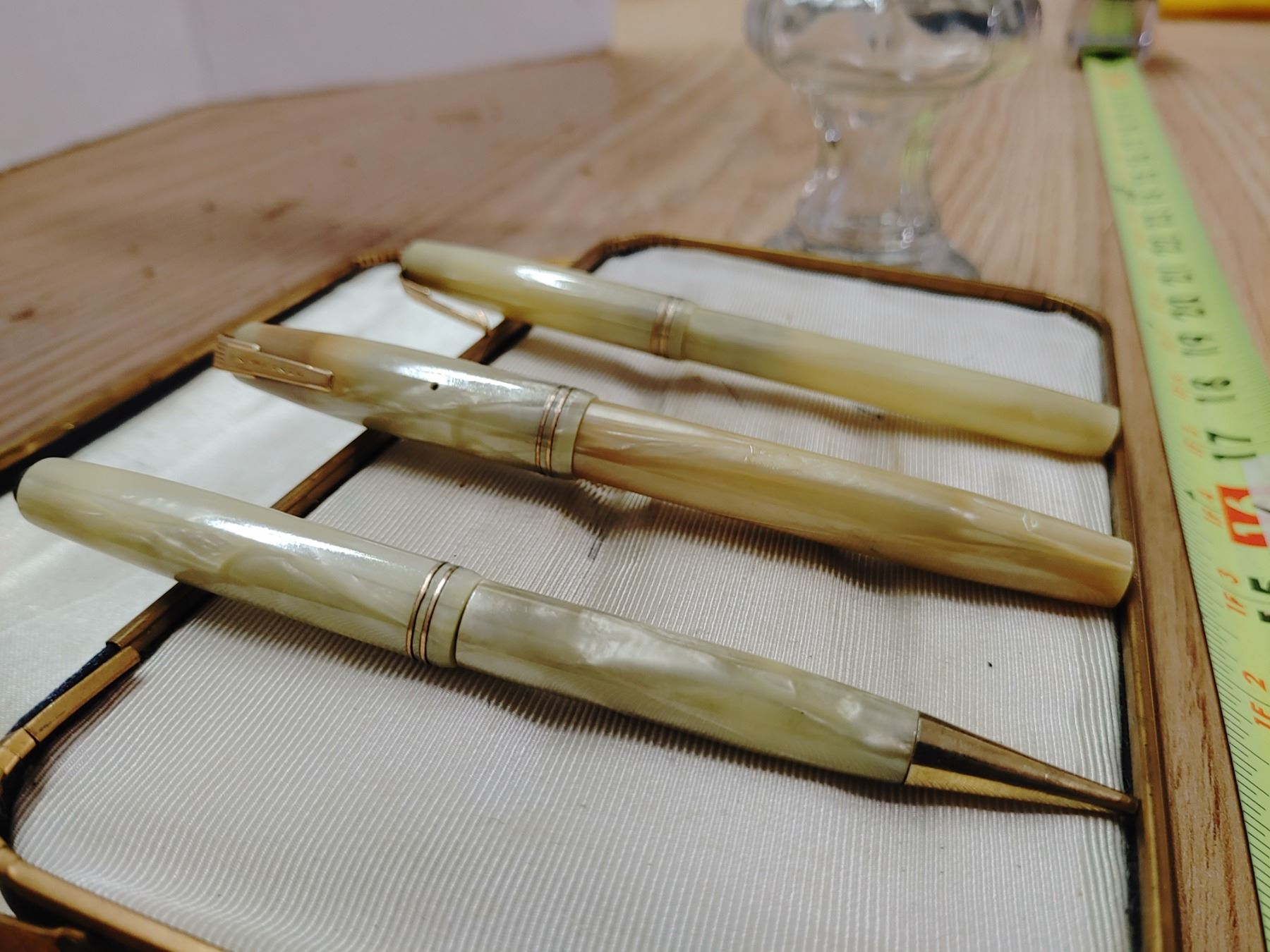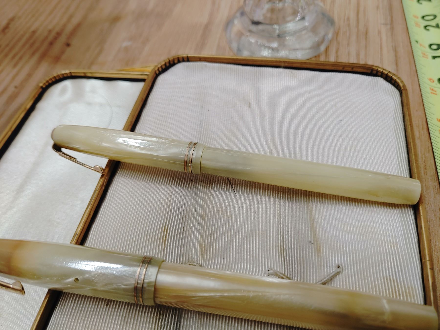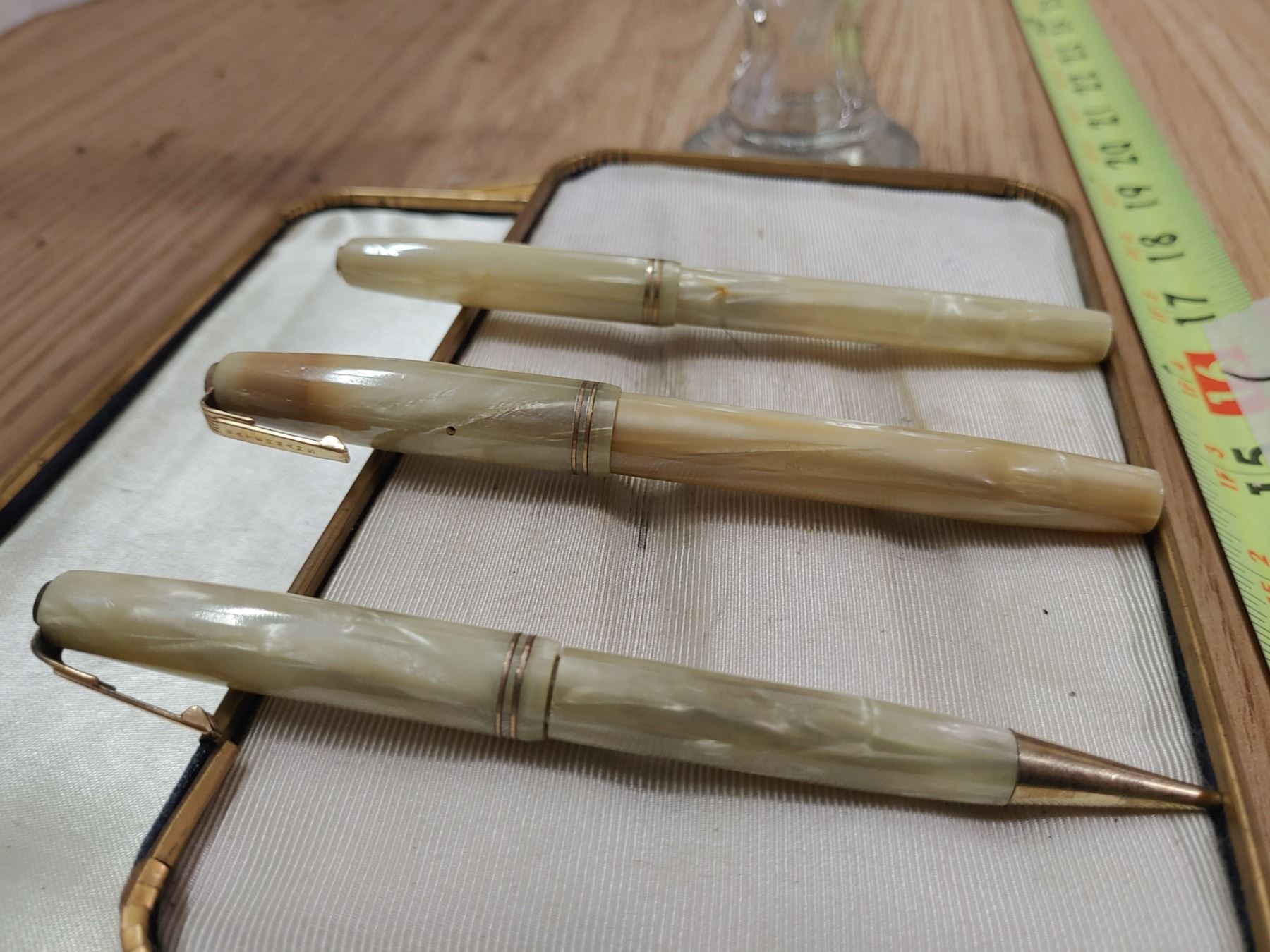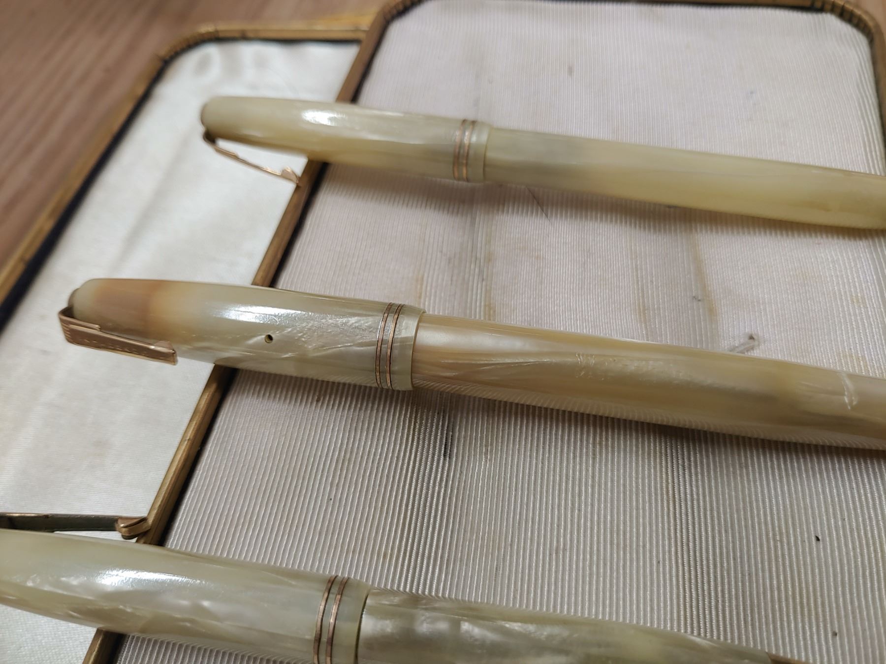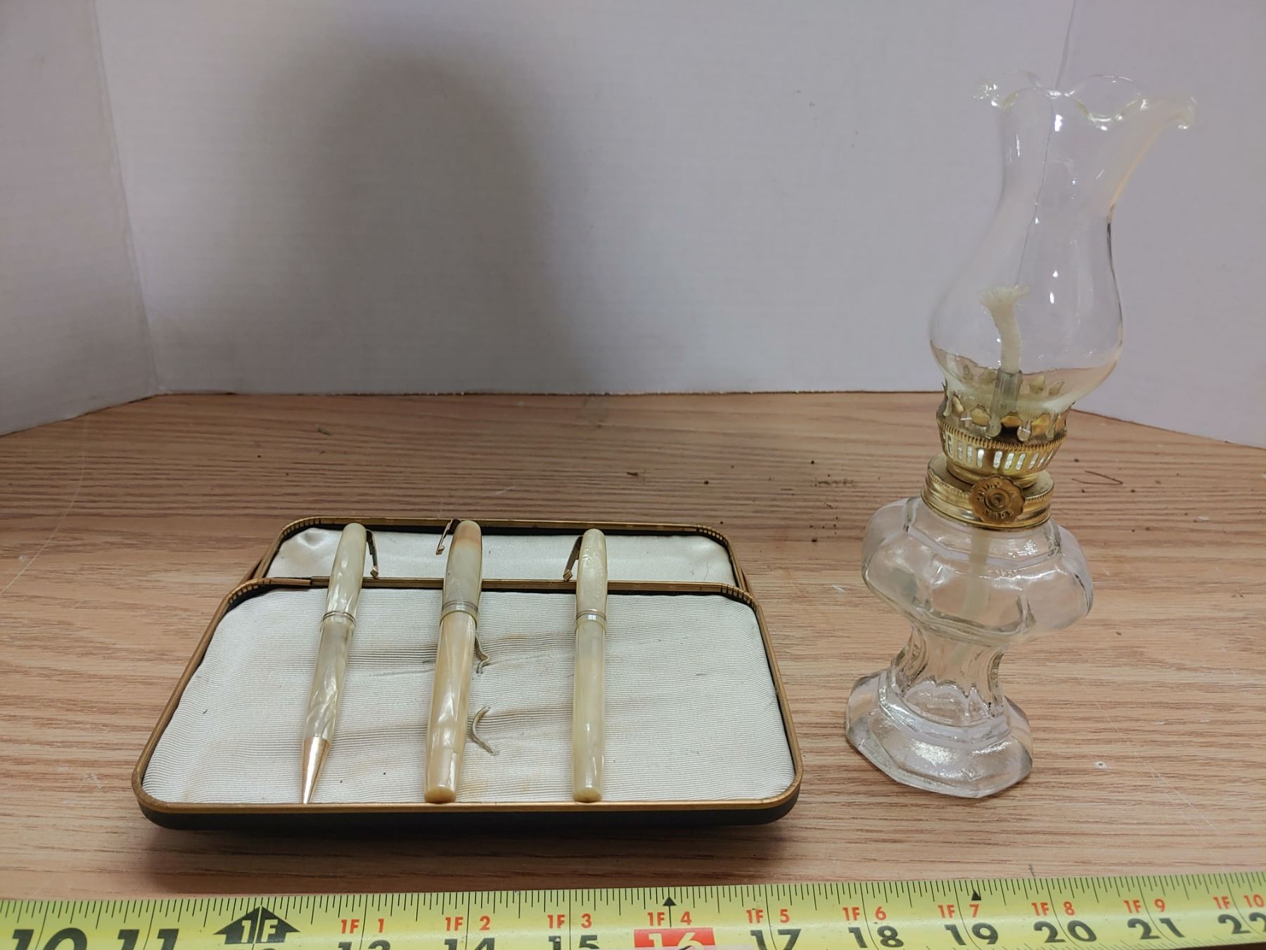 3 Antique Waterman Pens, Mother of Pearl Like, in Case With Small Oil Lamp