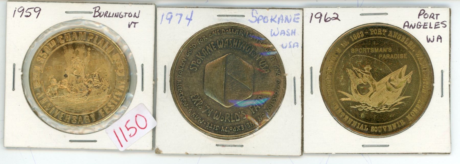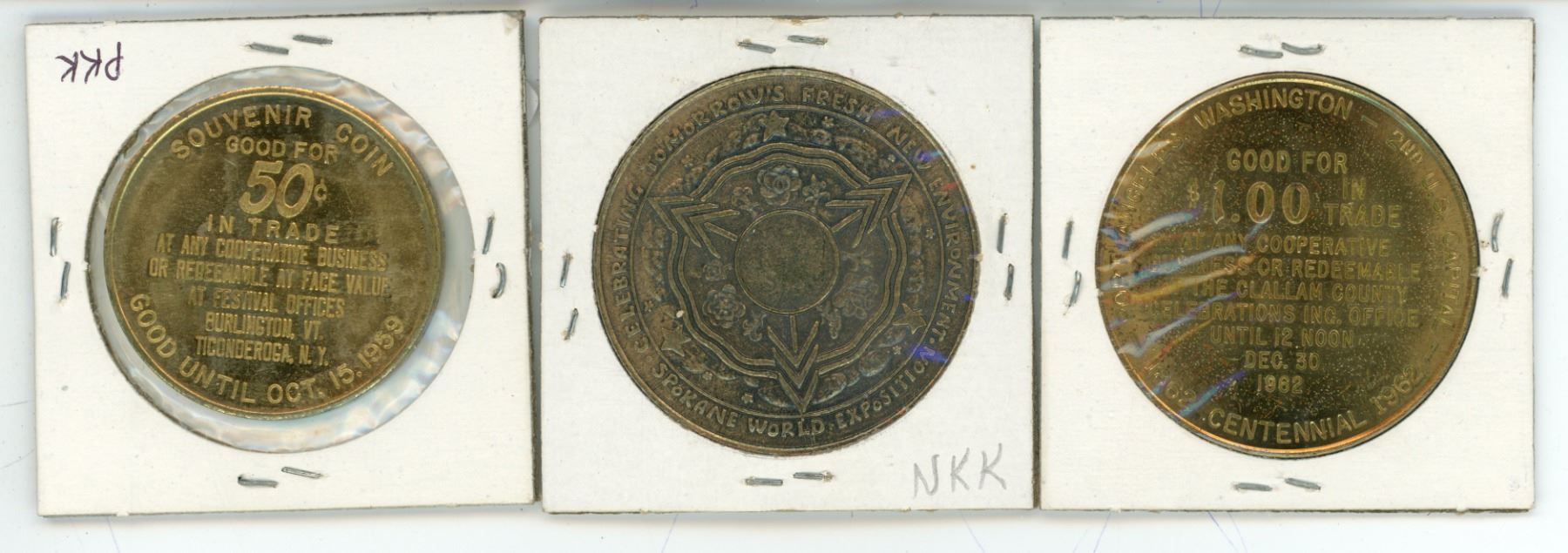 3 Assorted trade dollars/tokens - 1959 Burlington, 1974 Spokane, 1962 Port Angeles