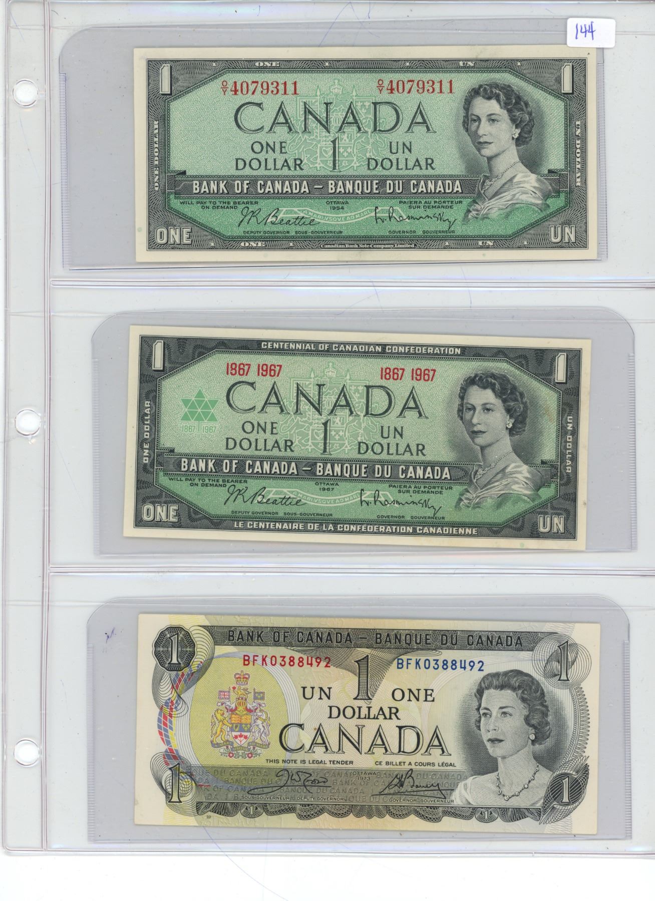 3 CANADIAN 1$ BILLS 1954/1967/1973