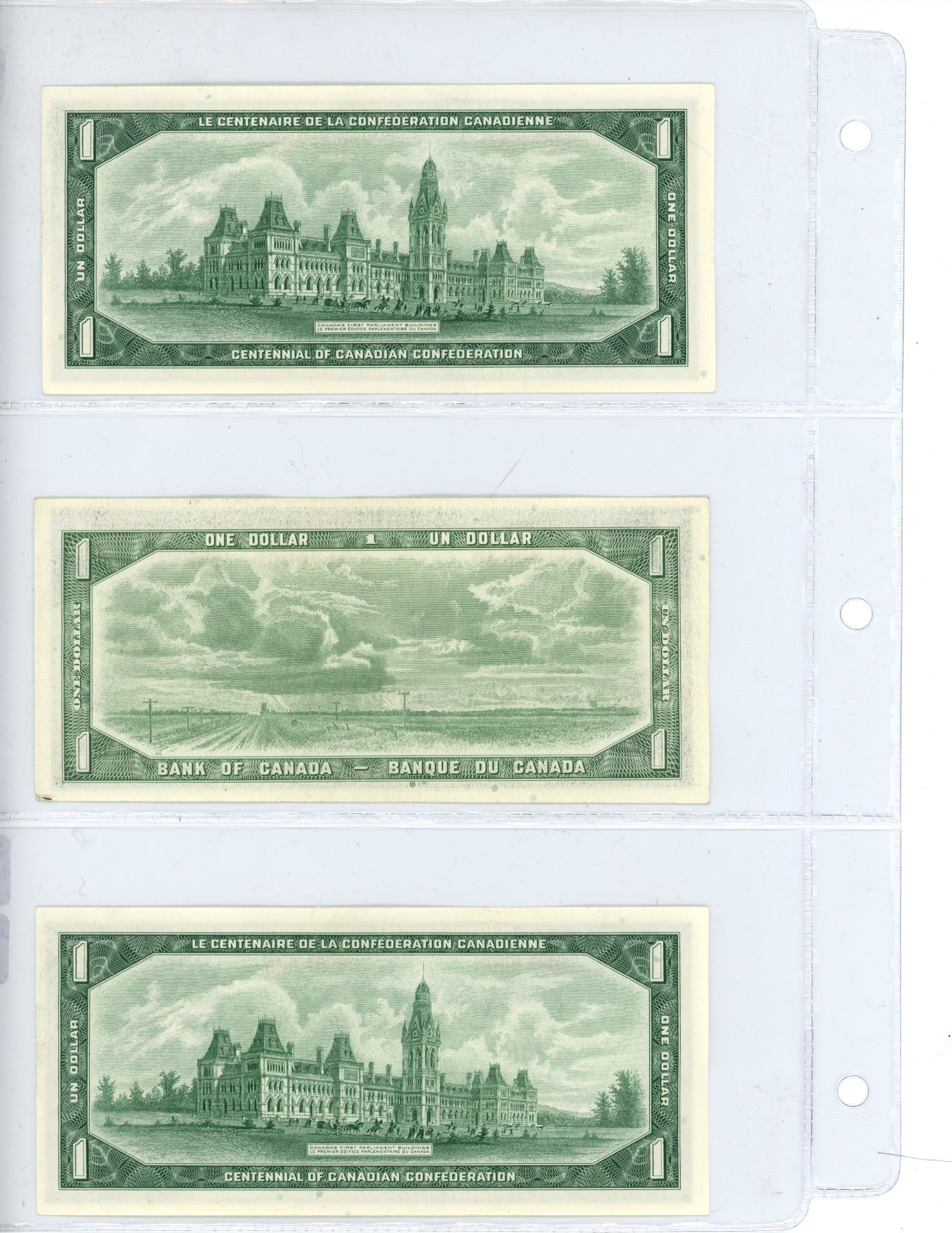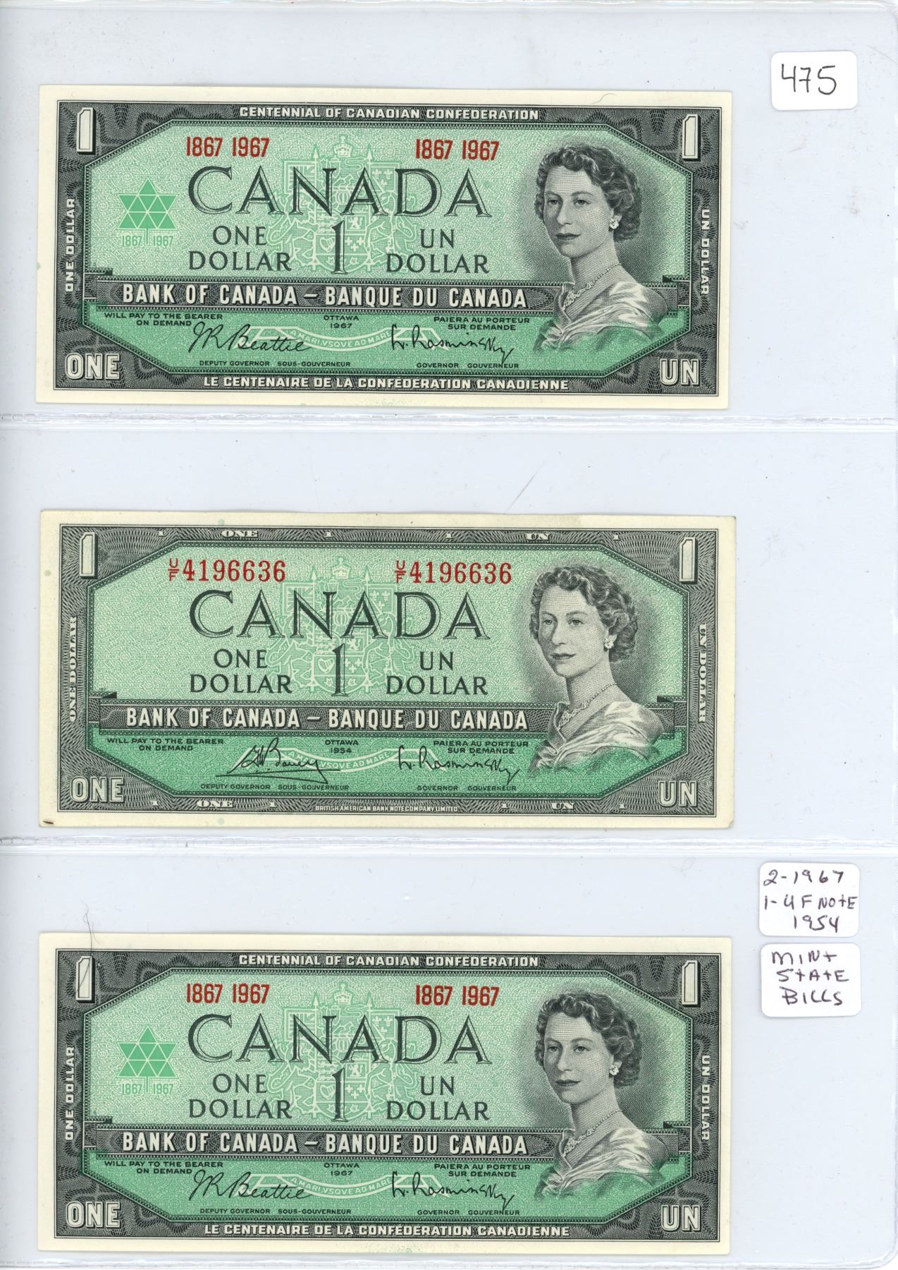 3 Canada one dollar bills - 2 X 1967 1 X UF note 1954 mint state bills