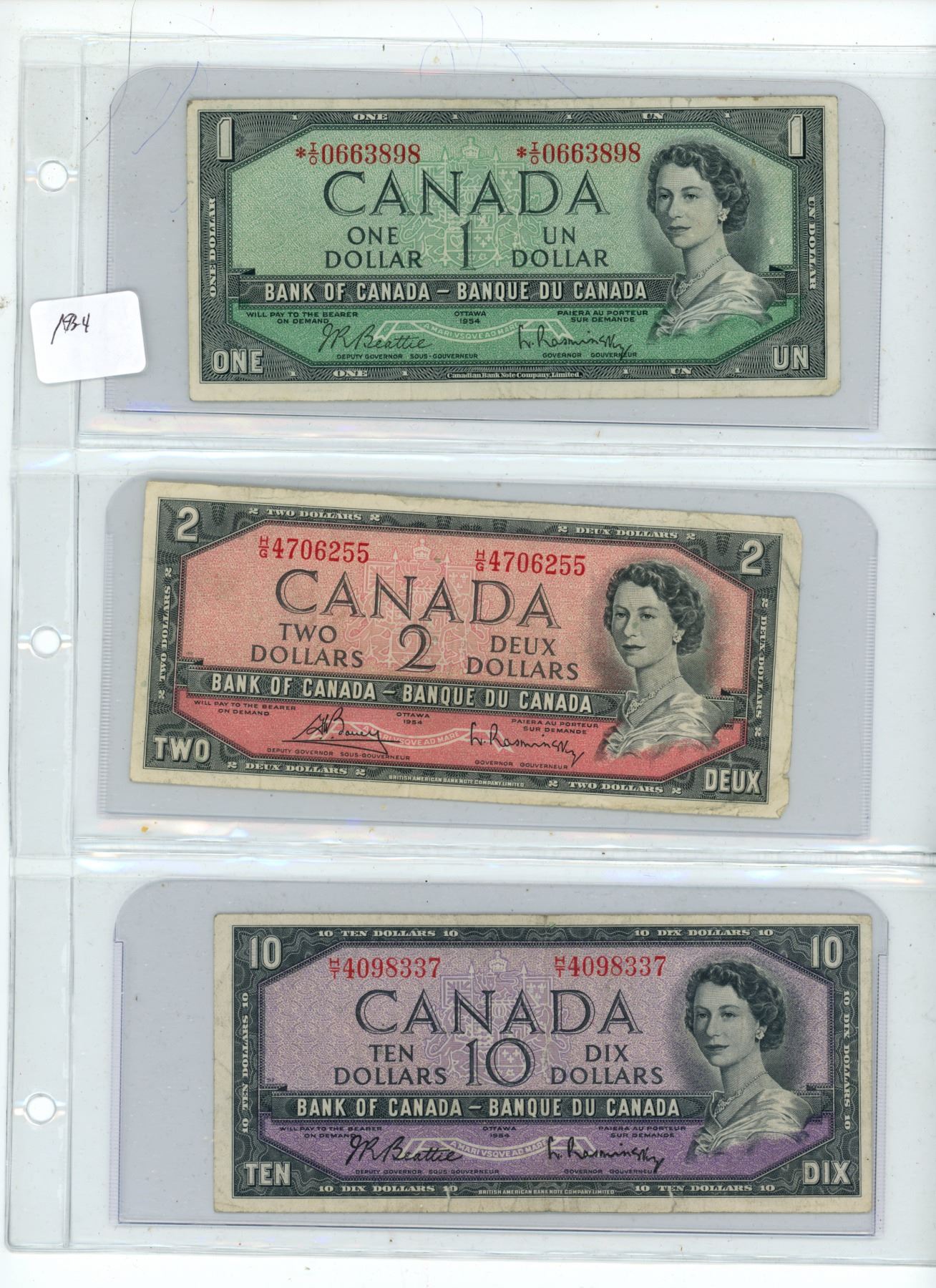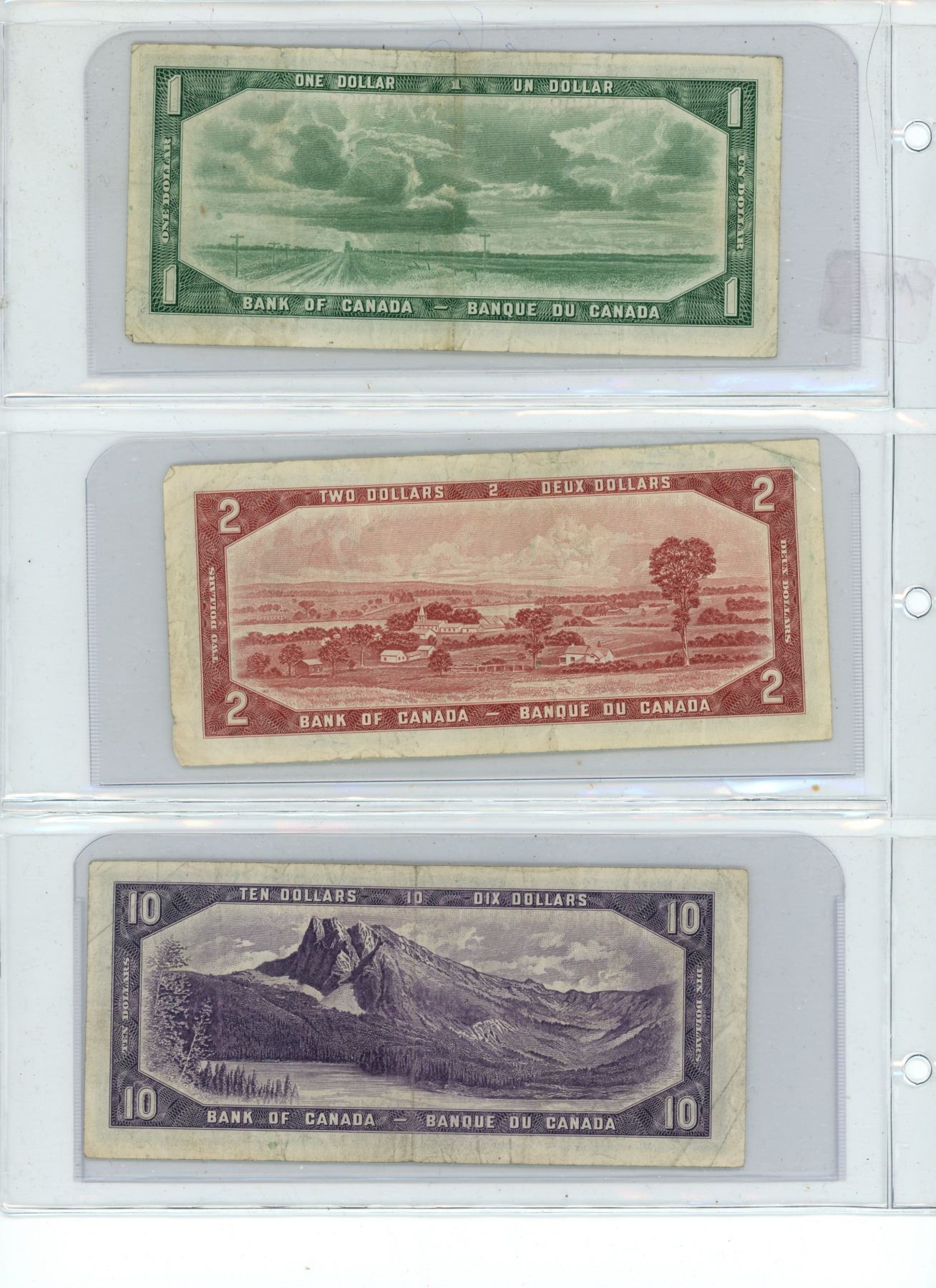 (3) Canadian 1954 Bills (1, 2, and 10 Dollar Bills)