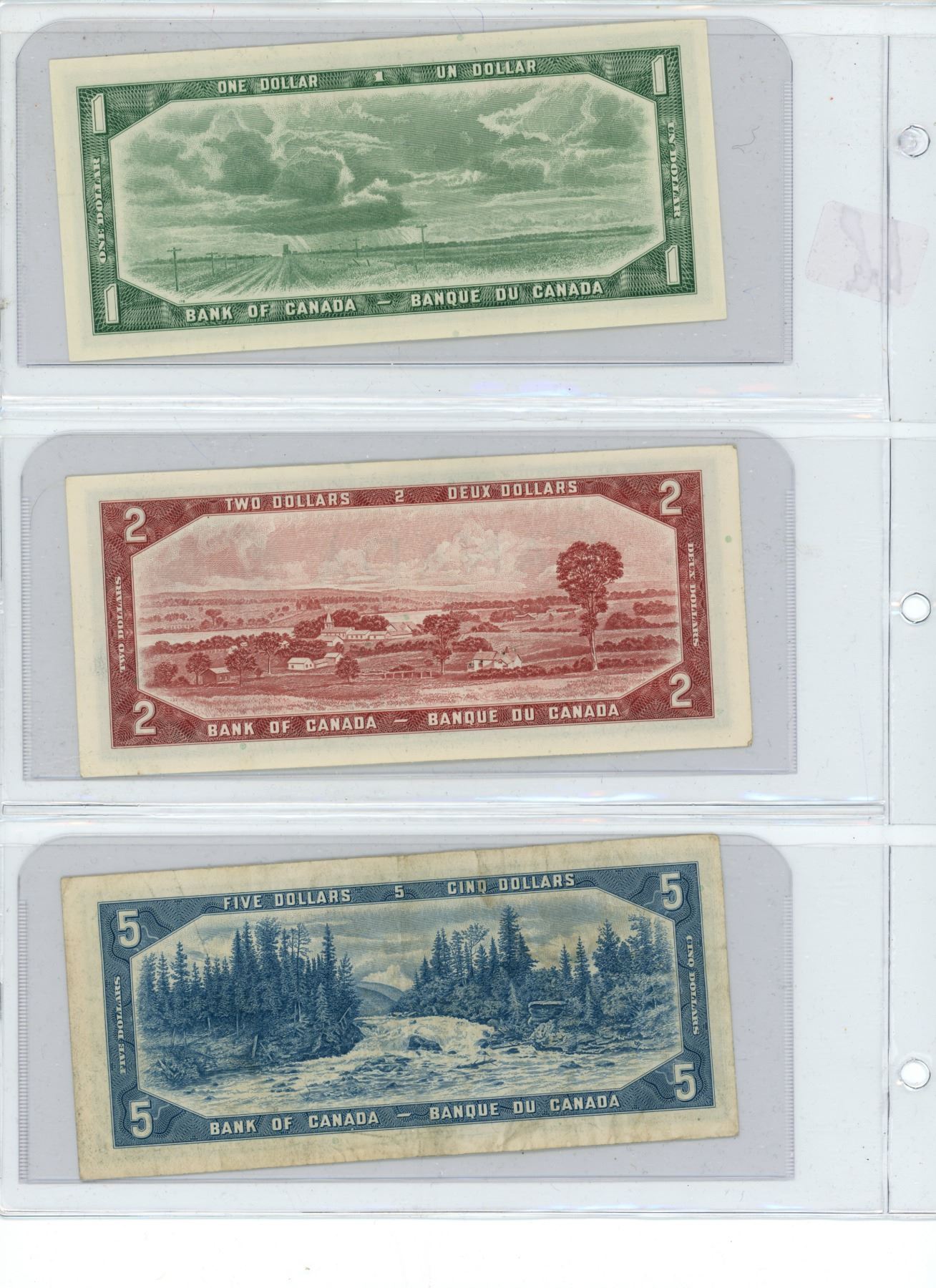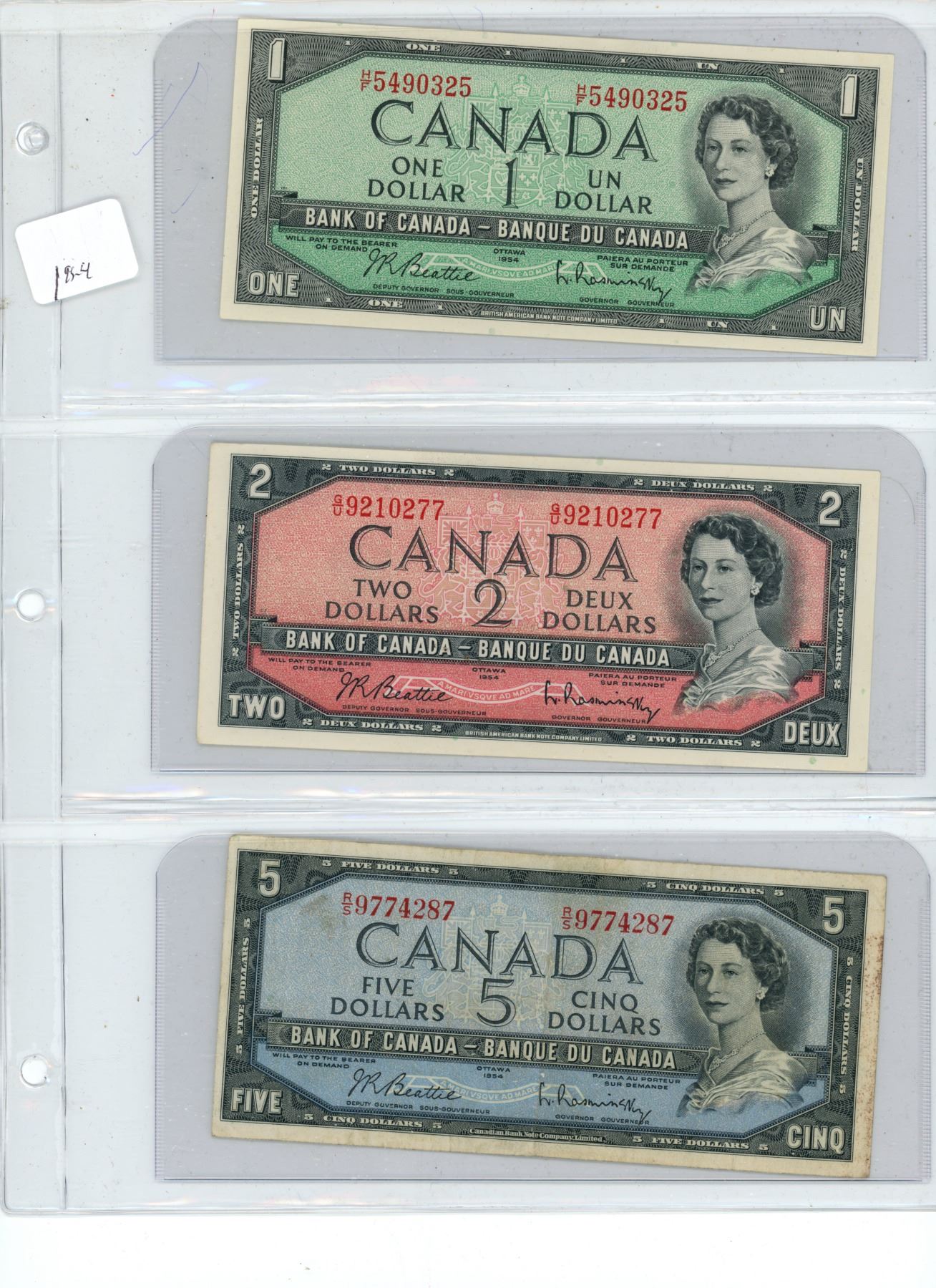(3) Canadian 1954 Bills (1, 2, and 5 Dollar Bills)