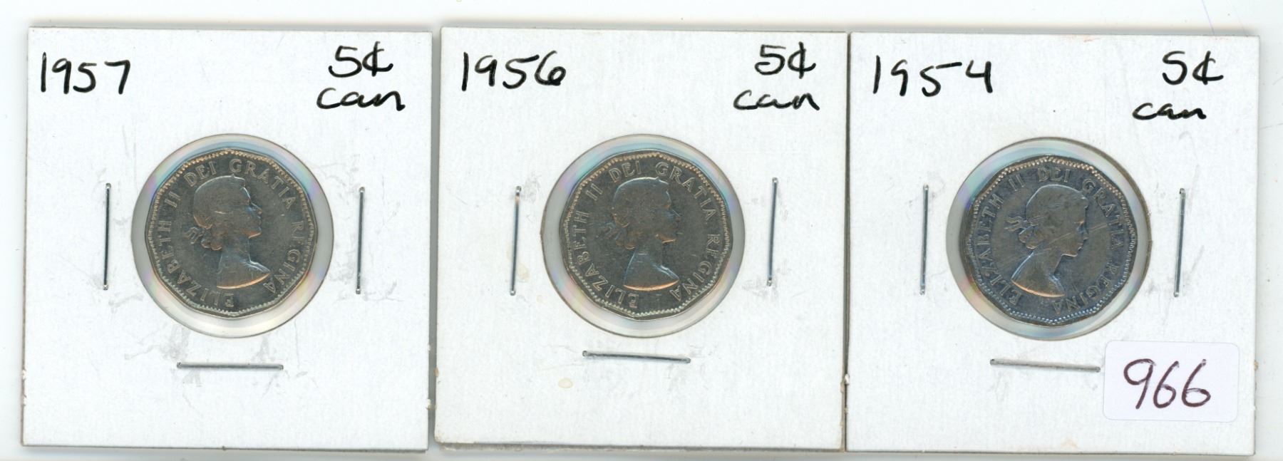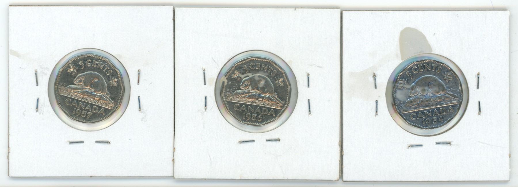 3 Canadian 5 cent coins - 1954, 1956, 1957